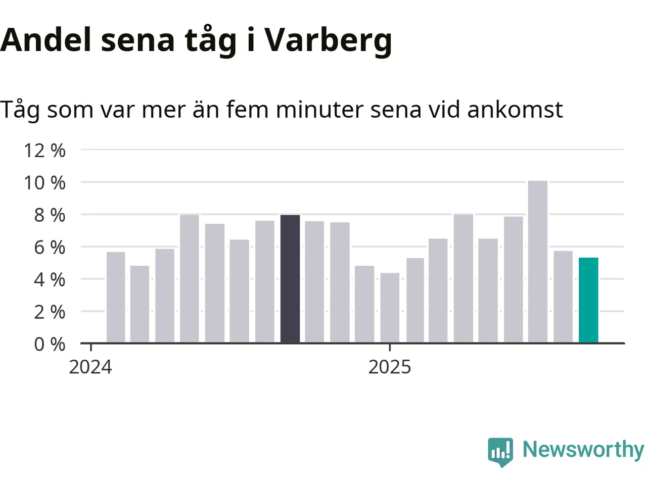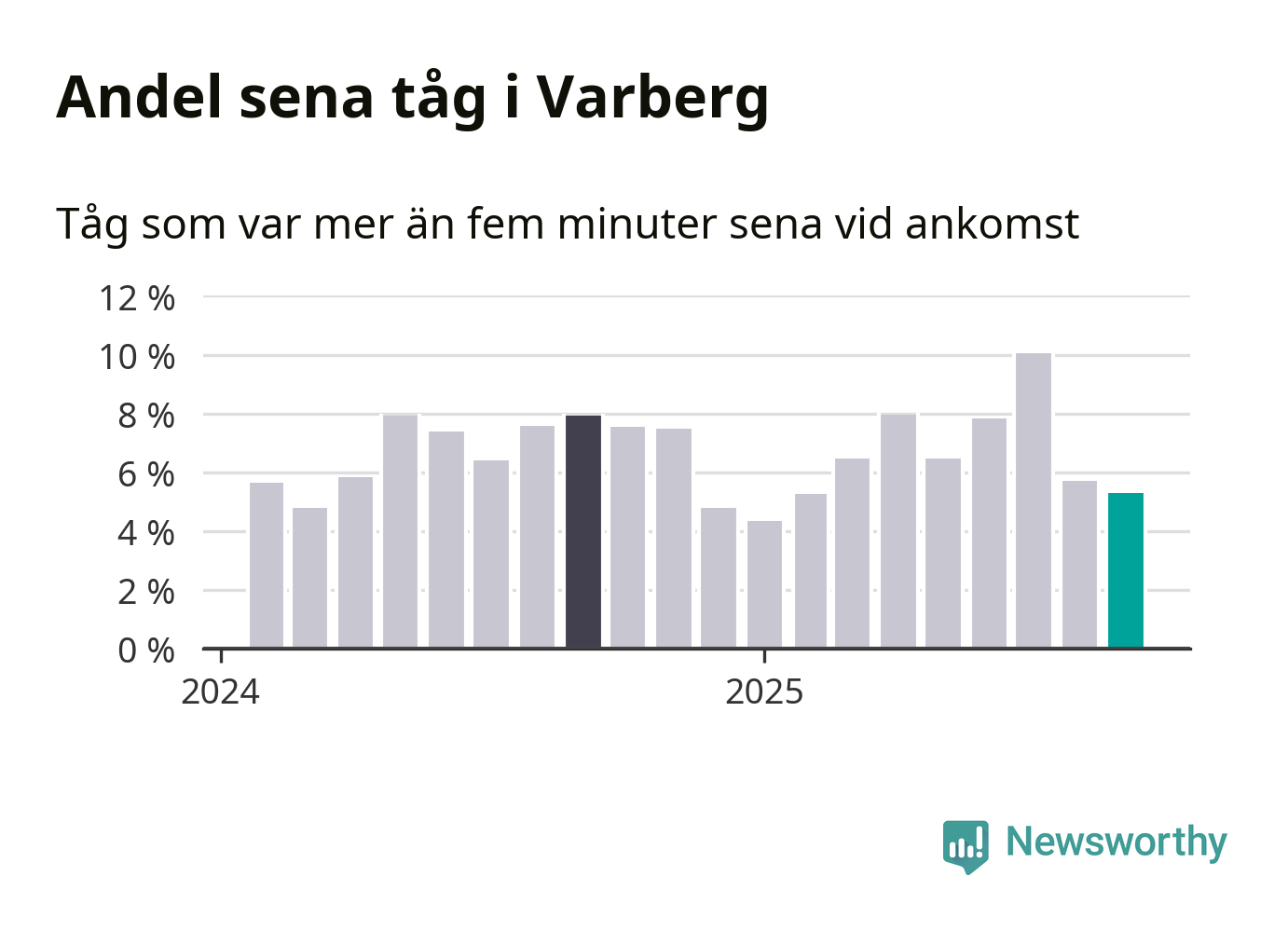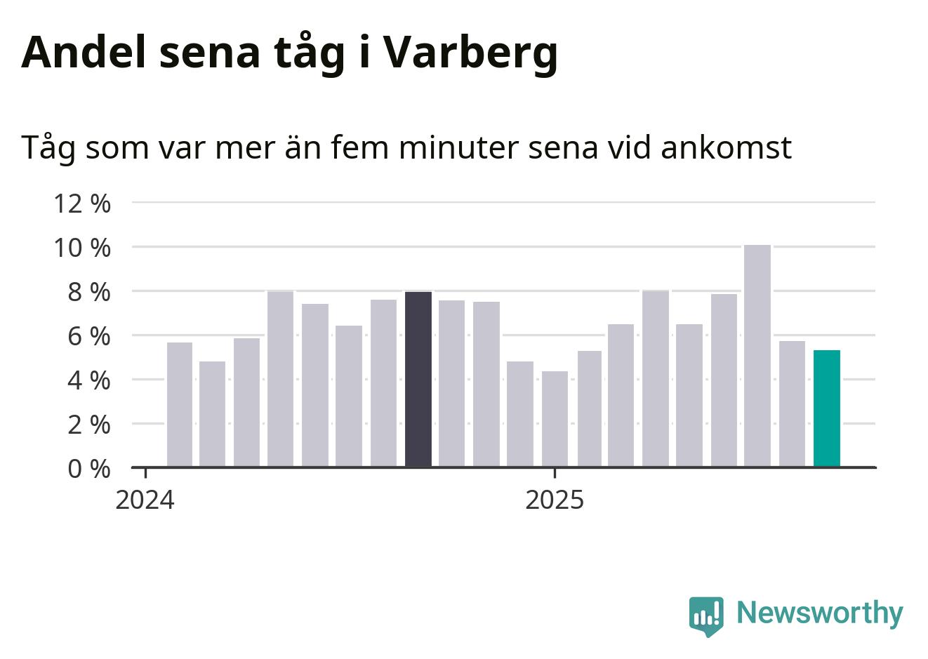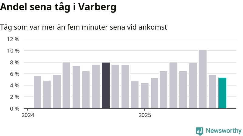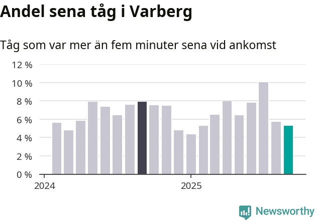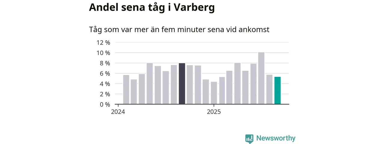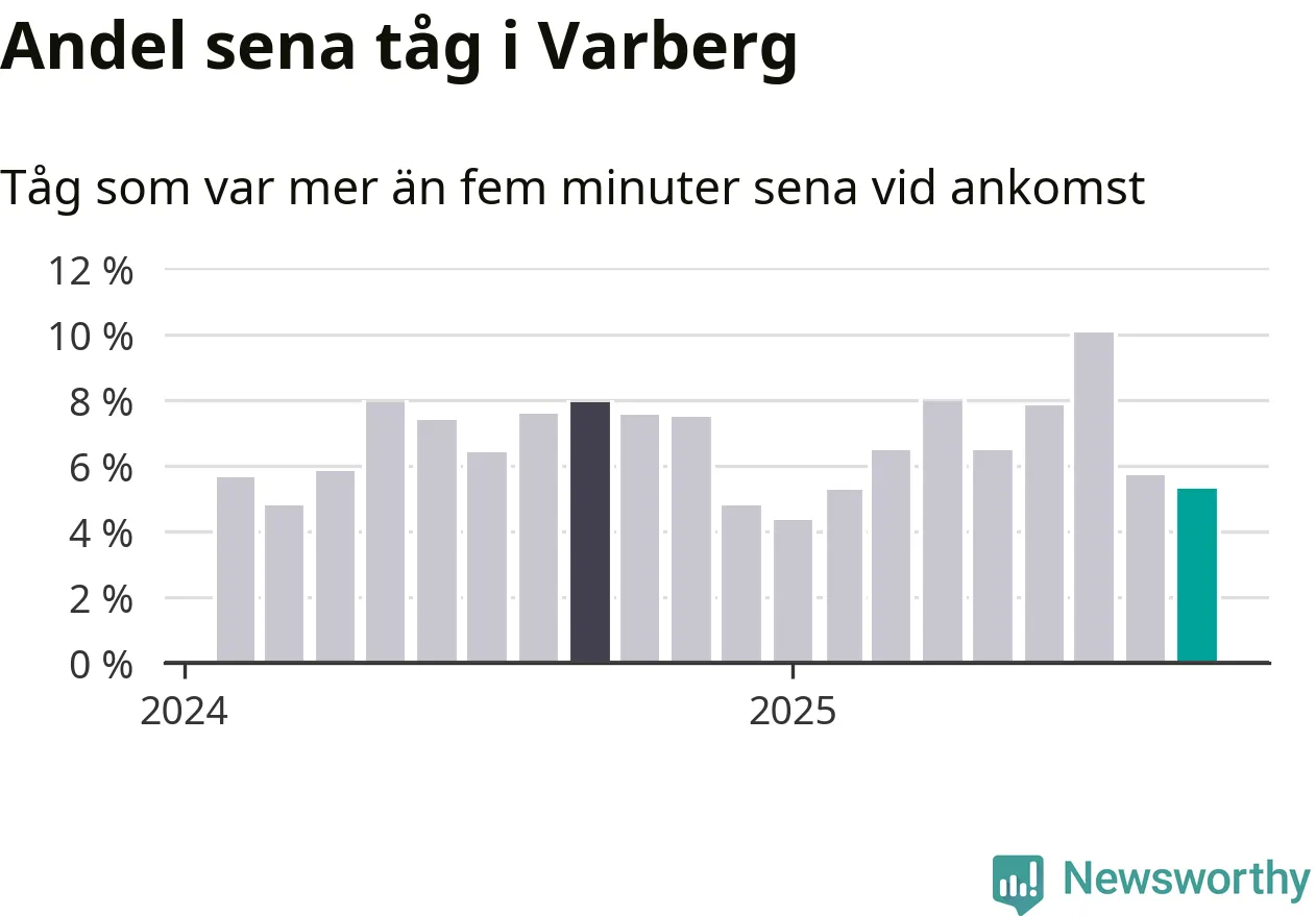 Fem procent kan jämföras med sex procent månaden innan, och åtta procent i september 2024. Siffrorna bygger på realtidsinformation om tågavgångar och ankomster från Trafikverket, som Newsworthy löpande samlar in.