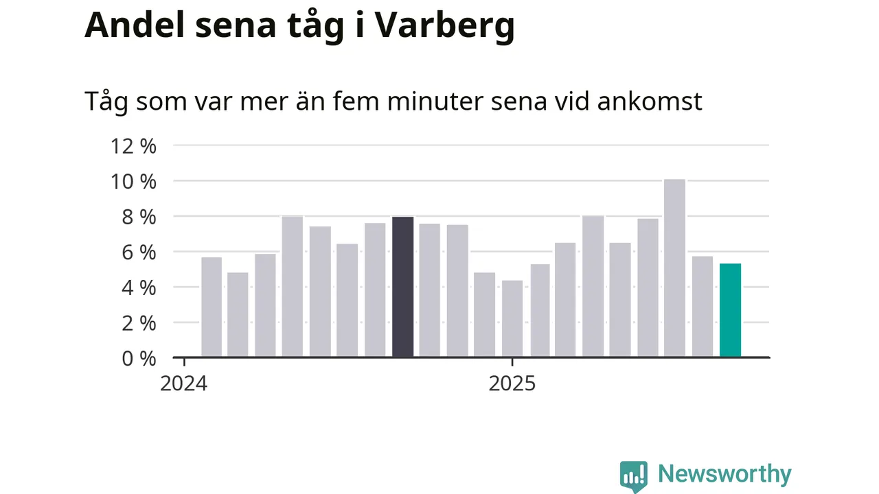 Av omkring 2 300 tåg som passerade Varberg eller Veddige i september var 120 mer än fem minuter sena. Det motsvarar 5 procent.