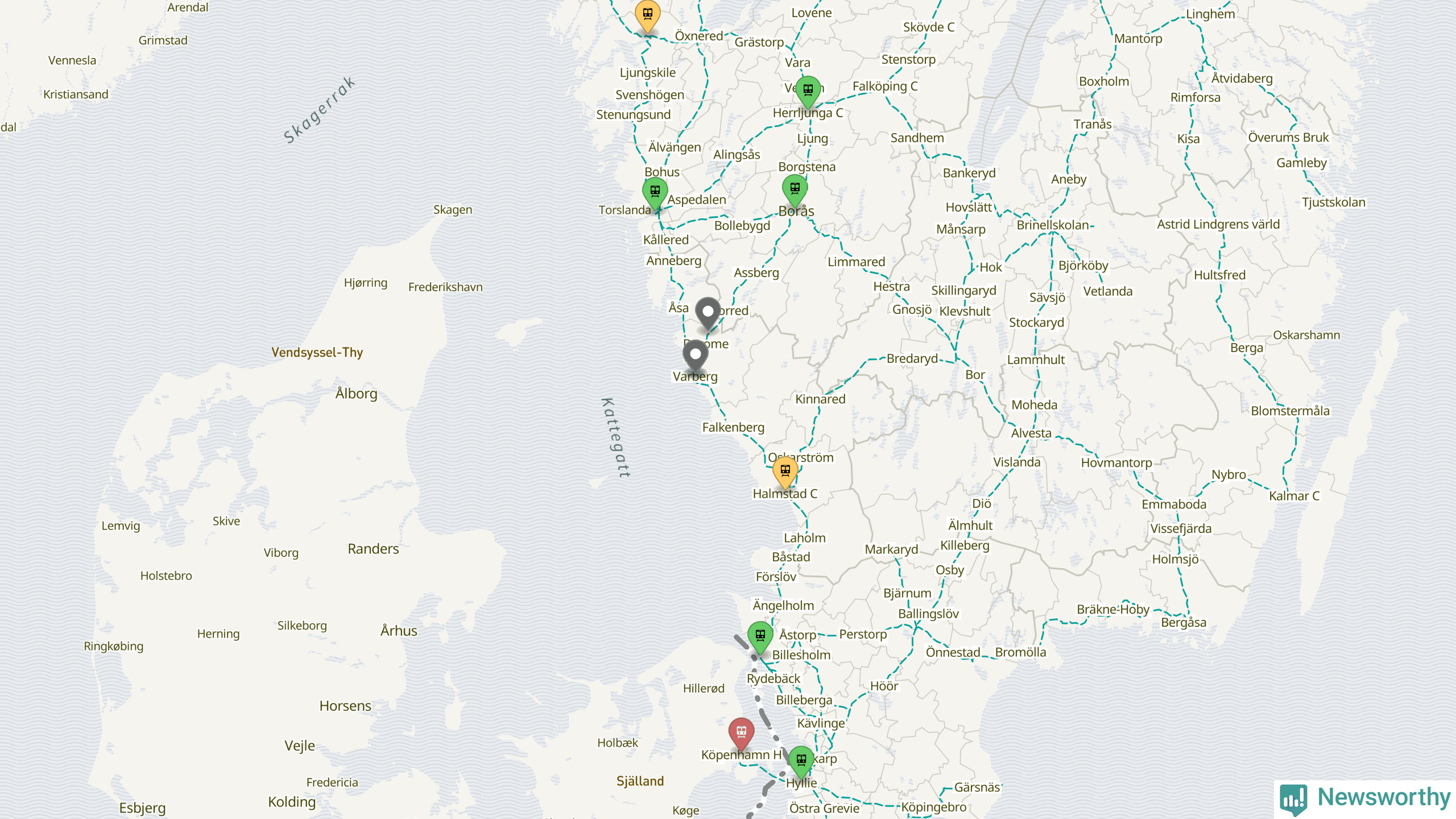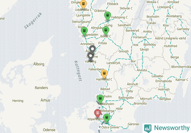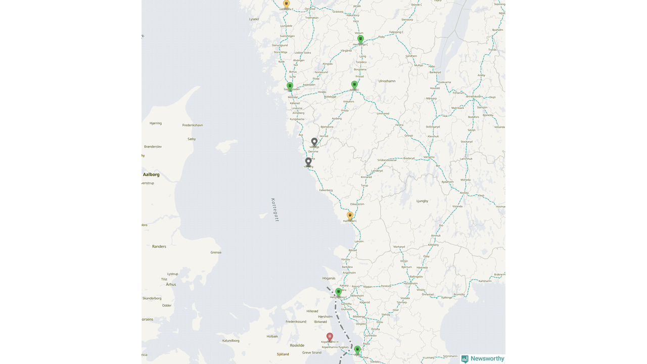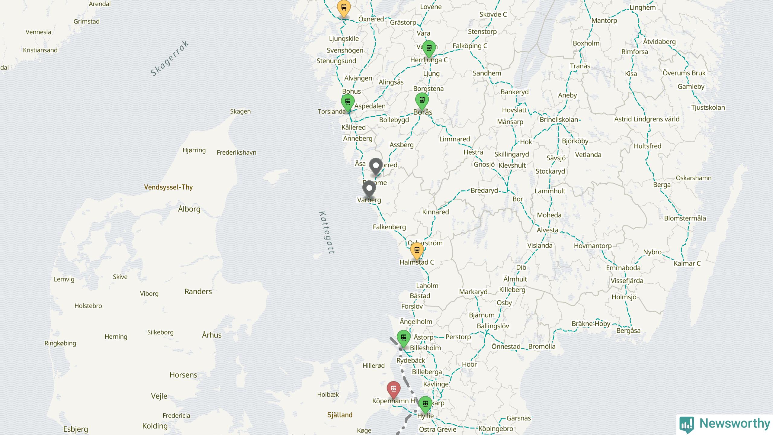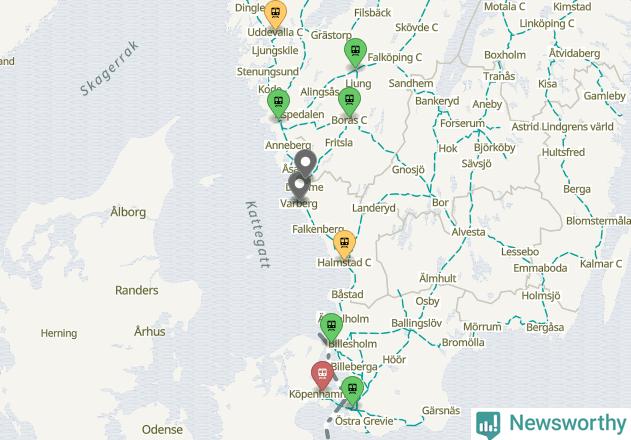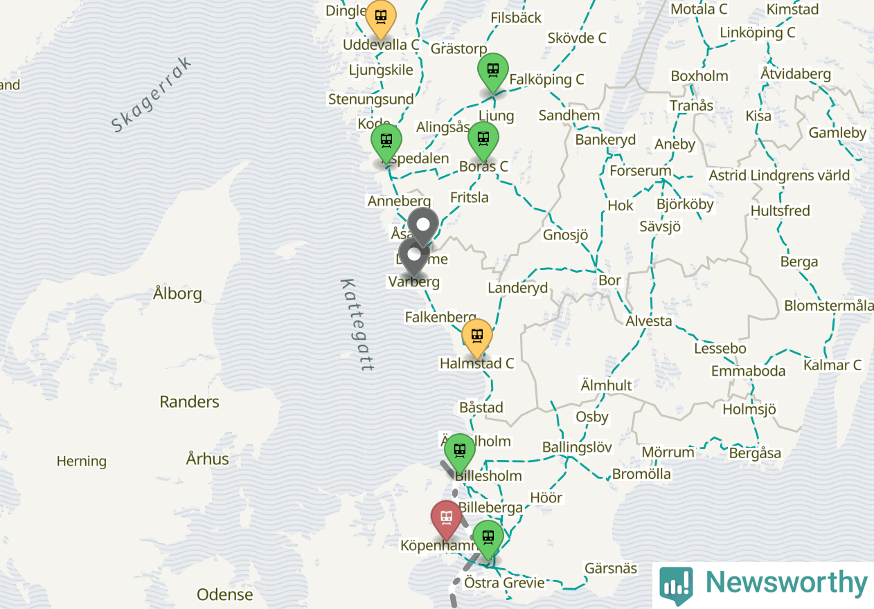 Kartdata från Mapbox, Newsworthy, OpenStreetMap och Trafikverket. Uppgifter om sträckor med passagerartrafik från jarnvag.net.