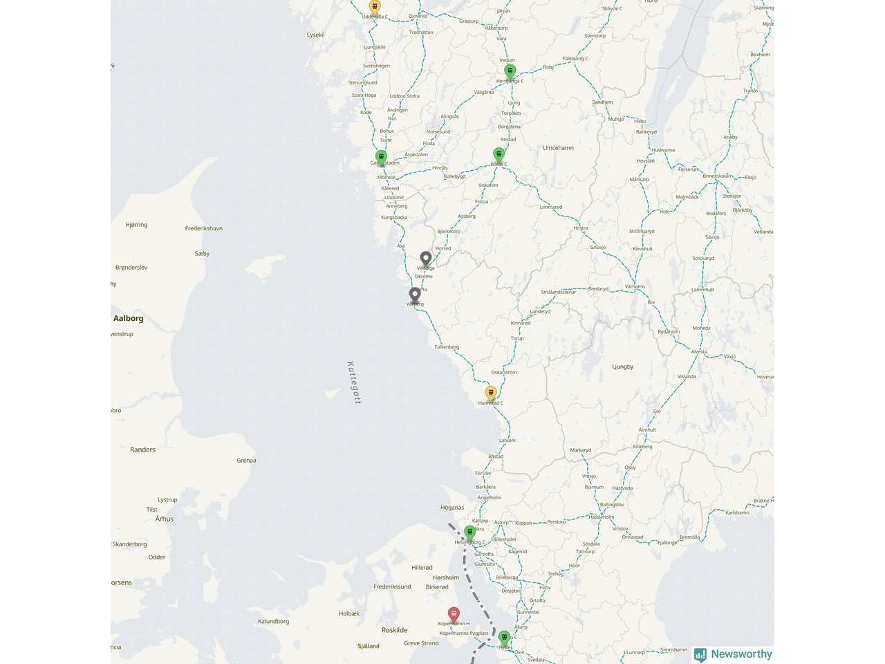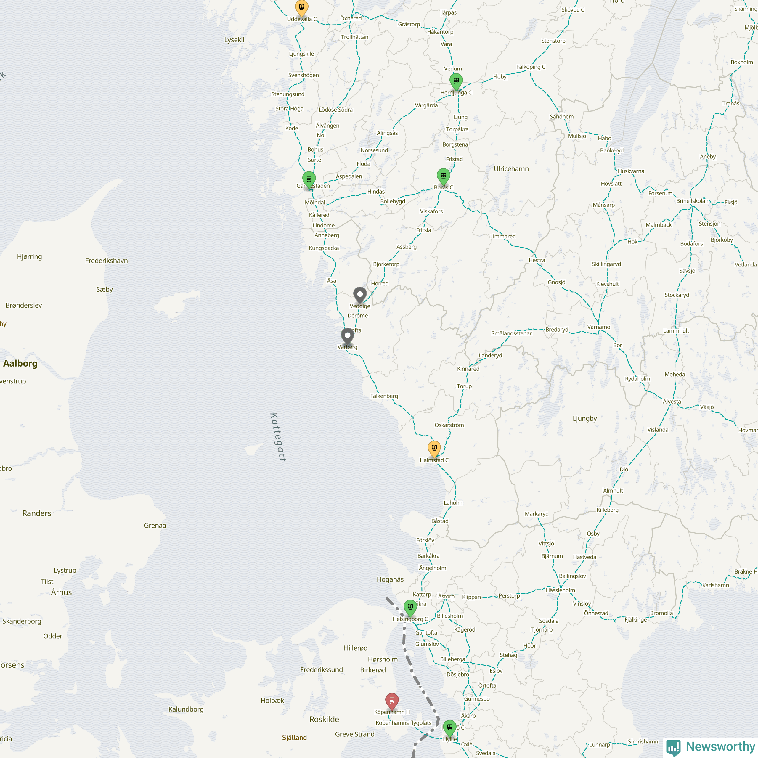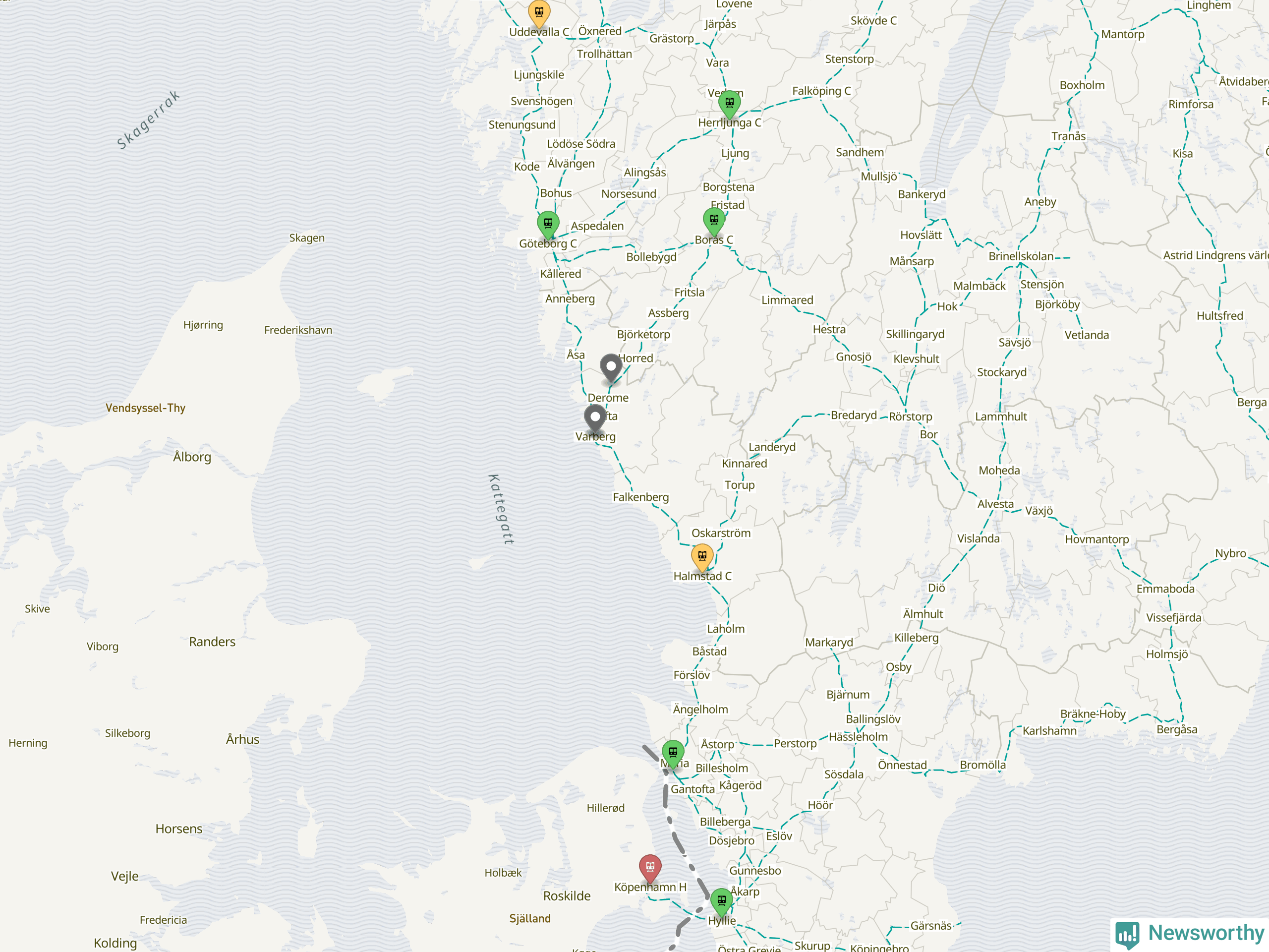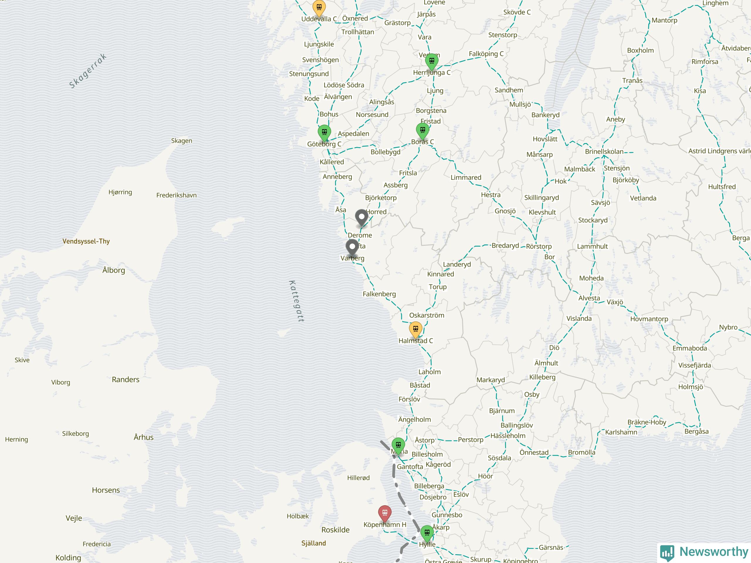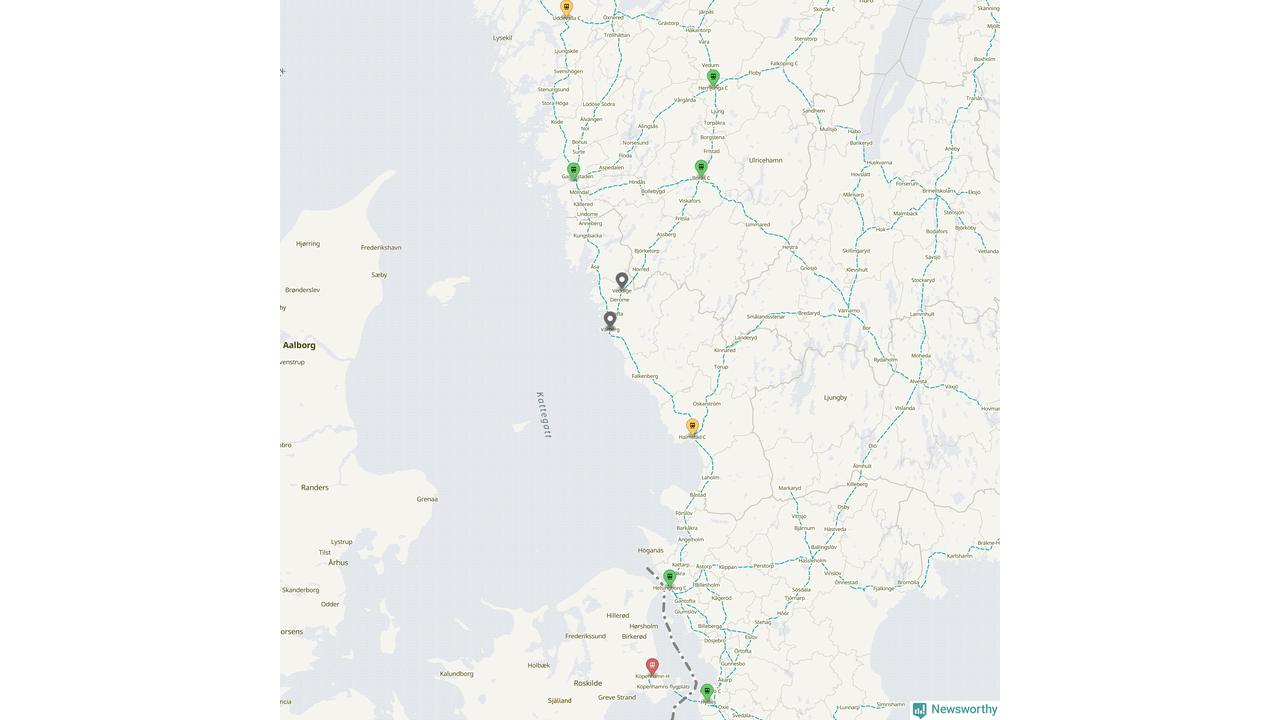 Kartdata från Mapbox, Newsworthy, OpenStreetMap och Trafikverket. Uppgifter om sträckor med passagerartrafik från jarnvag.net.