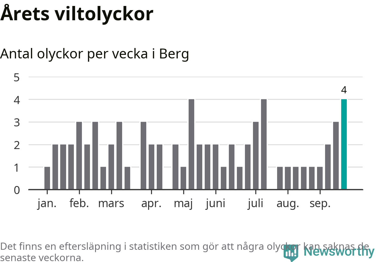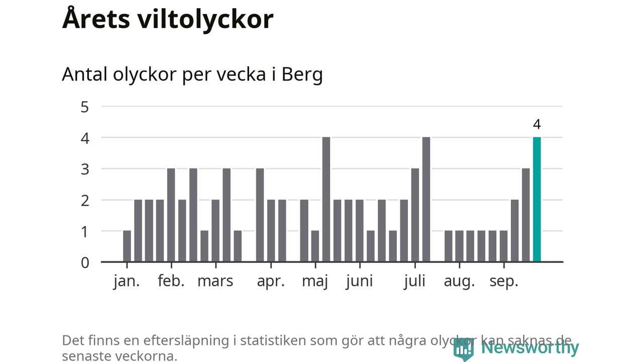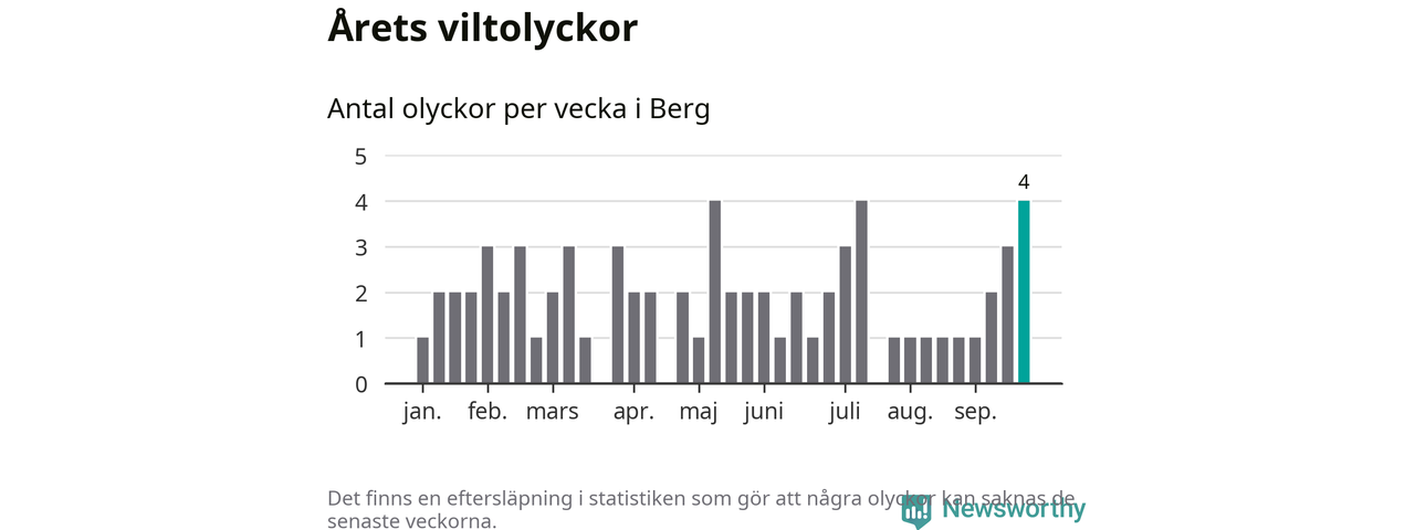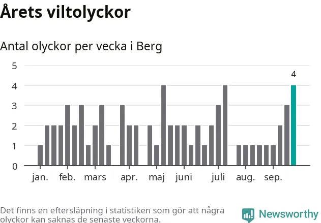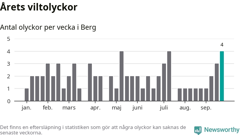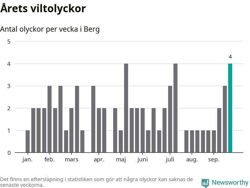 Hittills har fyra viltolyckor rapporterats in i Bergs kommun från vecka 39. Se listan här.