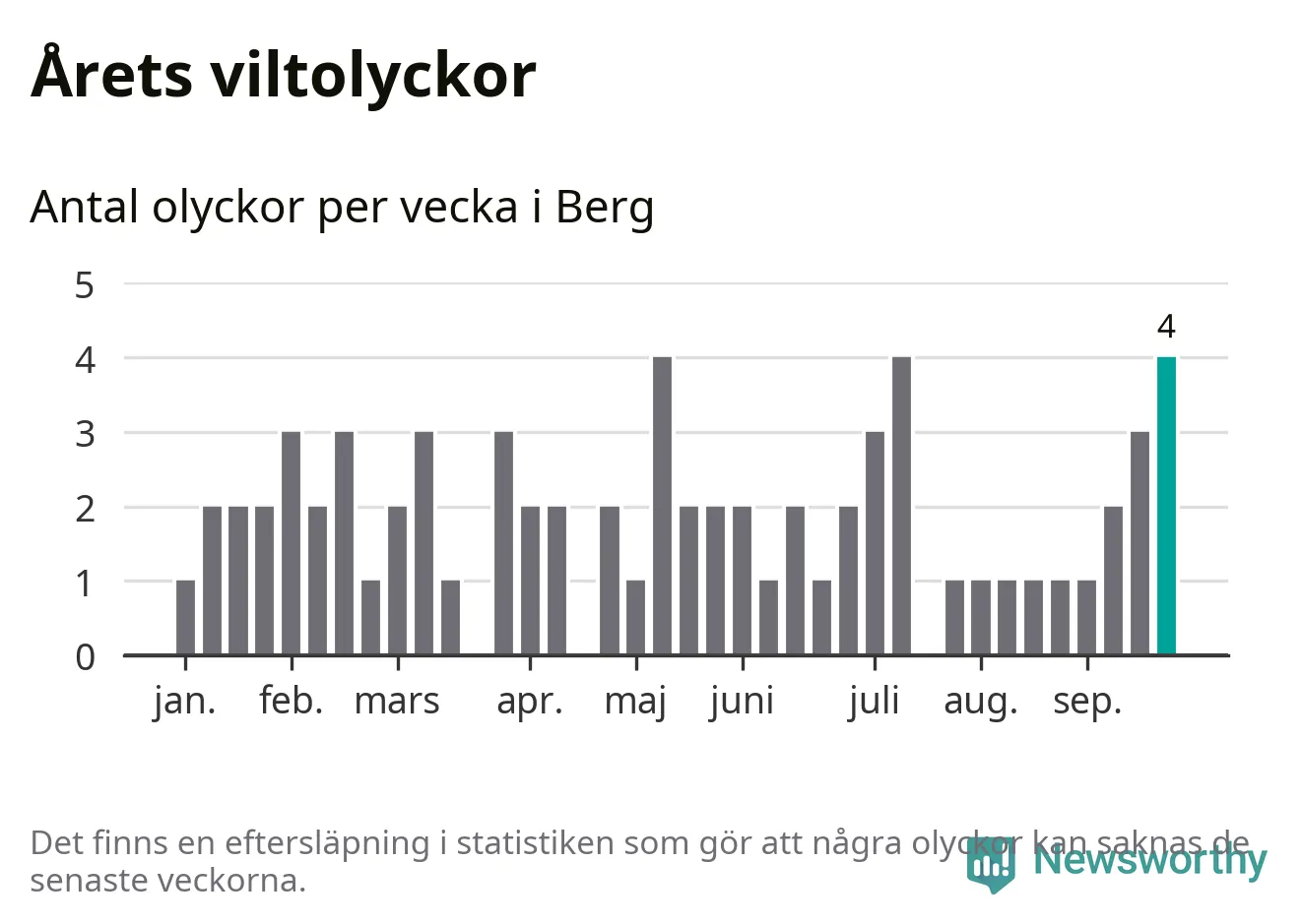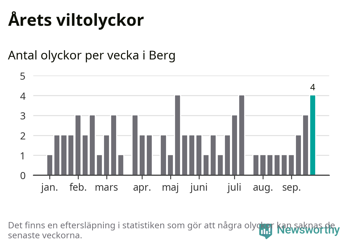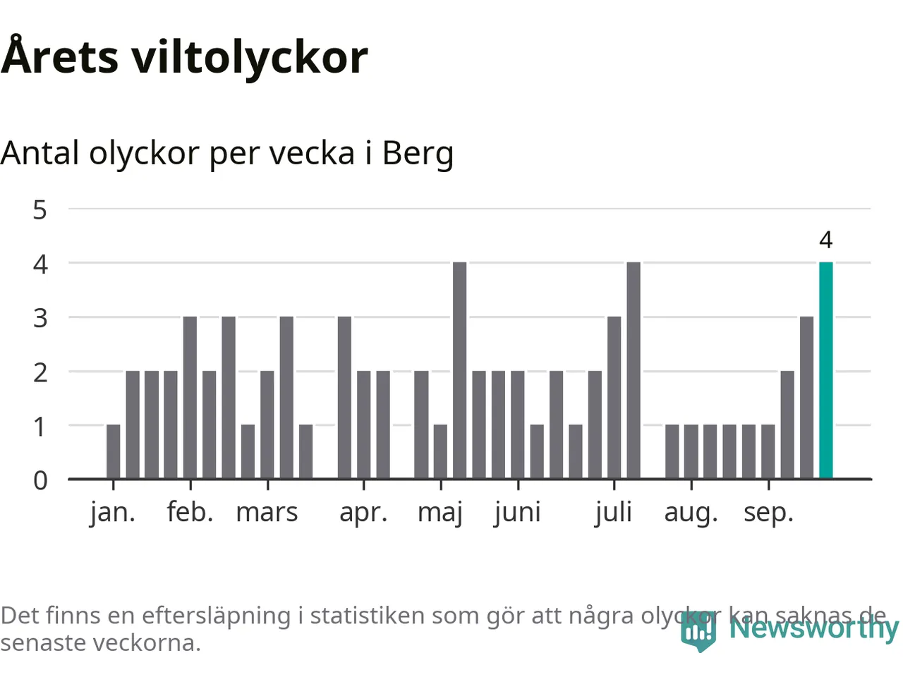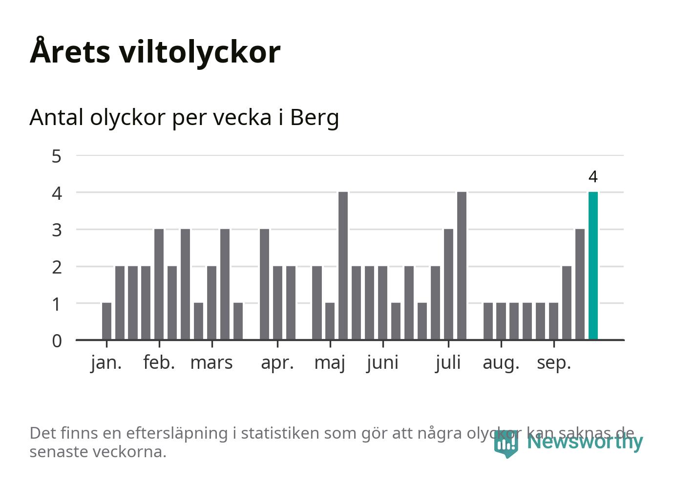 Hittills har fyra viltolyckor rapporterats in i Bergs kommun från vecka 39. Se listan här.