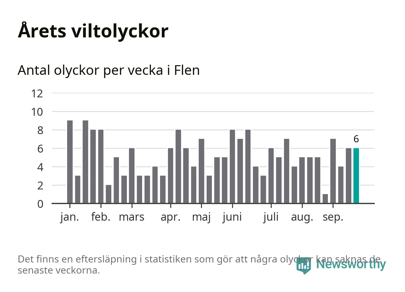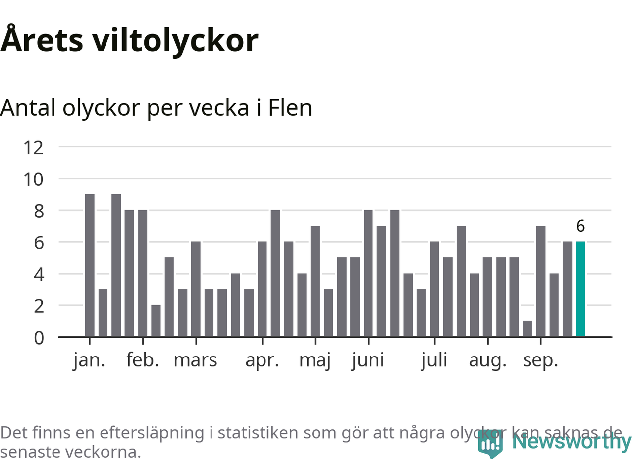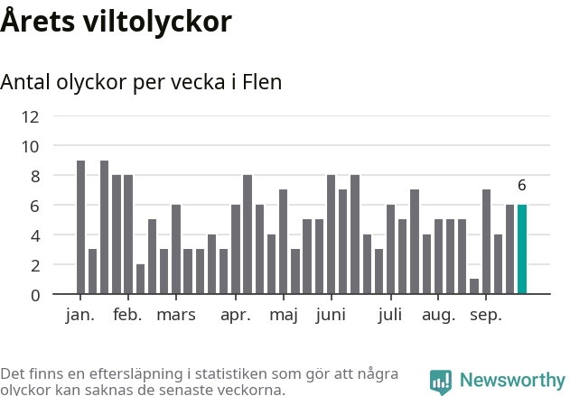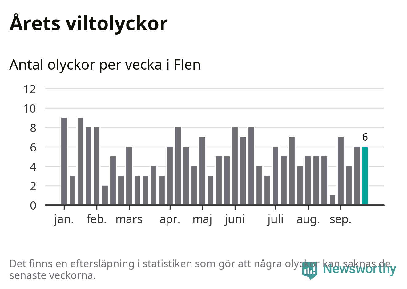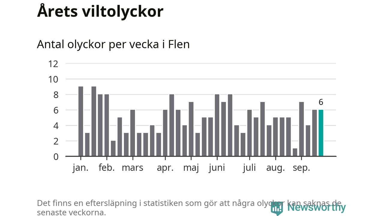 Hittills har sex viltolyckor rapporterats in i Flens kommun från vecka 39. Se listan här.