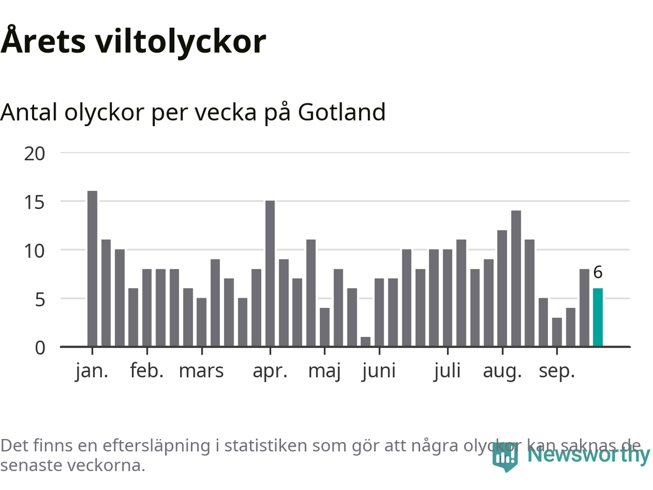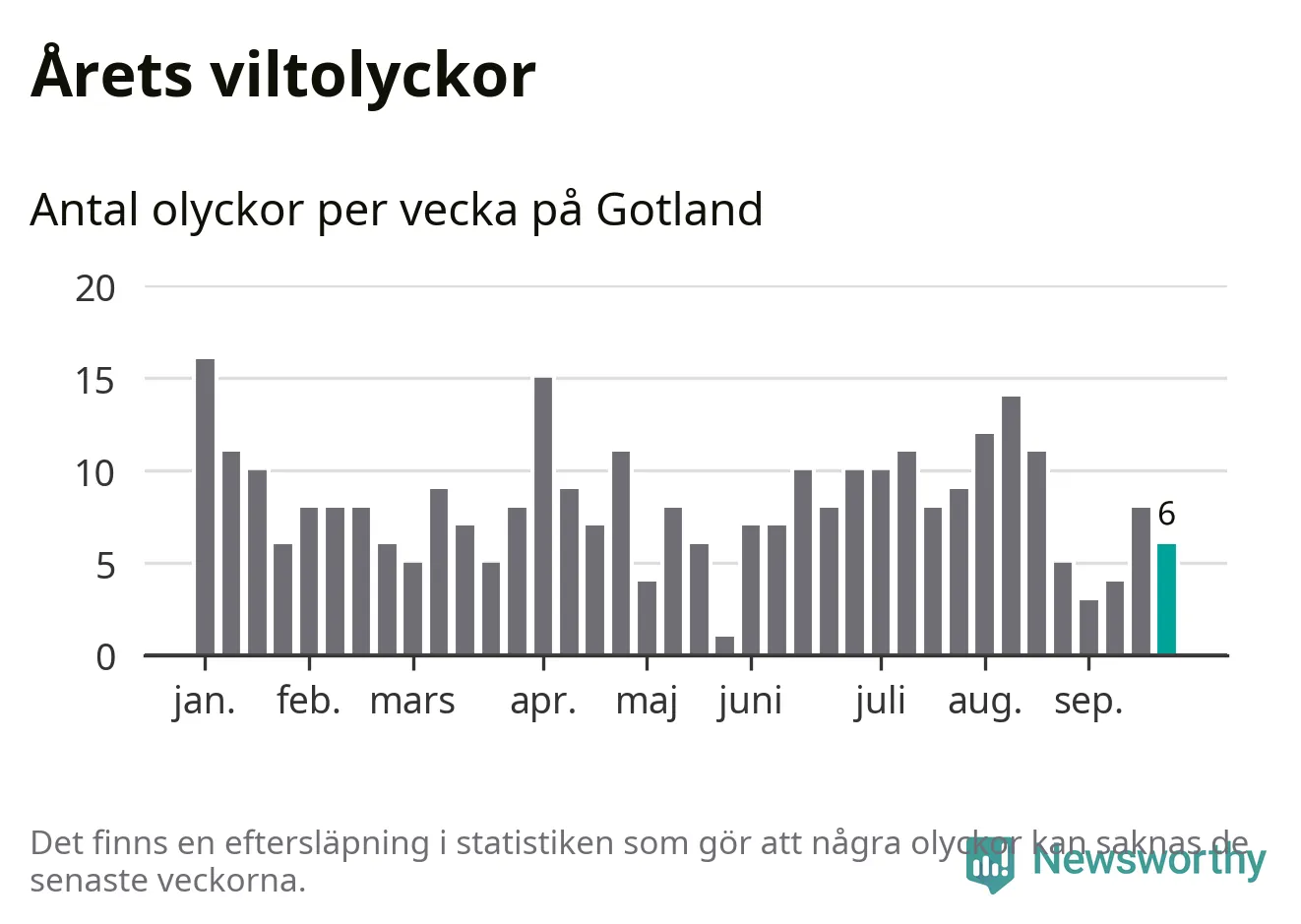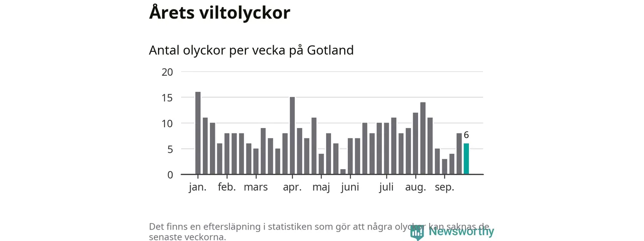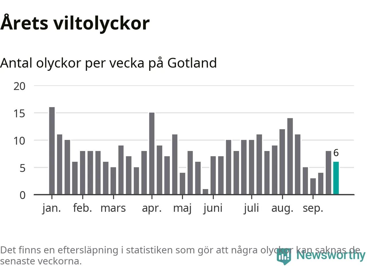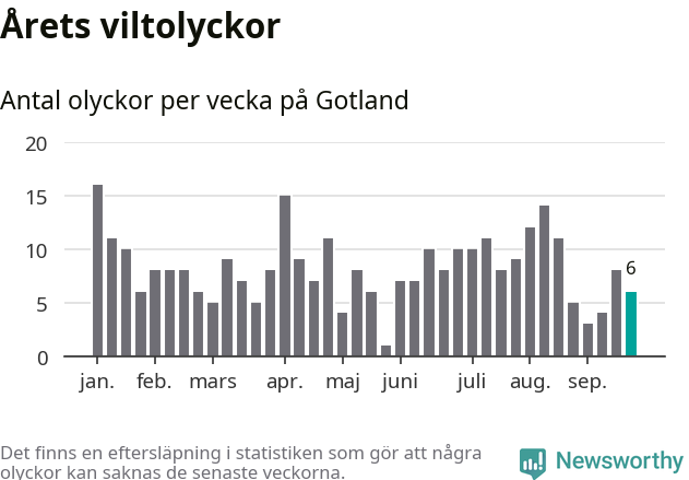 Hittills har sex viltolyckor rapporterats in i Gotlands kommun från vecka 39. Se listan här.