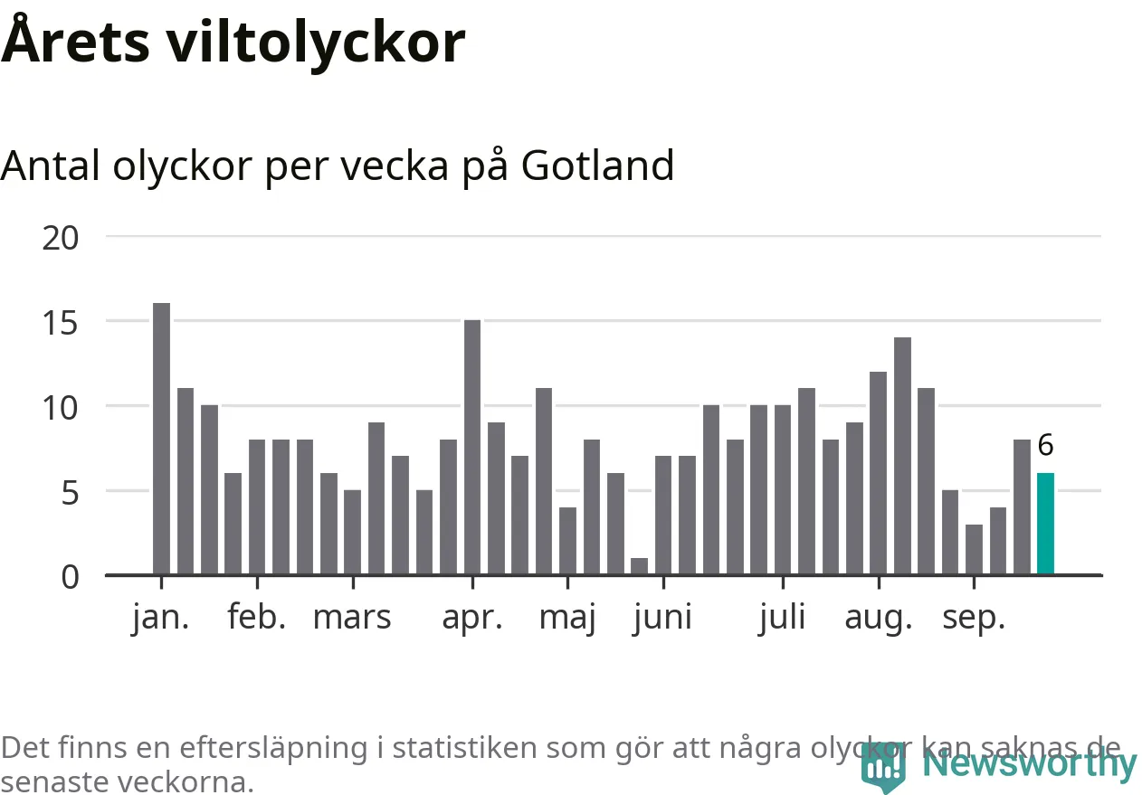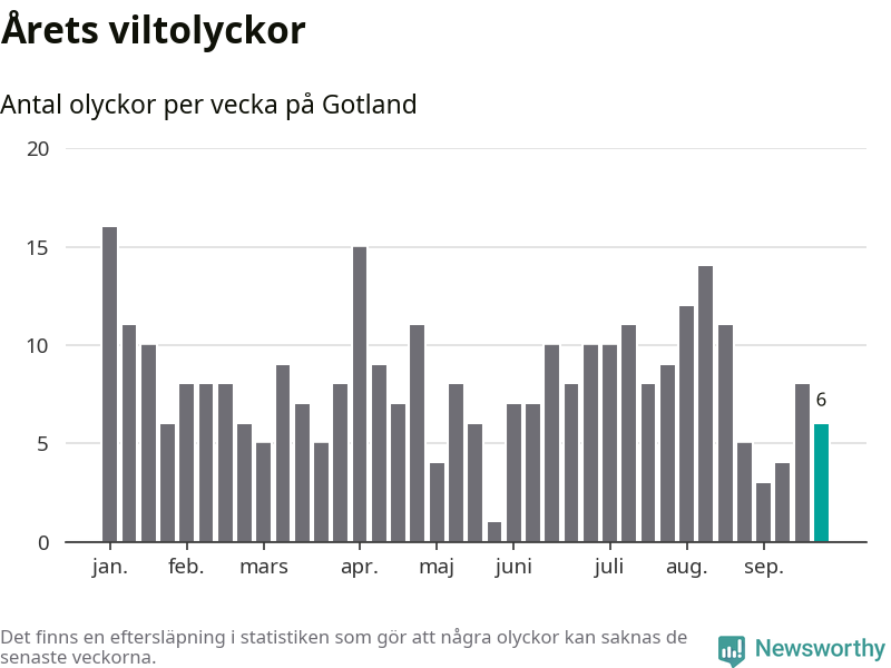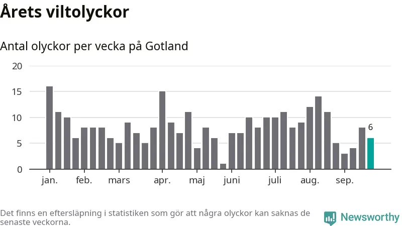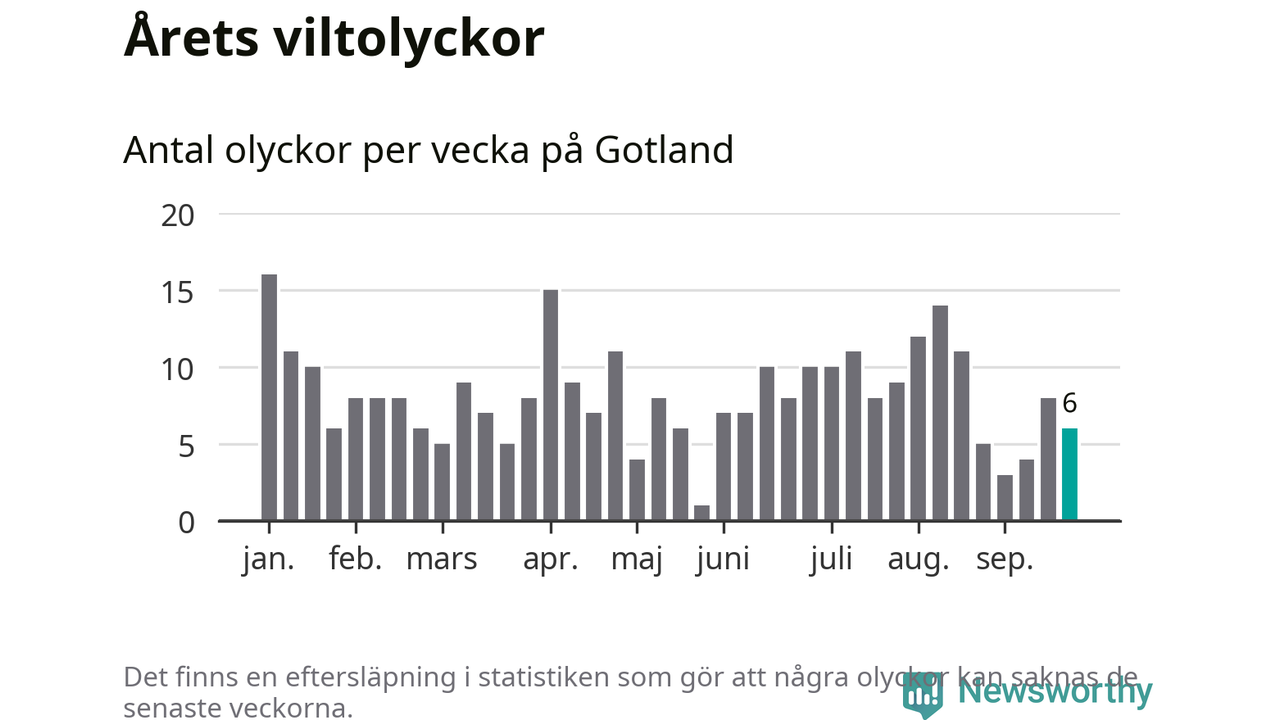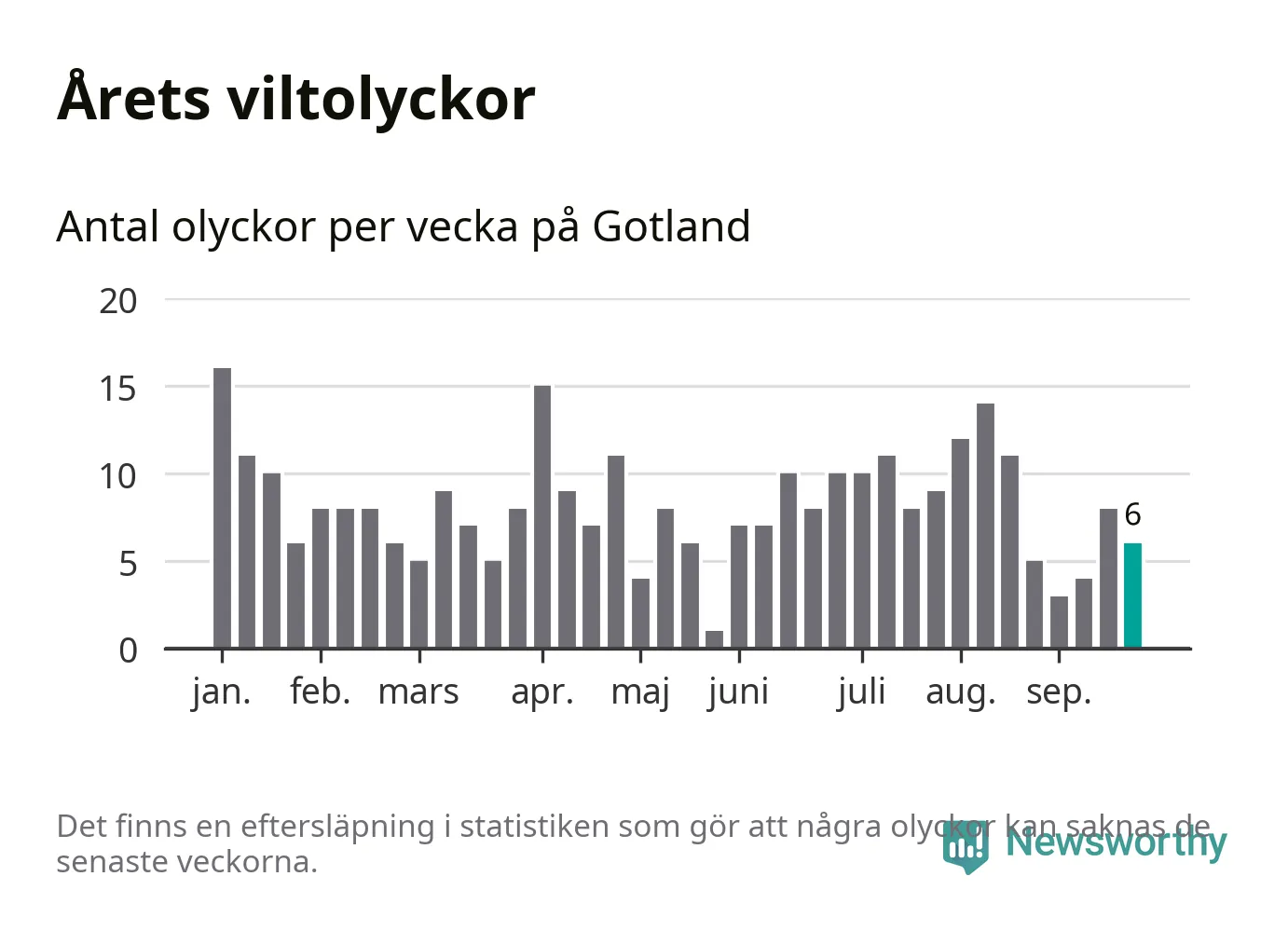 Hittills har sex viltolyckor rapporterats in i Gotlands kommun från vecka 39. Se listan här.