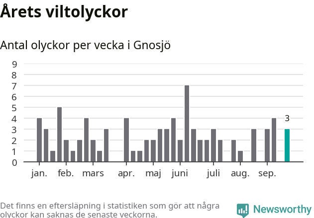 Hittills har tre viltolyckor rapporterats in i Gnosjö kommun från vecka 39. Se listan här.