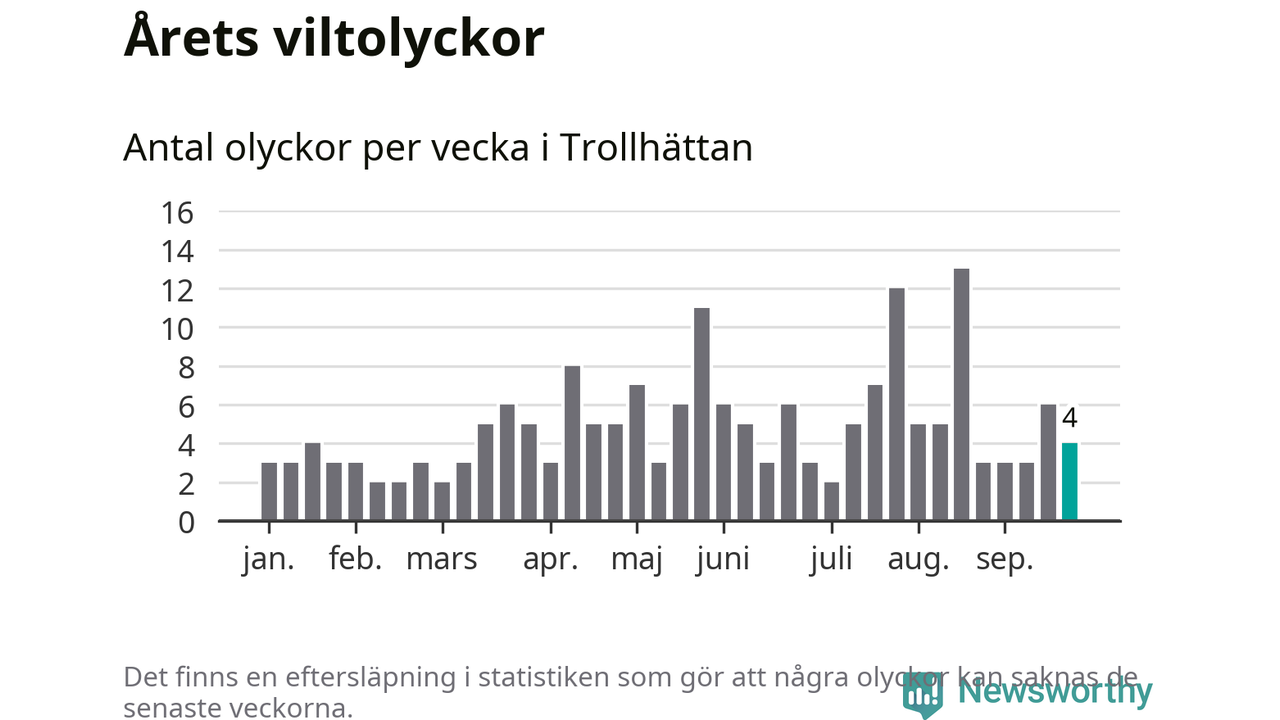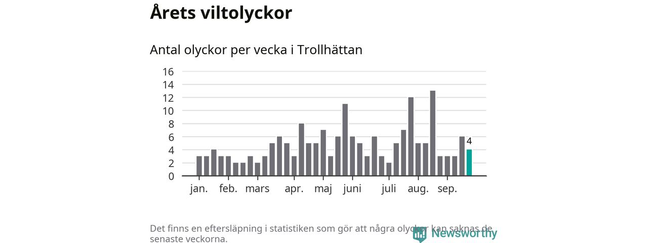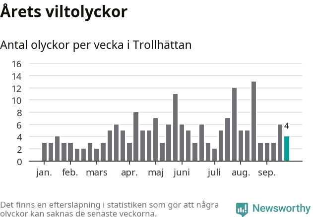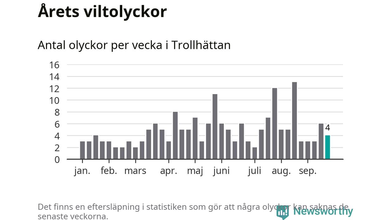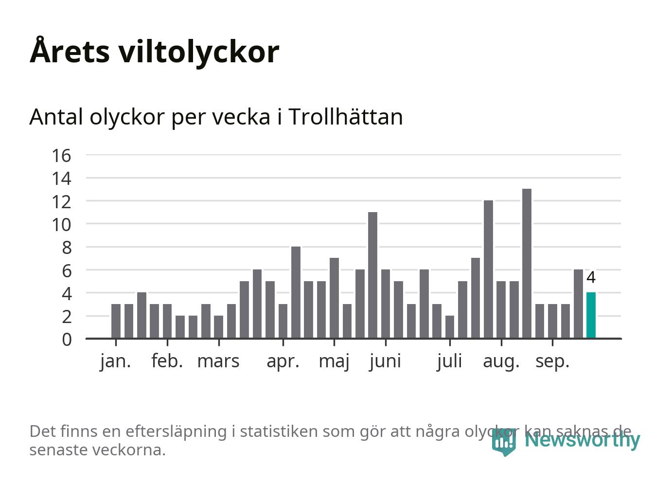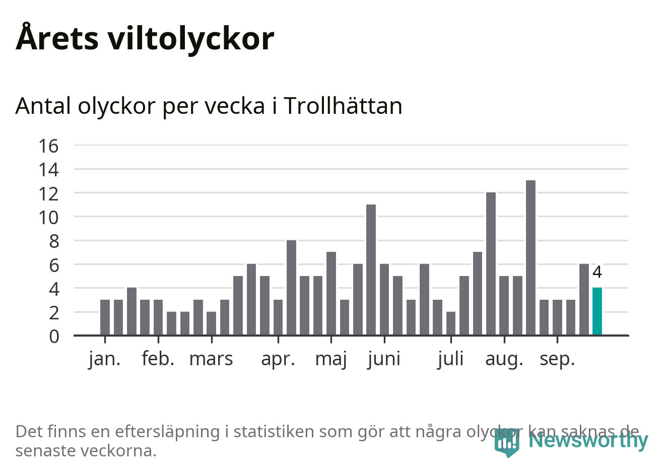 Hittills har fyra viltolyckor rapporterats in i Trollhättans kommun från vecka 39. Se listan här.