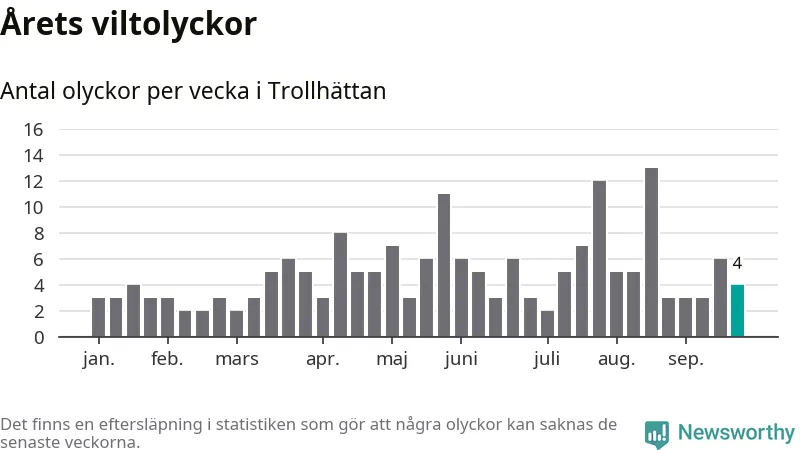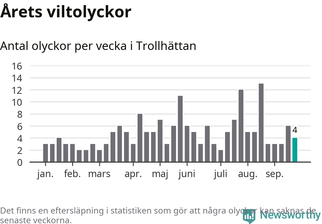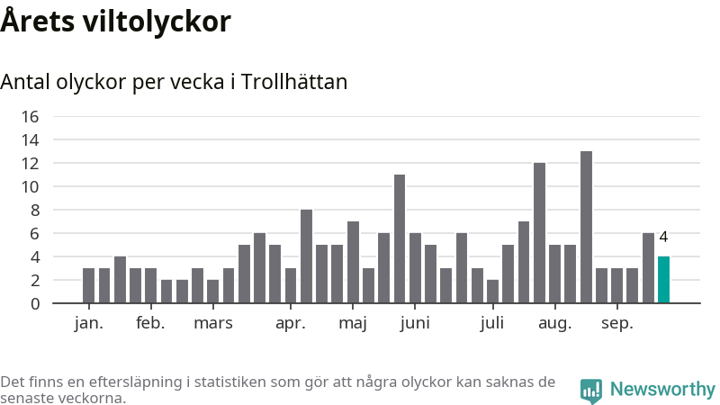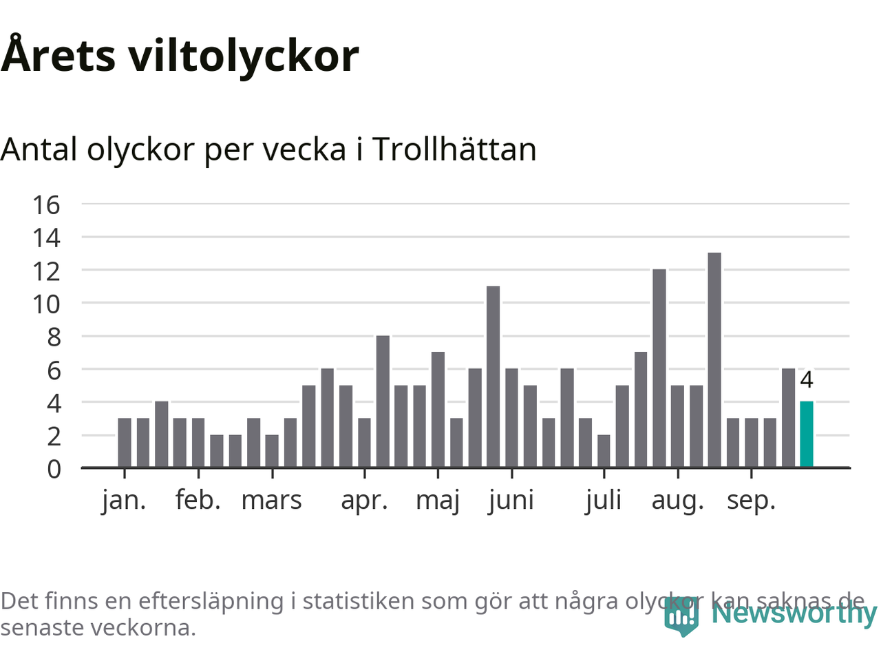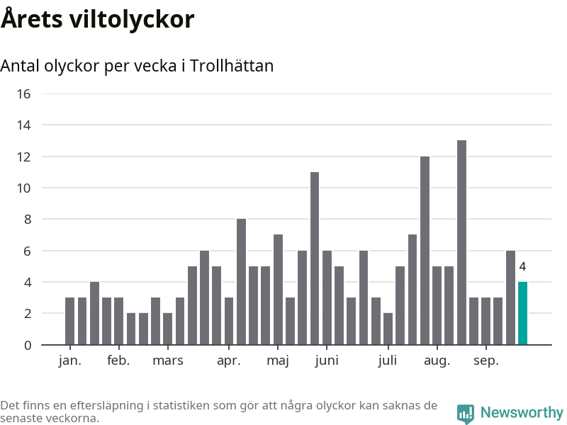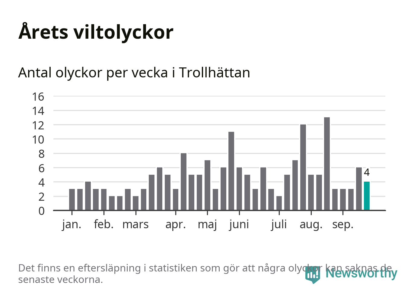 Hittills har fyra viltolyckor rapporterats in i Trollhättans kommun från vecka 39. Se listan här.
