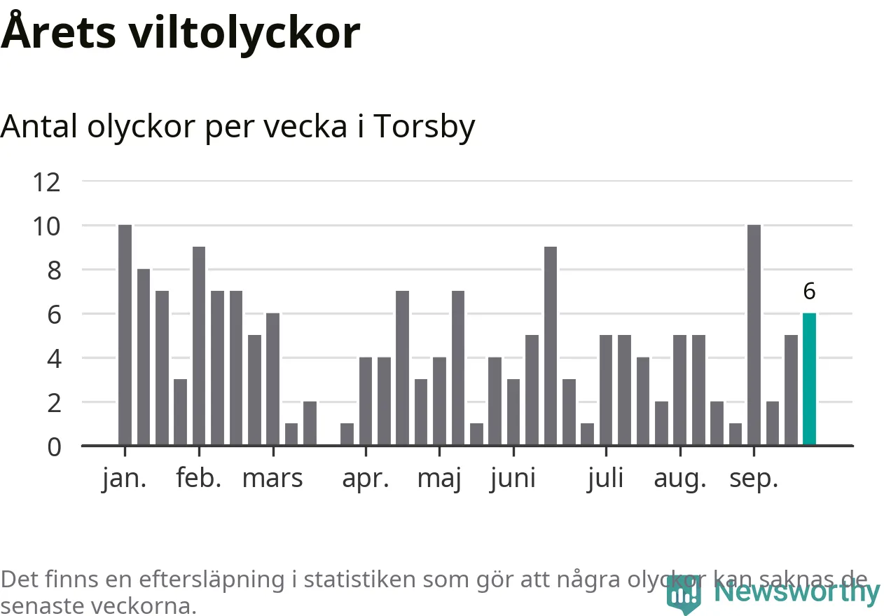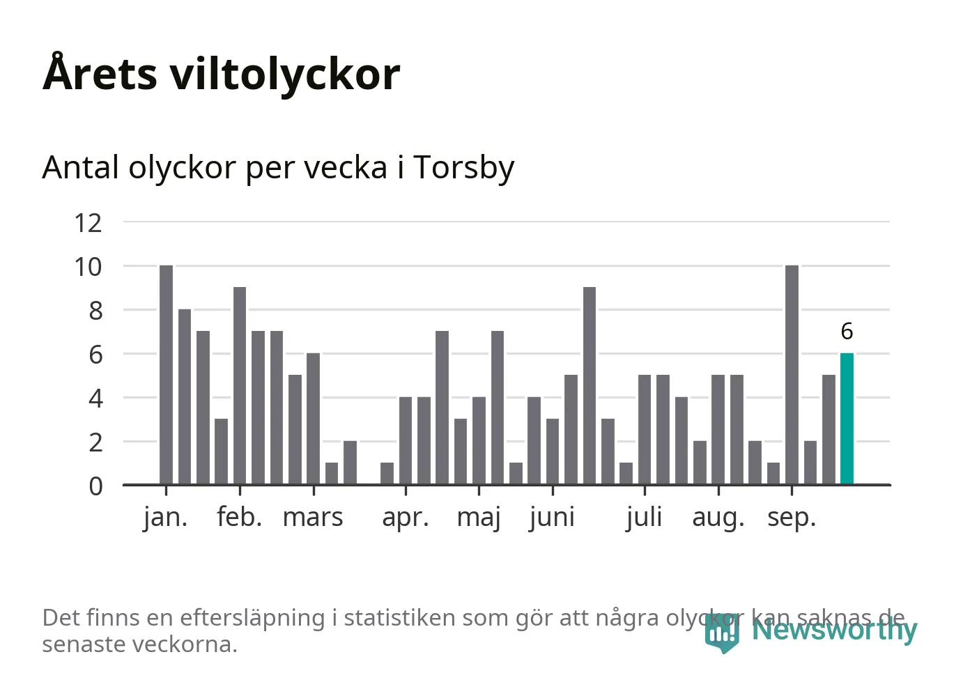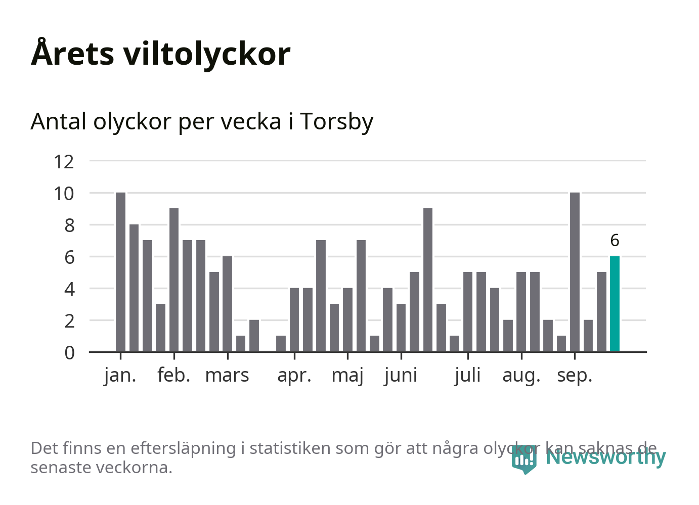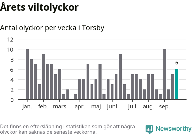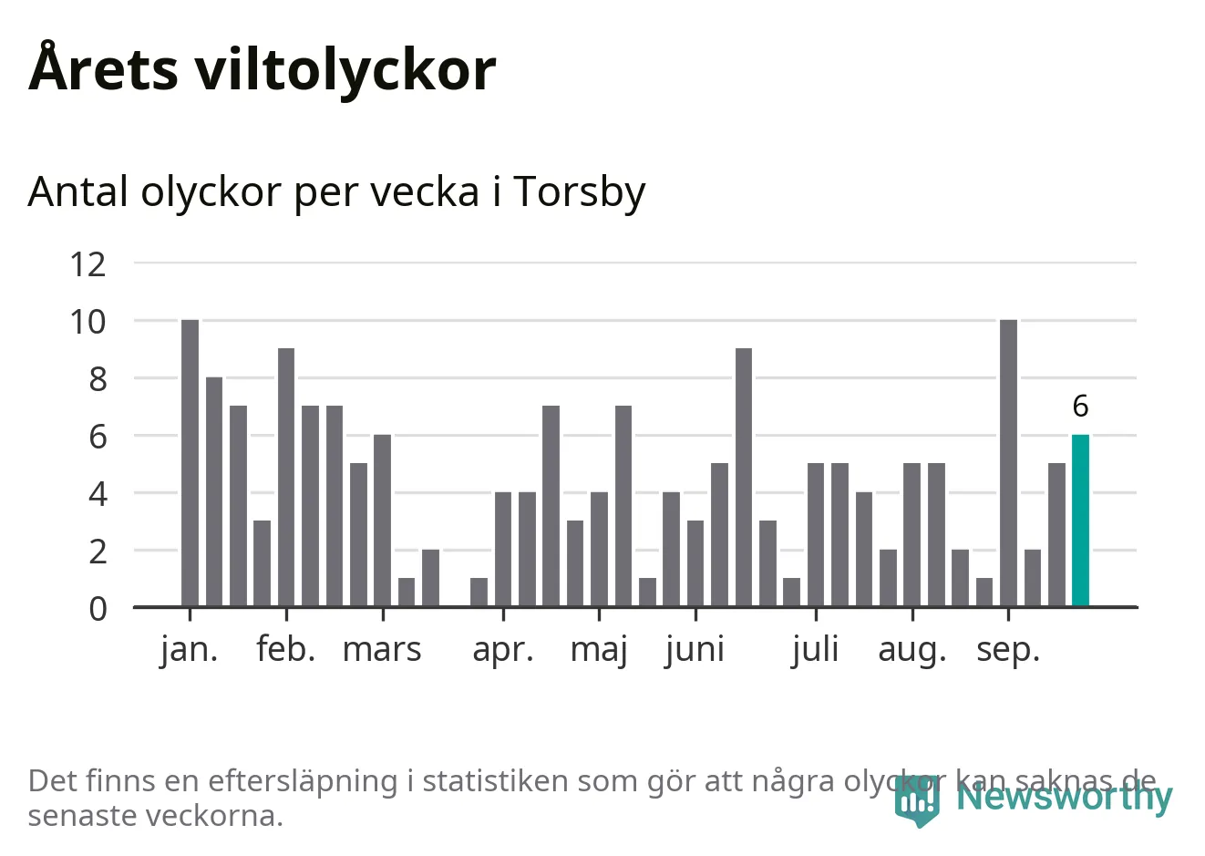 Totalt det här året har det inträffat 174 viltolyckor i kommunen. Det är mindre än genomsnittet för motsvarande period (omkring 211) de senaste tio åren.