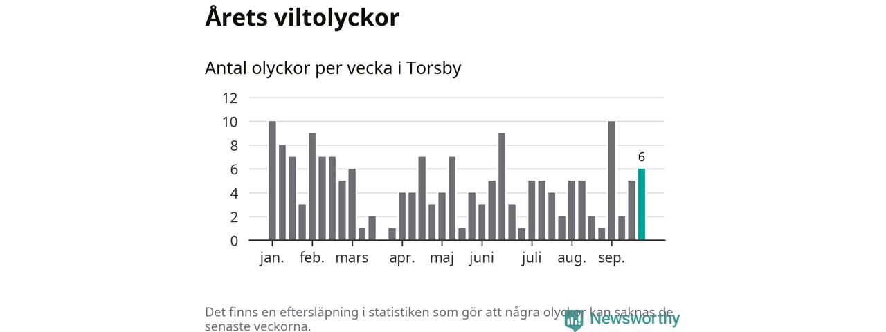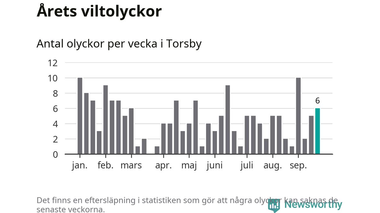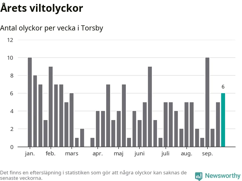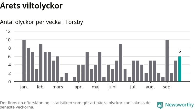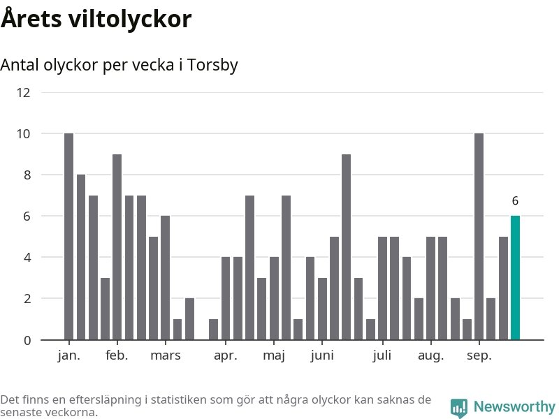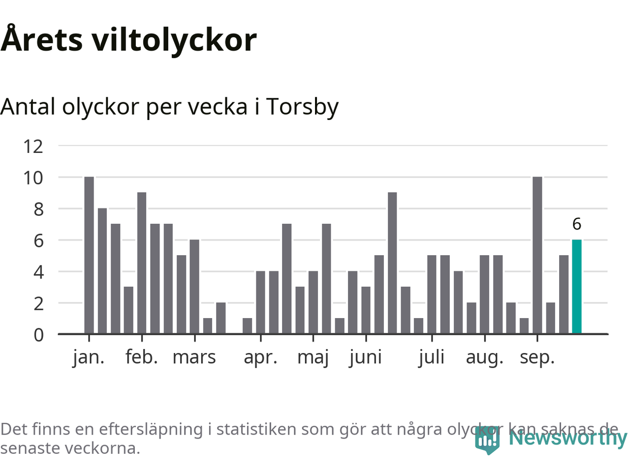 Totalt det här året har det inträffat 174 viltolyckor i kommunen. Det är mindre än genomsnittet för motsvarande period (omkring 211) de senaste tio åren.