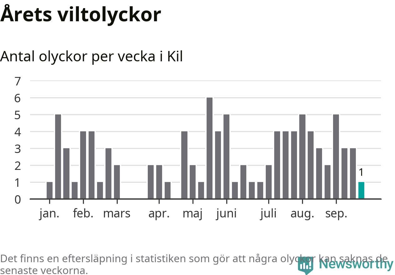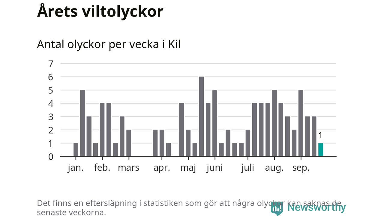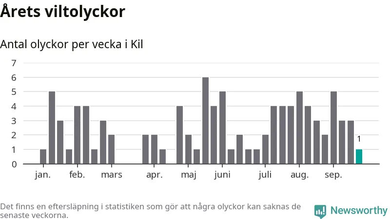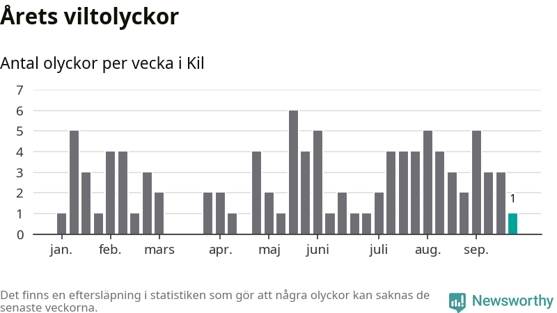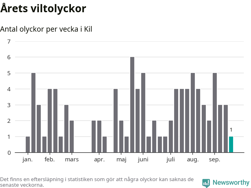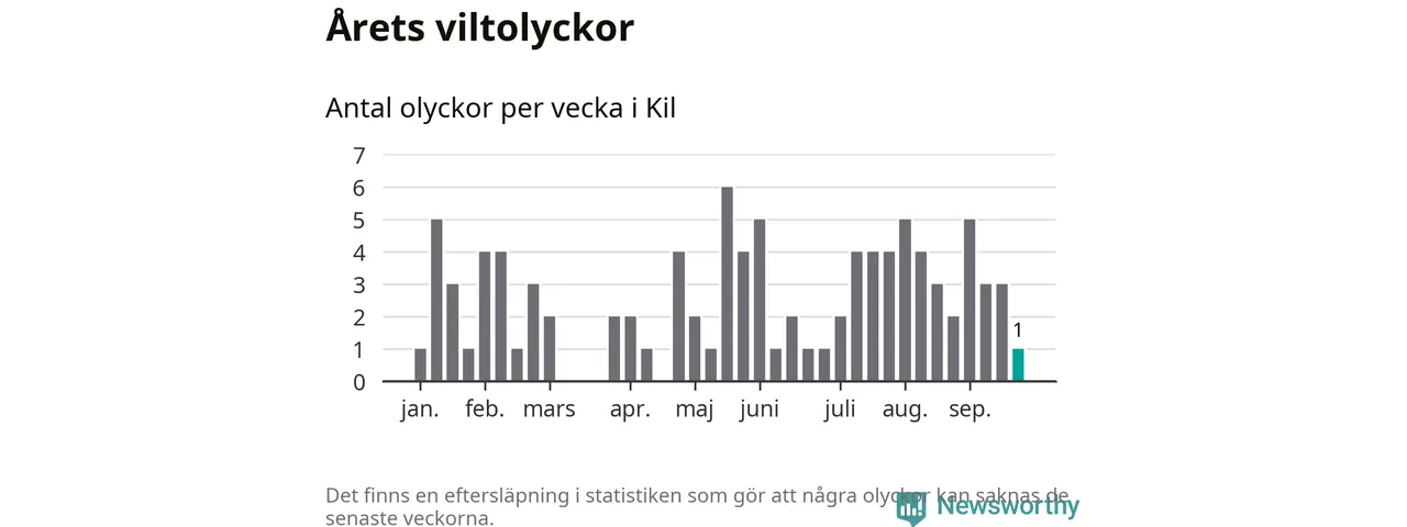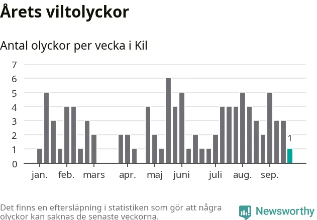 Från förra veckan (vecka 39) har hittills en viltolycka rapporterats in i Kils kommun.