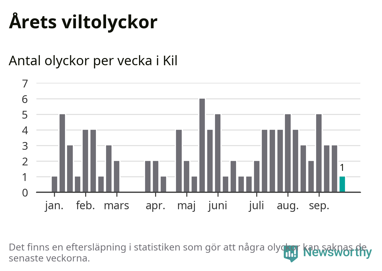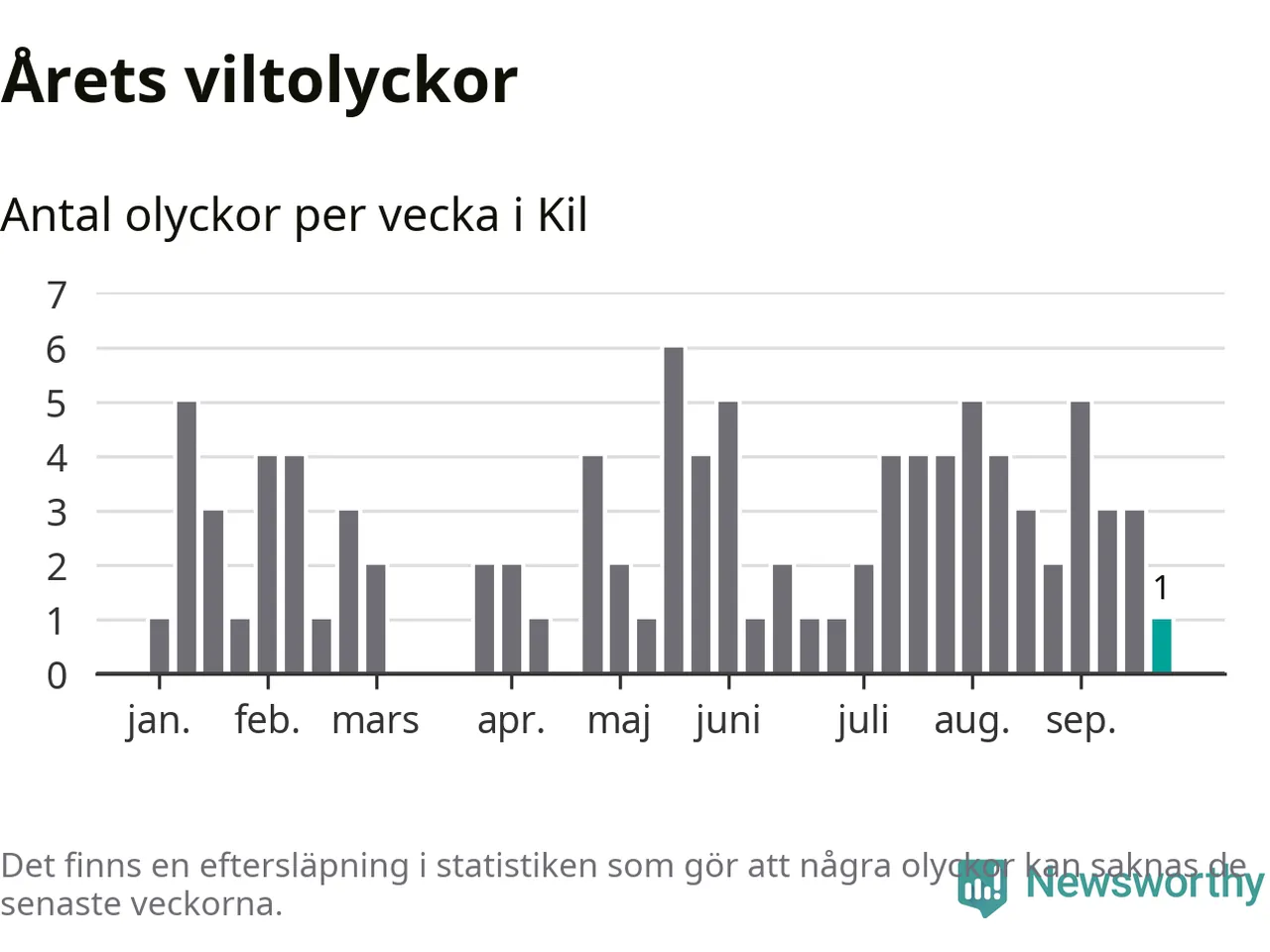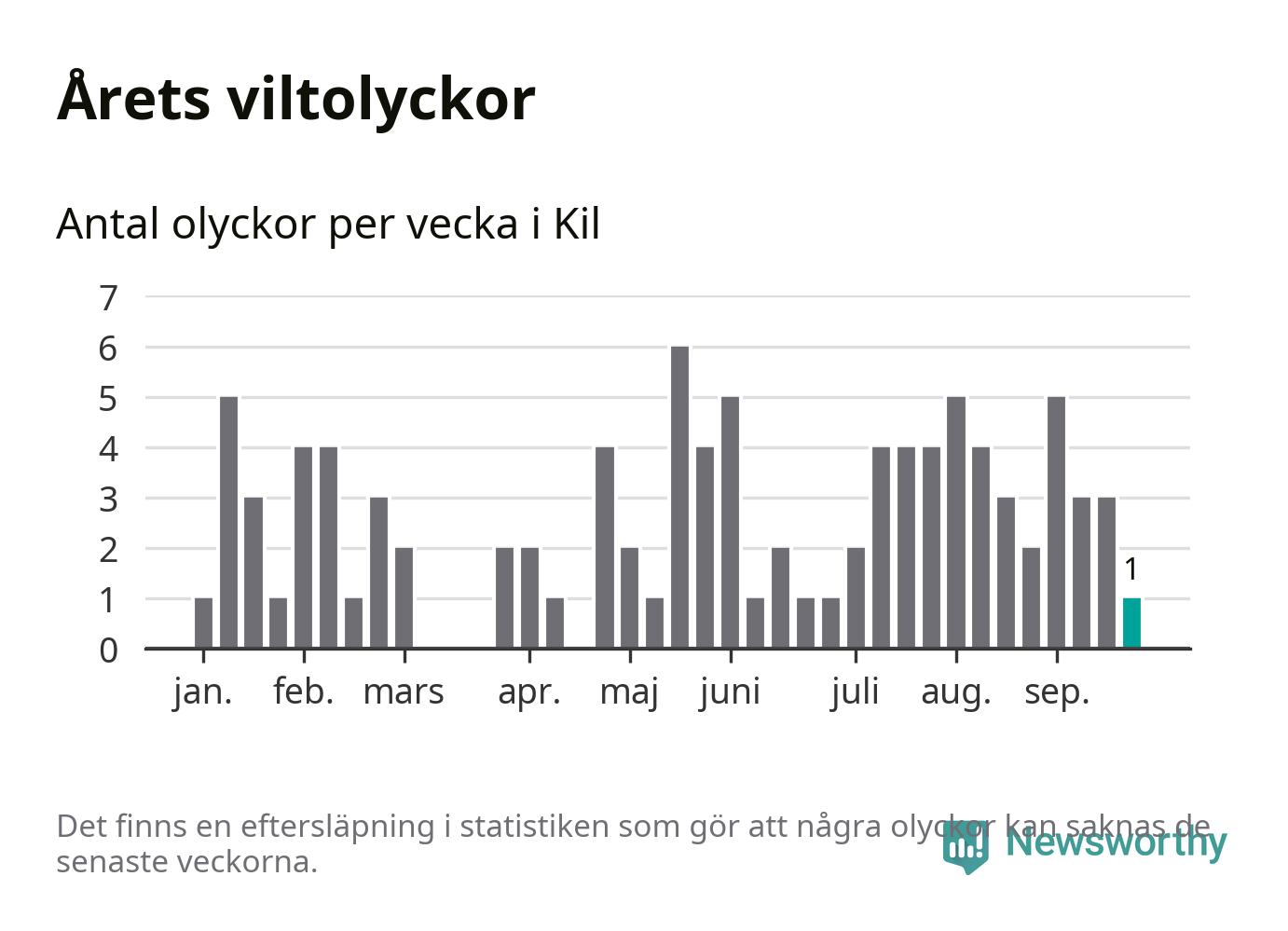 Från förra veckan (vecka 39) har hittills en viltolycka rapporterats in i Kils kommun.