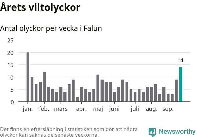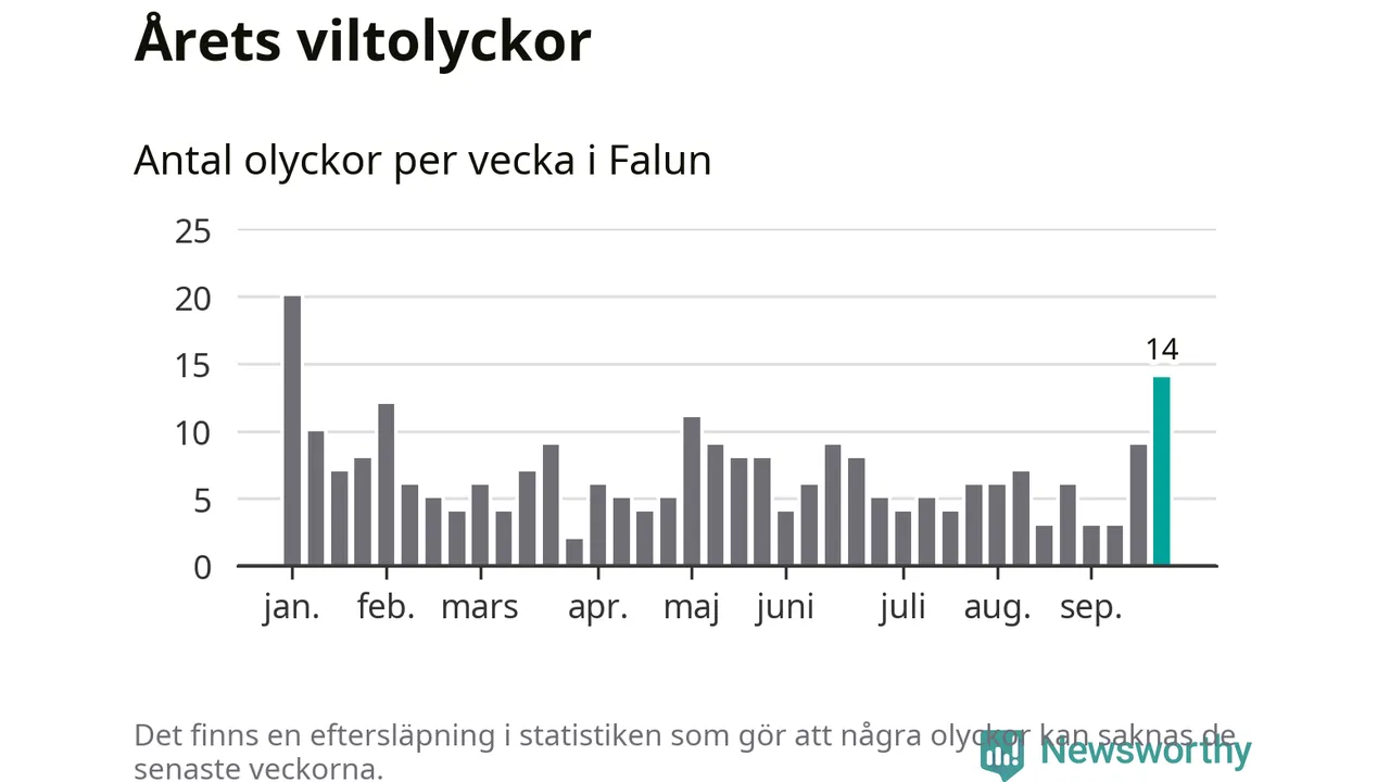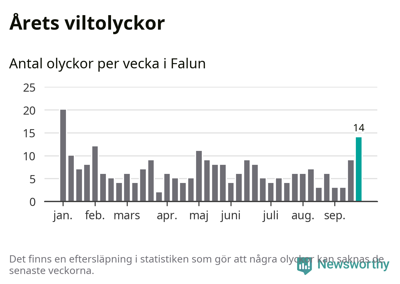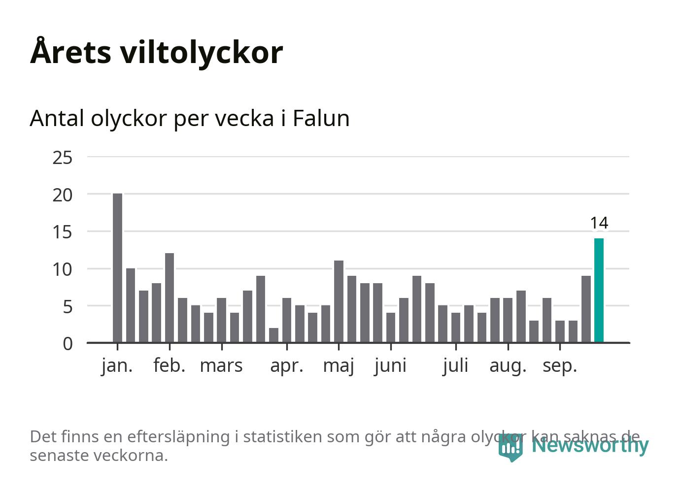 Hittills har 14 viltolyckor rapporterats in i Falu kommun från vecka 39. Se listan här.
