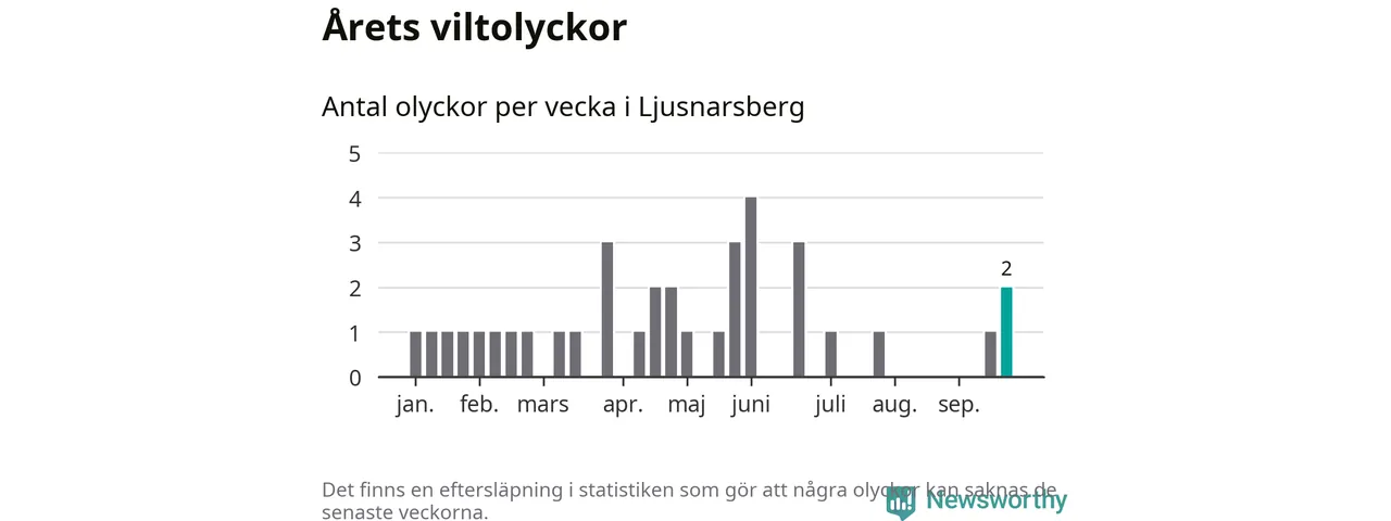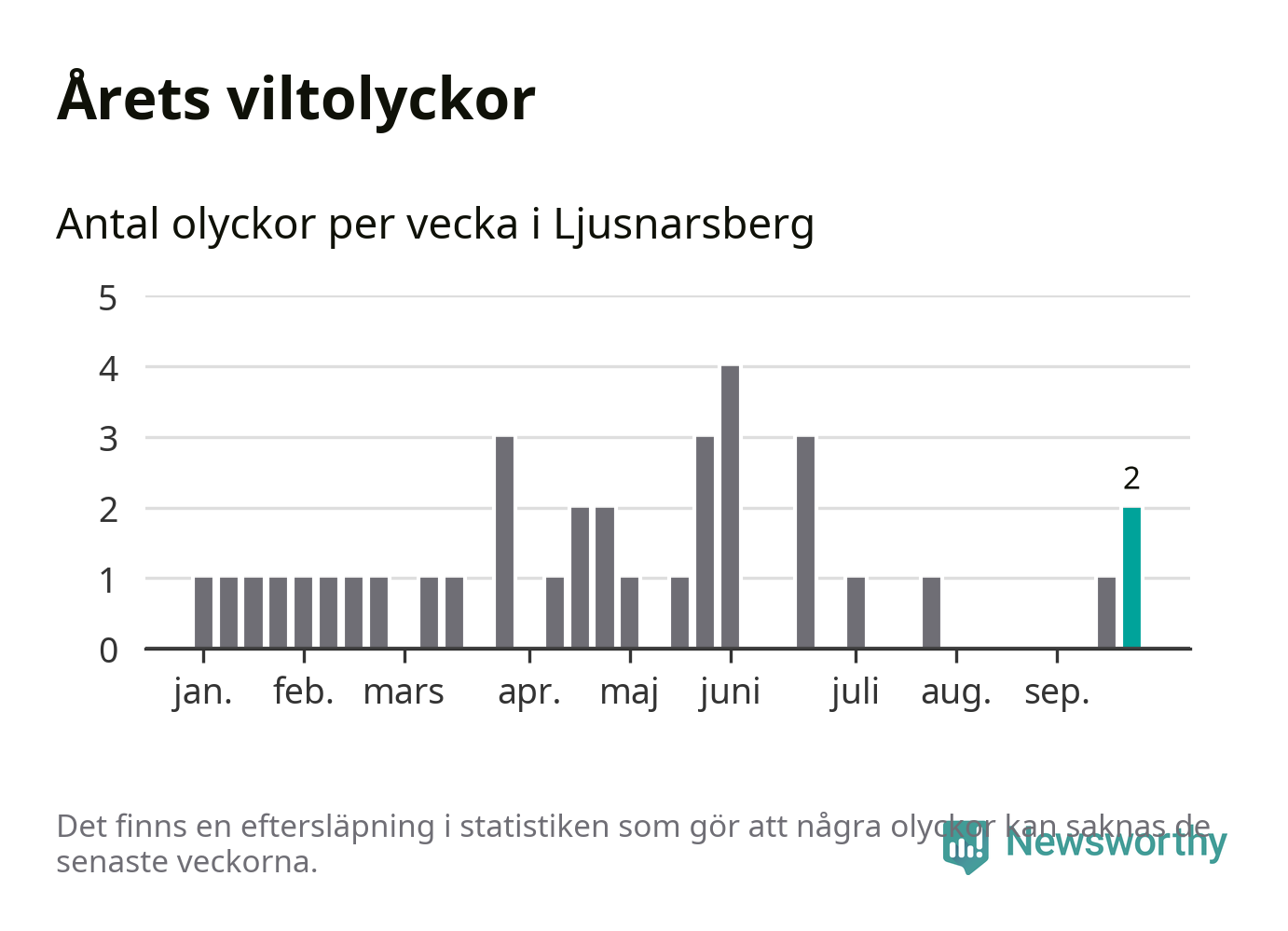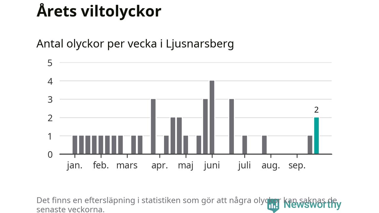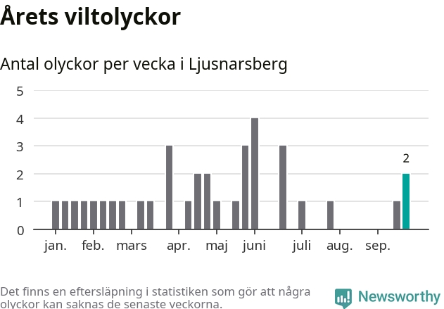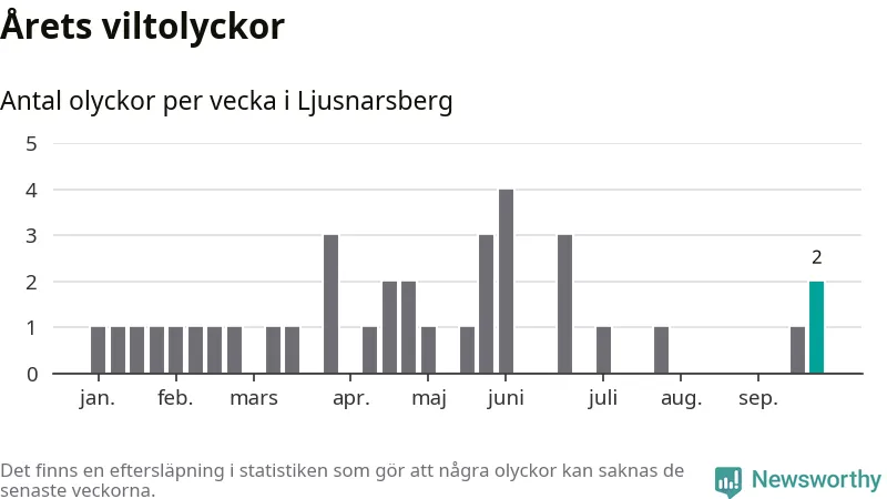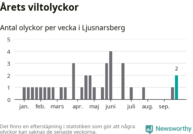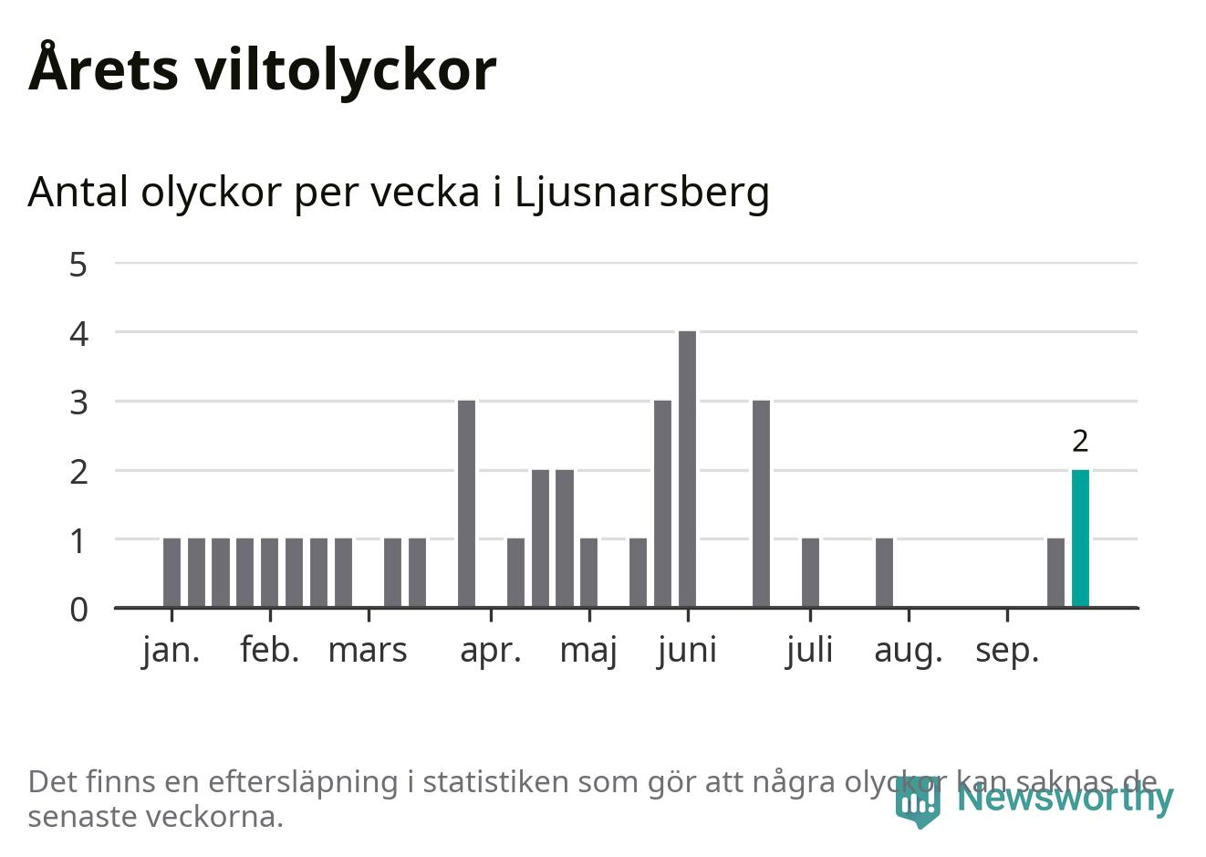 Hittills har två viltolyckor rapporterats in i Ljusnarsbergs kommun från vecka 39. Se listan här.