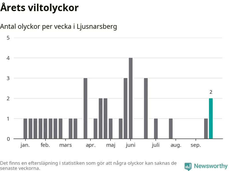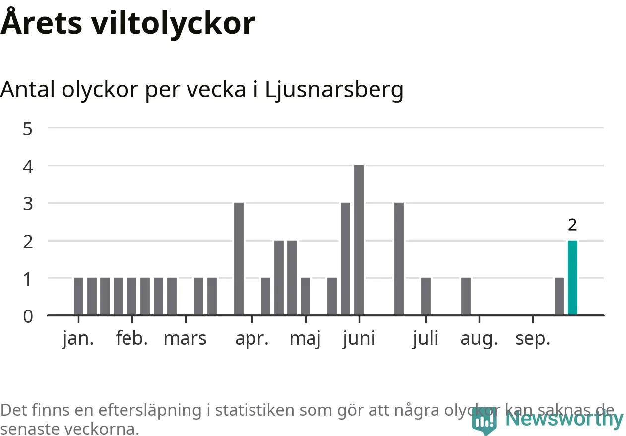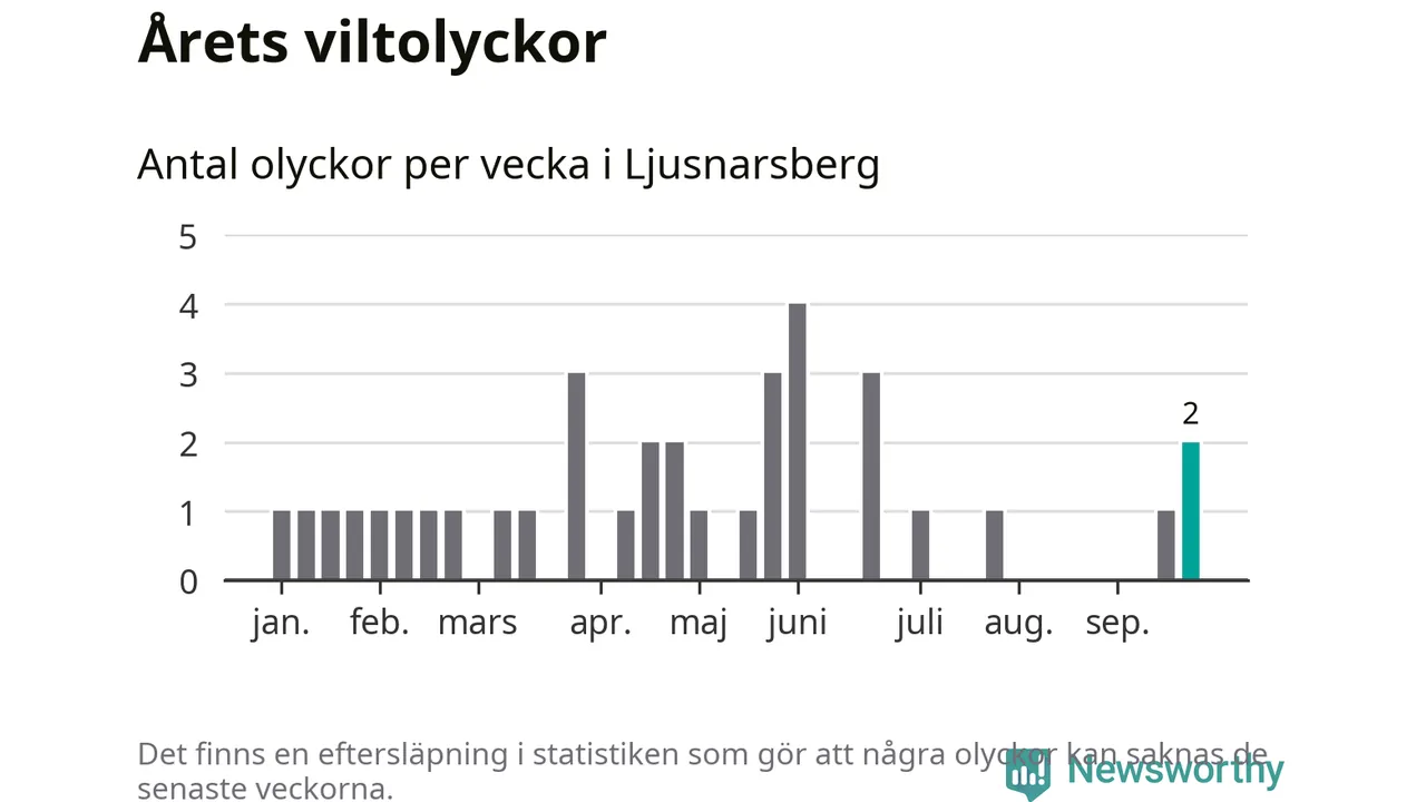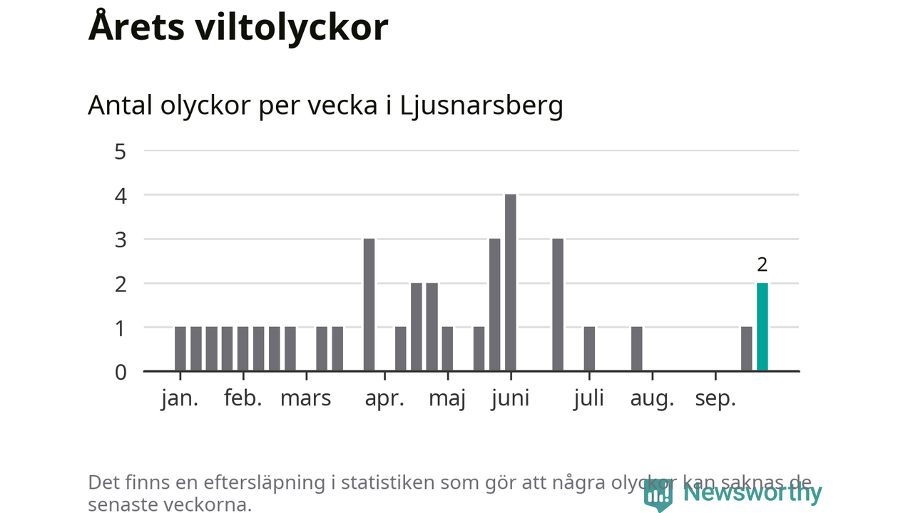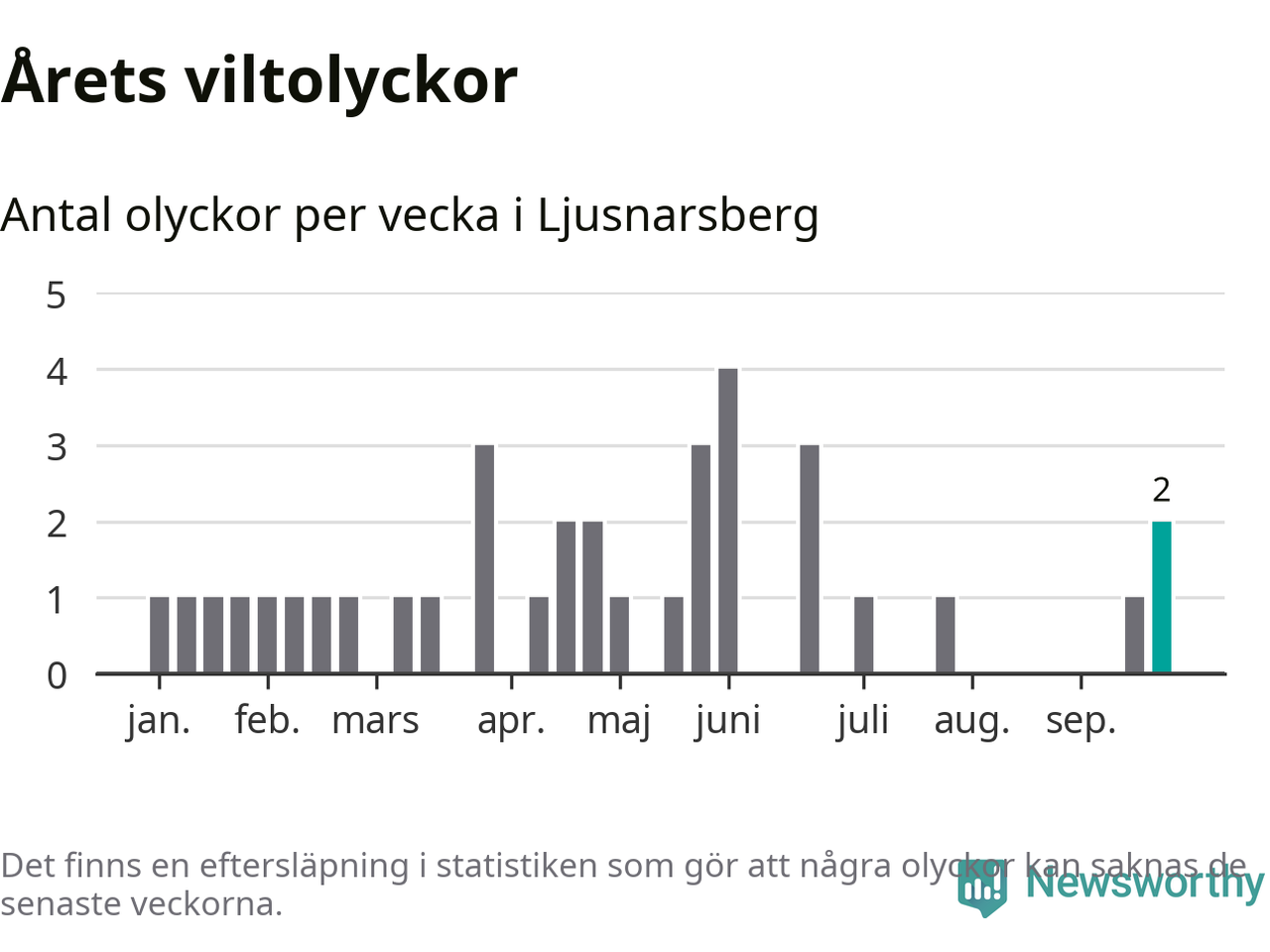 Hittills har två viltolyckor rapporterats in i Ljusnarsbergs kommun från vecka 39. Se listan här.