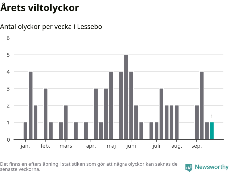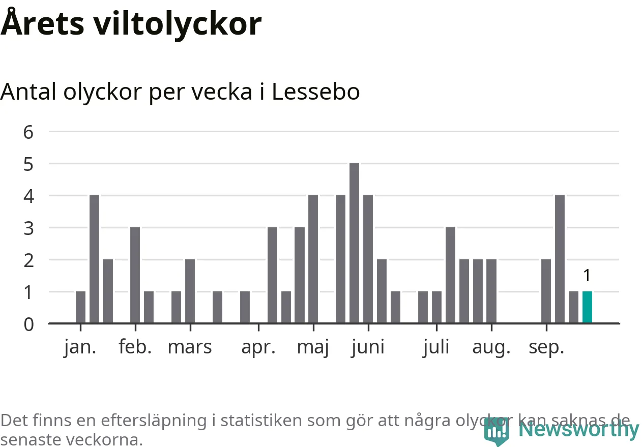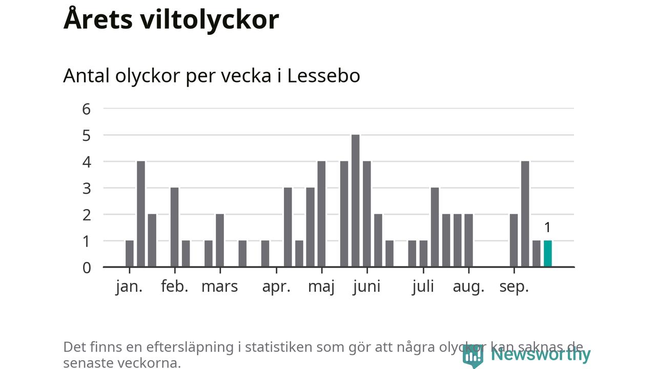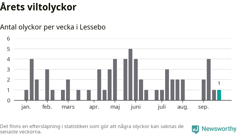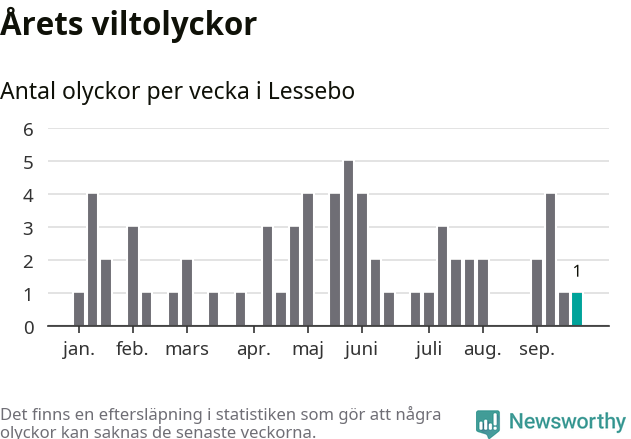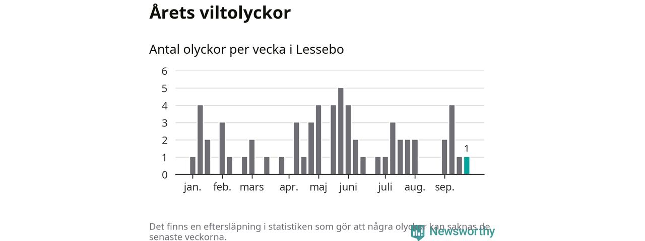 Från förra veckan (vecka 39) har hittills en viltolycka rapporterats in i Lessebo kommun.