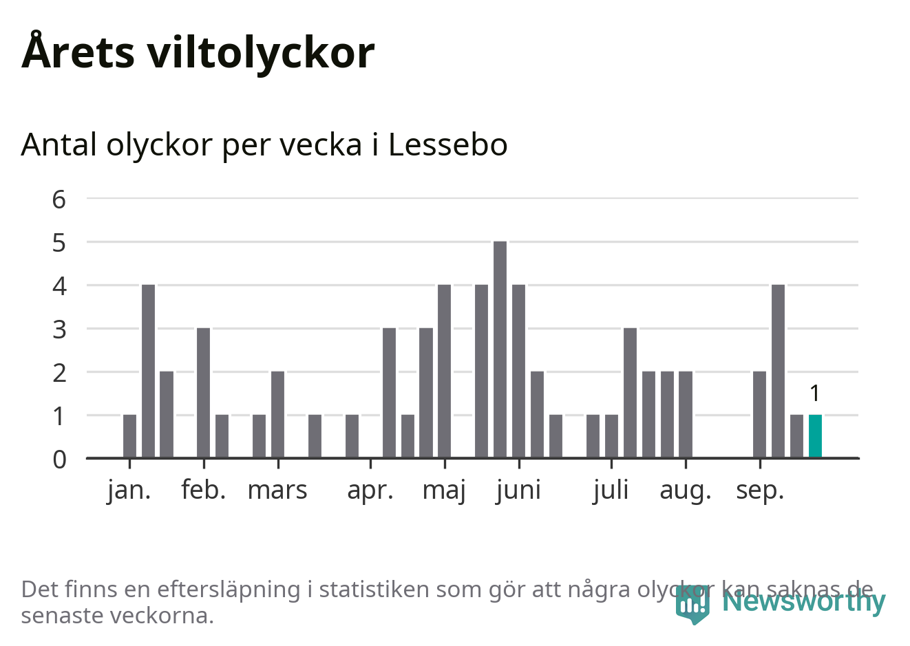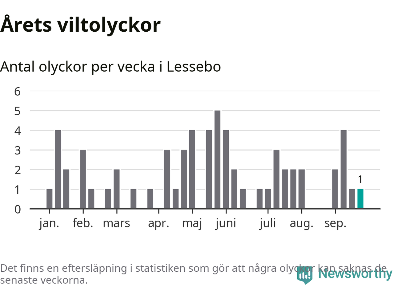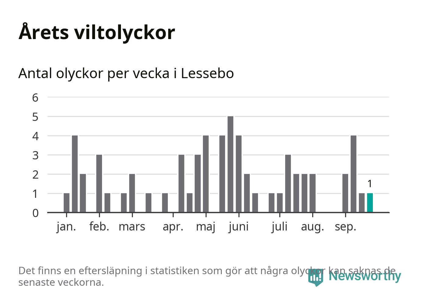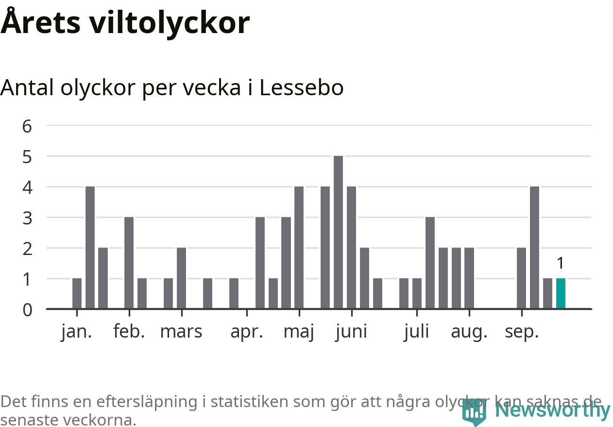 Från förra veckan (vecka 39) har hittills en viltolycka rapporterats in i Lessebo kommun.