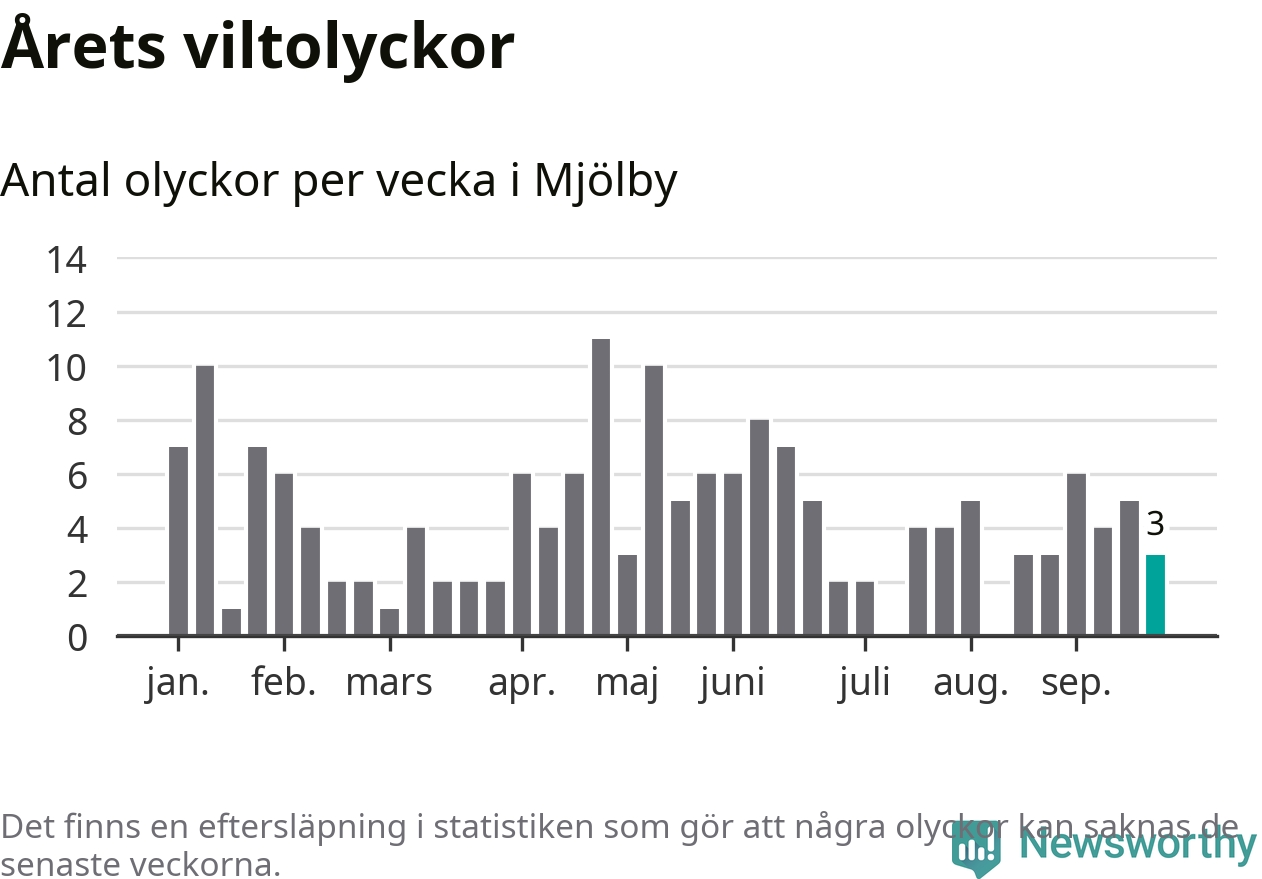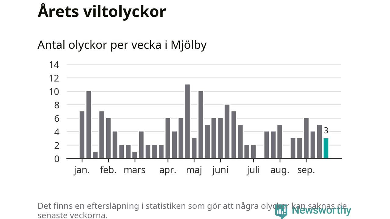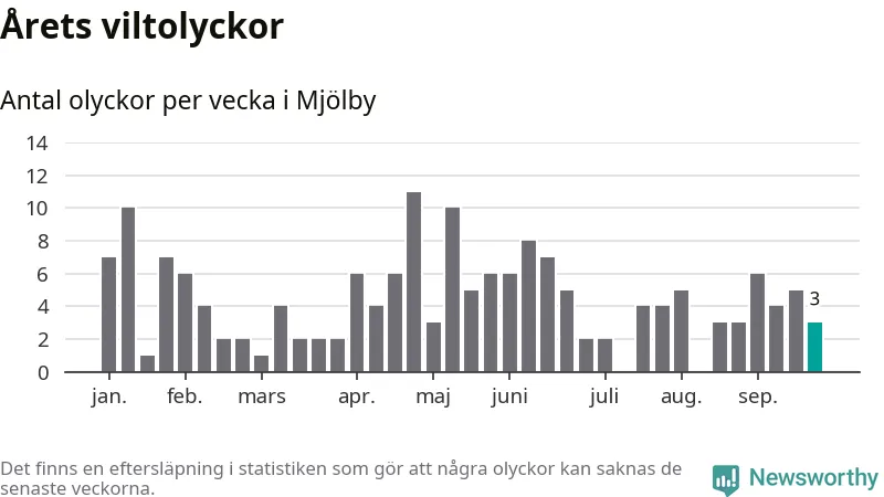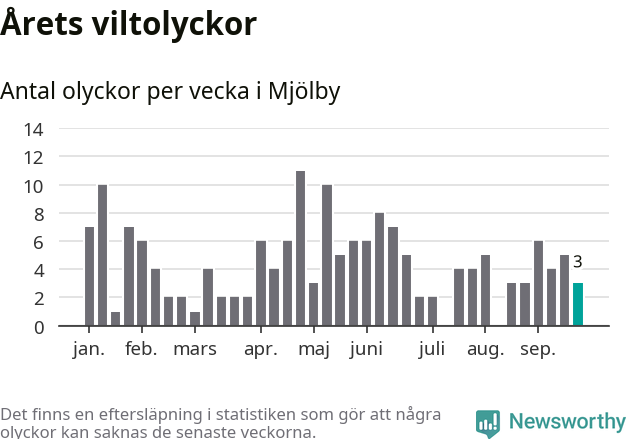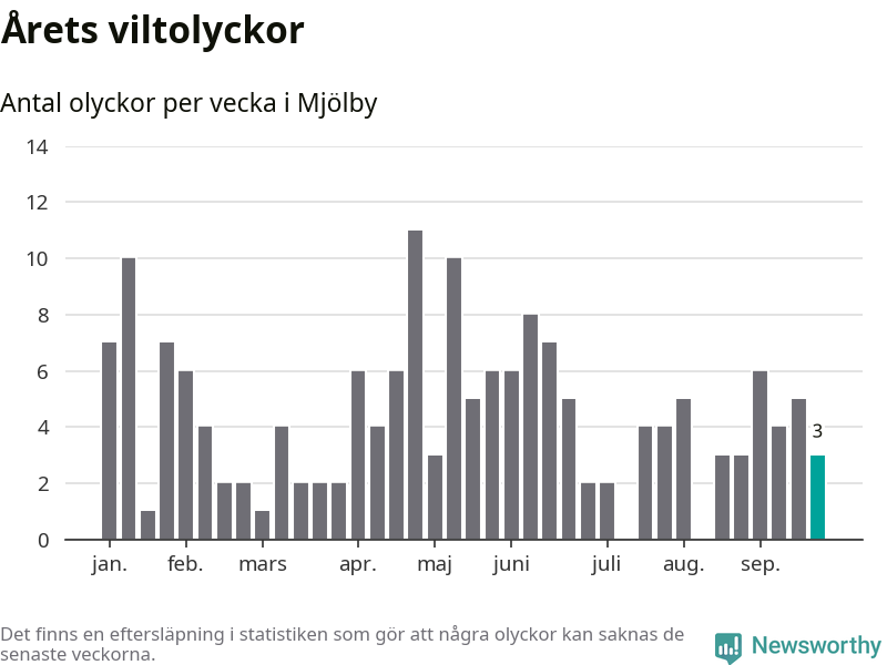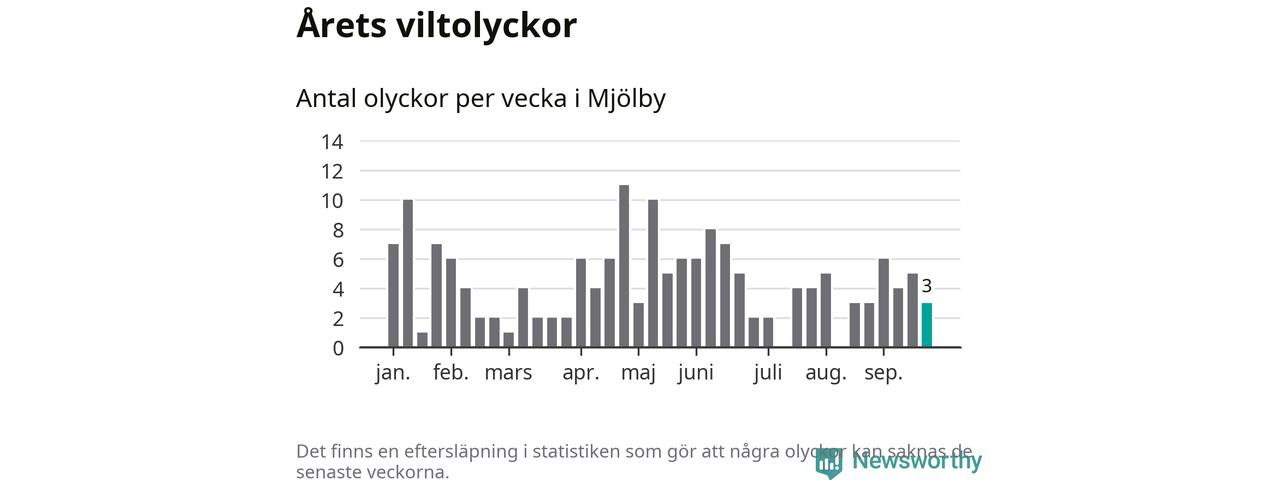 Hittills har tre viltolyckor rapporterats in i Mjölby kommun från vecka 39. Se listan här.