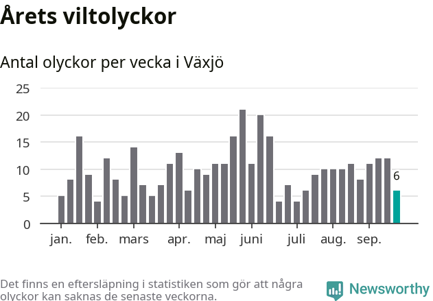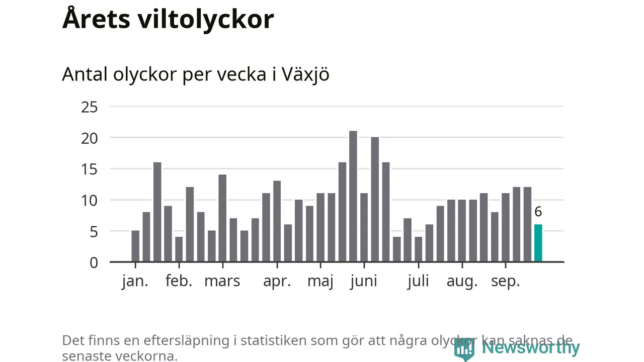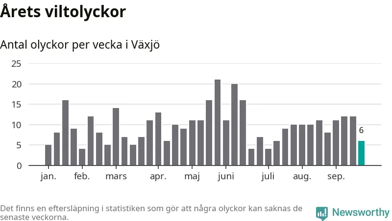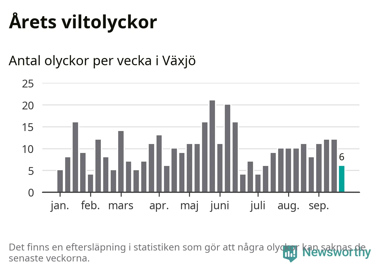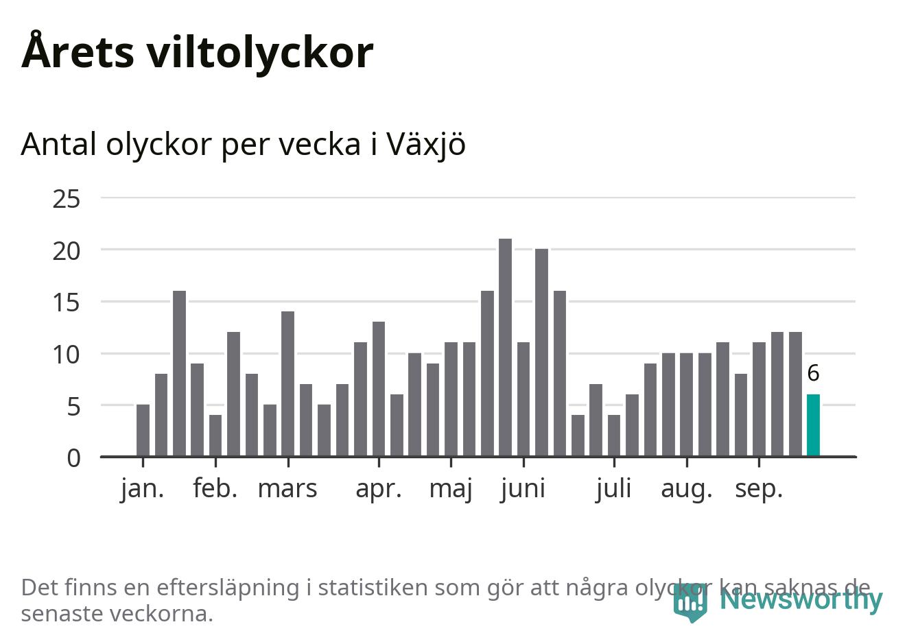 Hittills har sex viltolyckor rapporterats in i Växjö kommun från vecka 39. Se listan här.