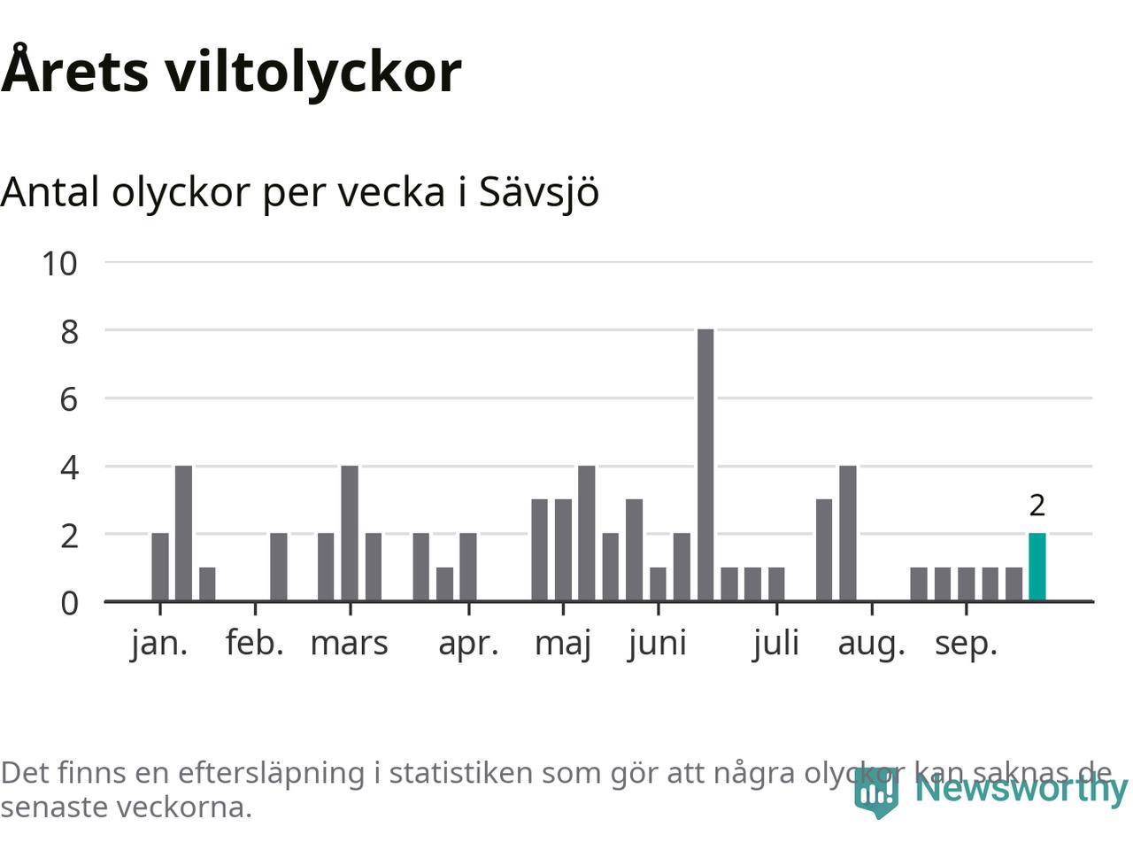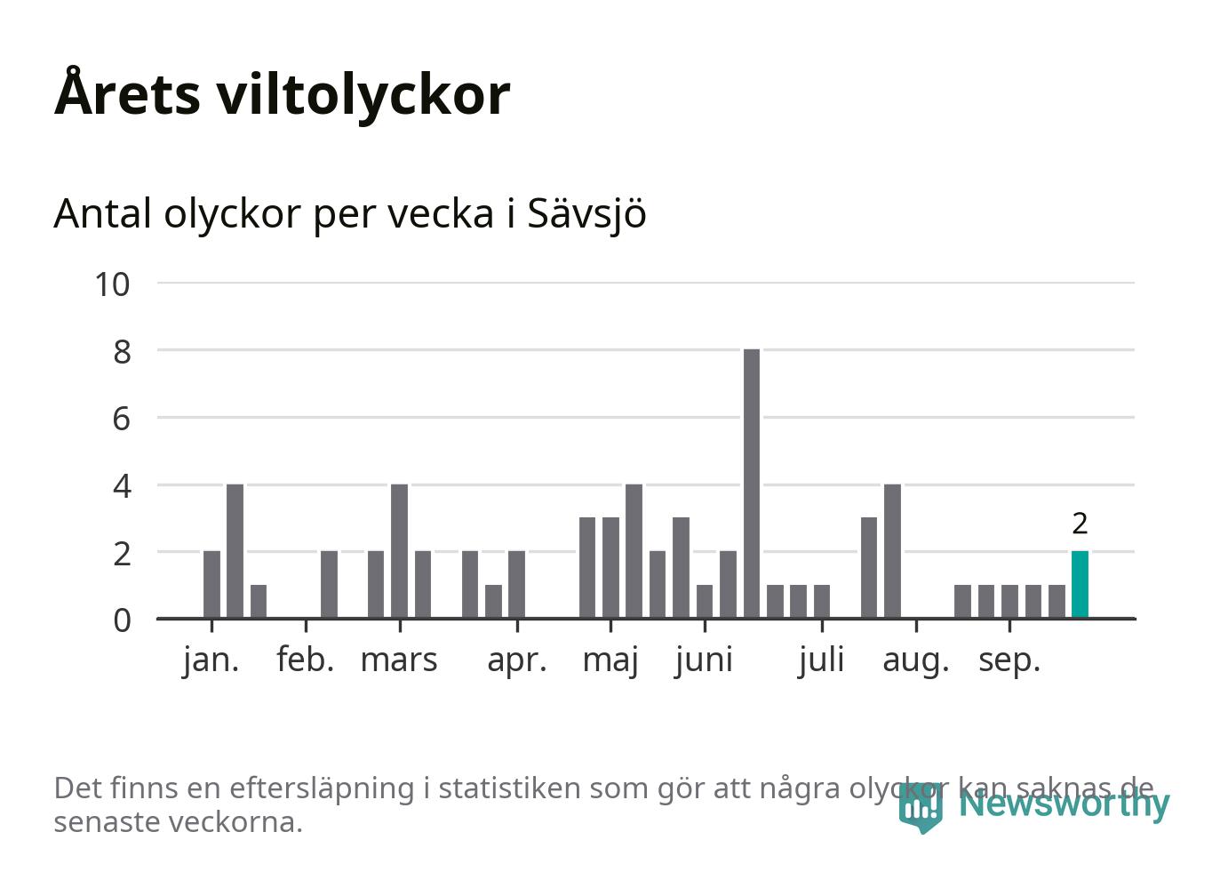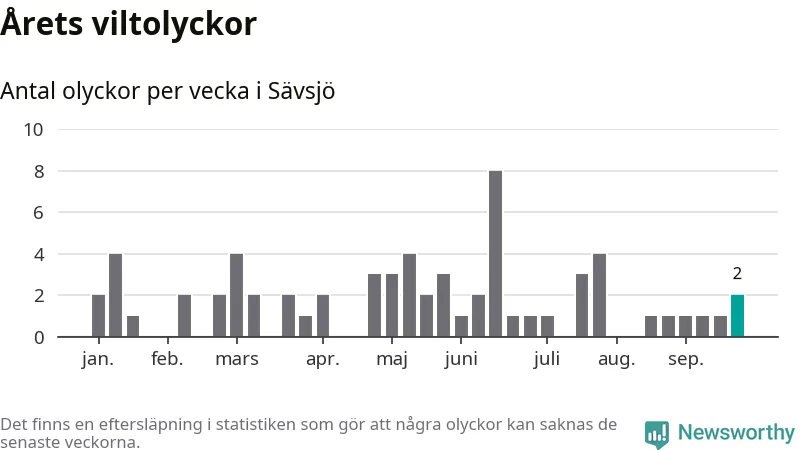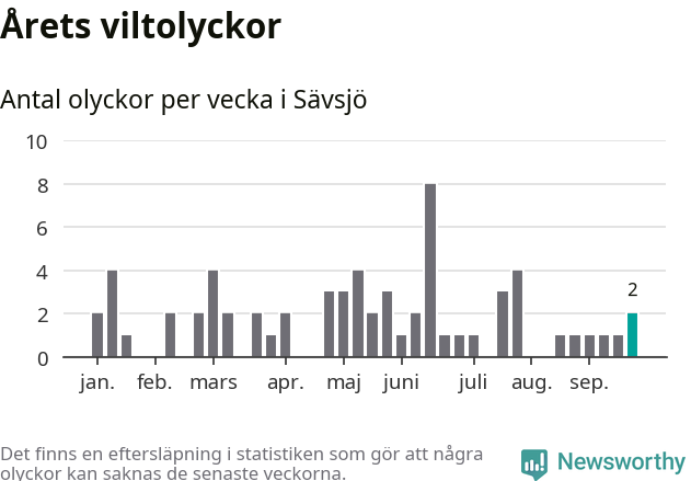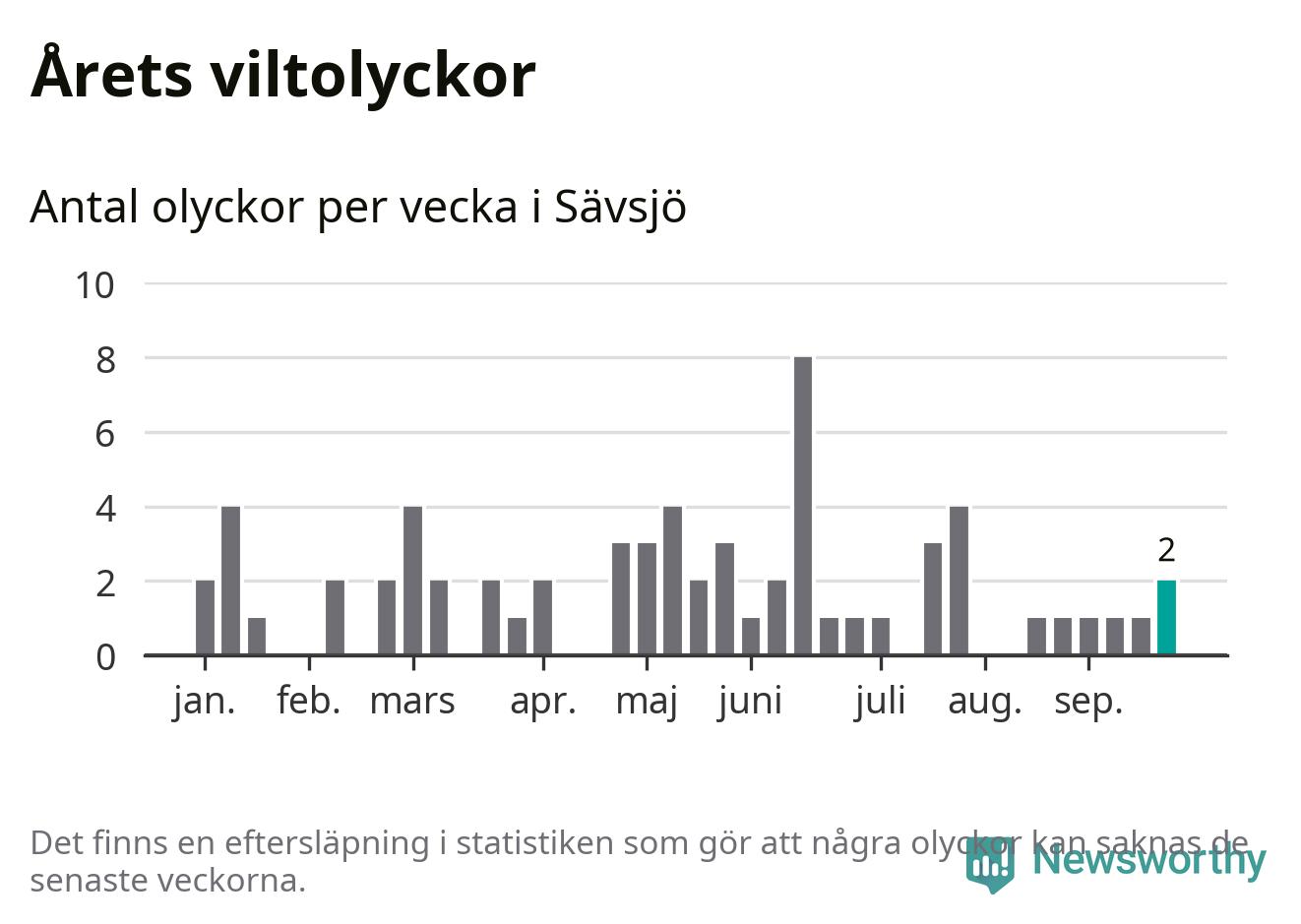 Hittills har två viltolyckor rapporterats in i Sävsjö kommun från vecka 39. Se listan här.