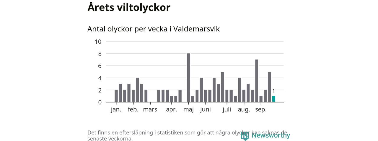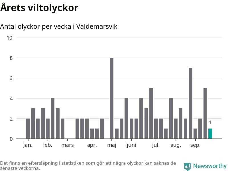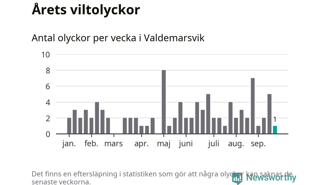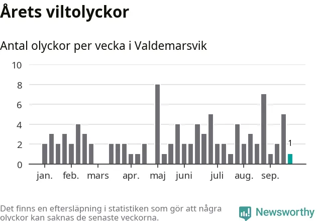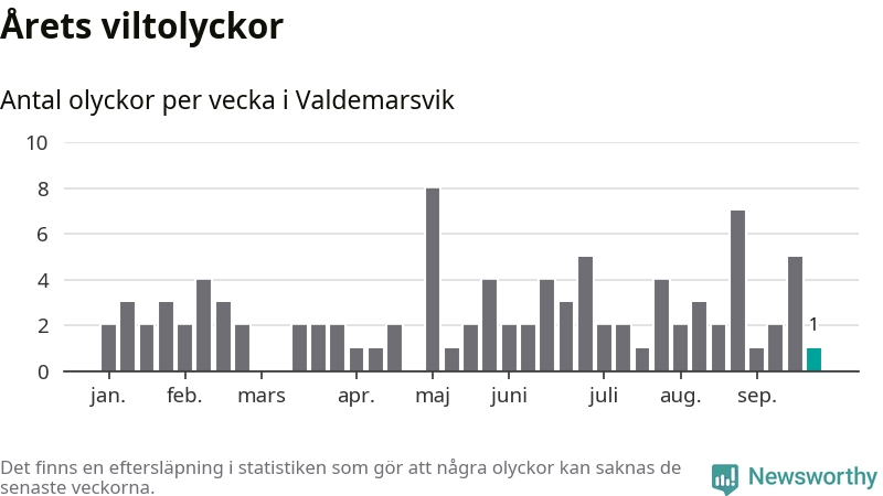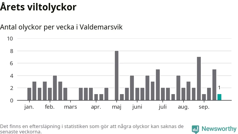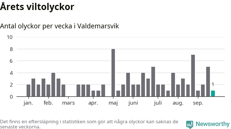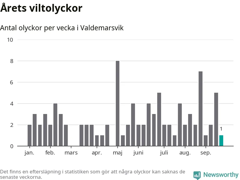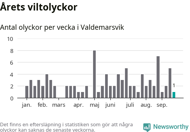 Från förra veckan (vecka 39) har hittills en viltolycka rapporterats in i Valdemarsviks kommun.