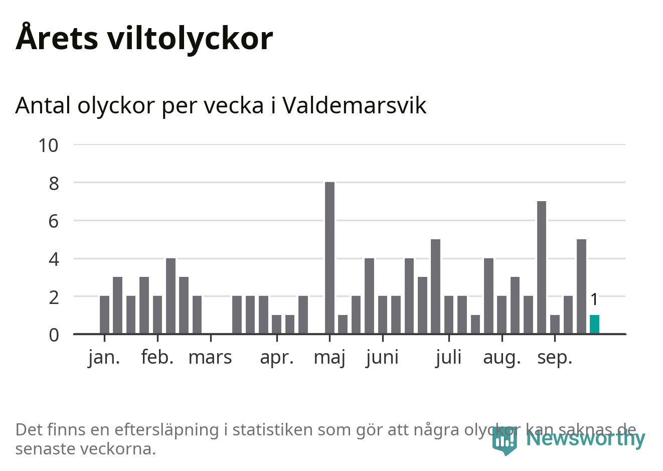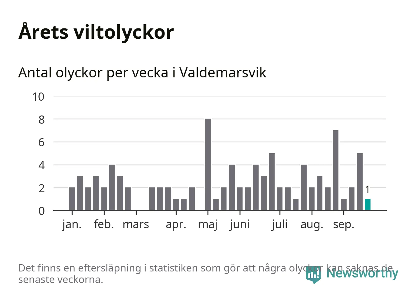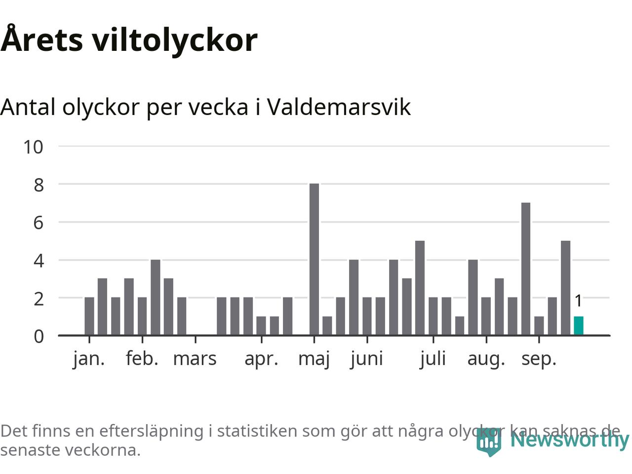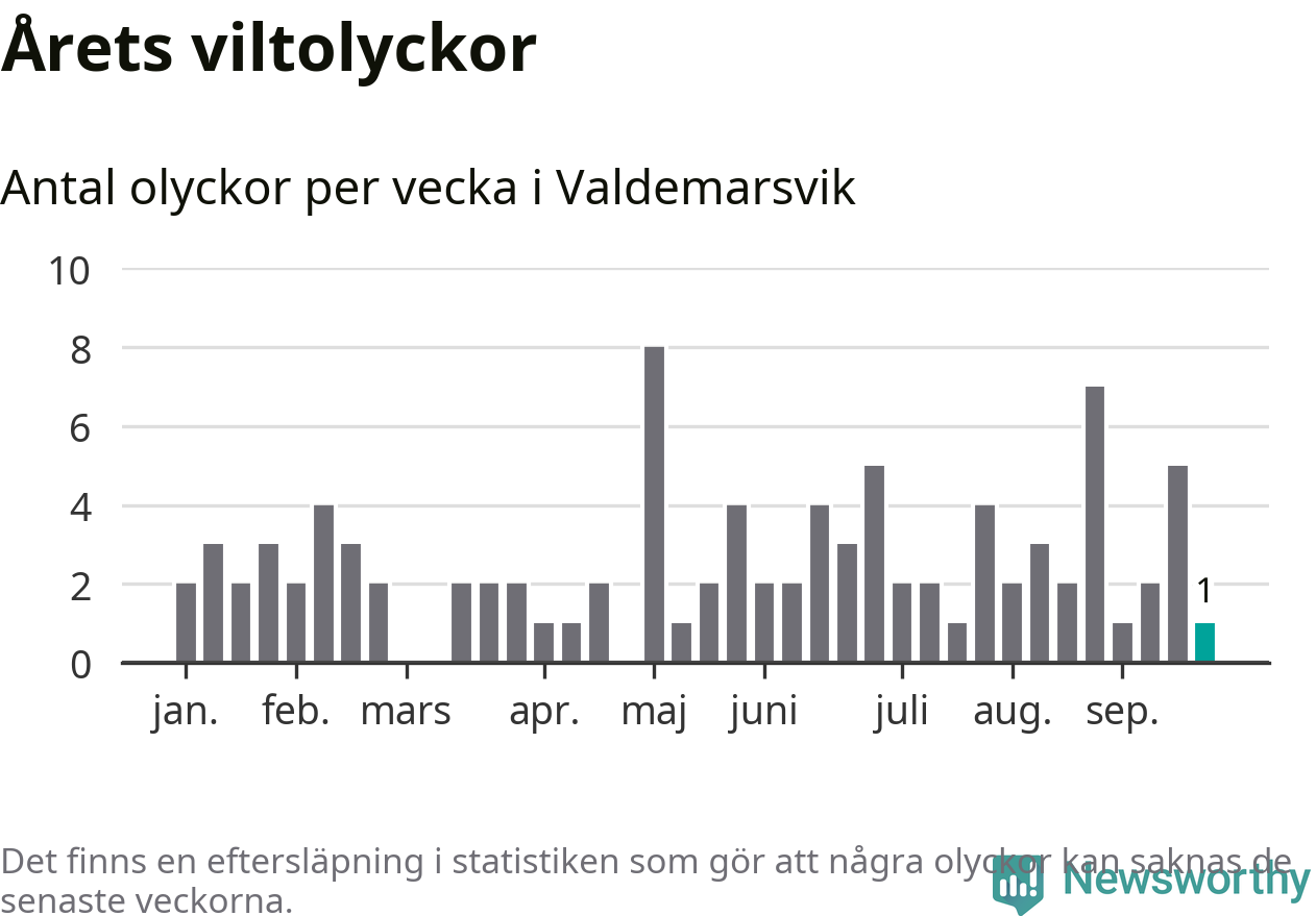 Från förra veckan (vecka 39) har hittills en viltolycka rapporterats in i Valdemarsviks kommun.