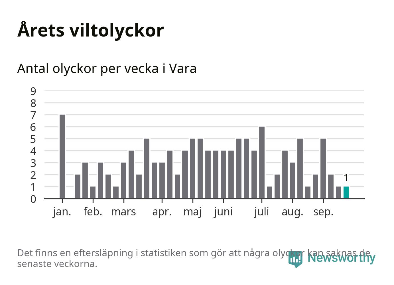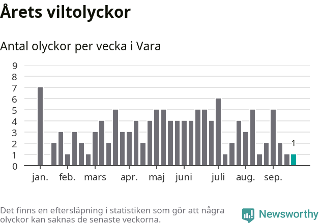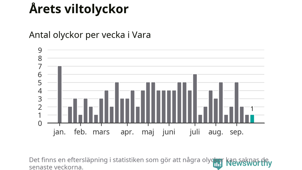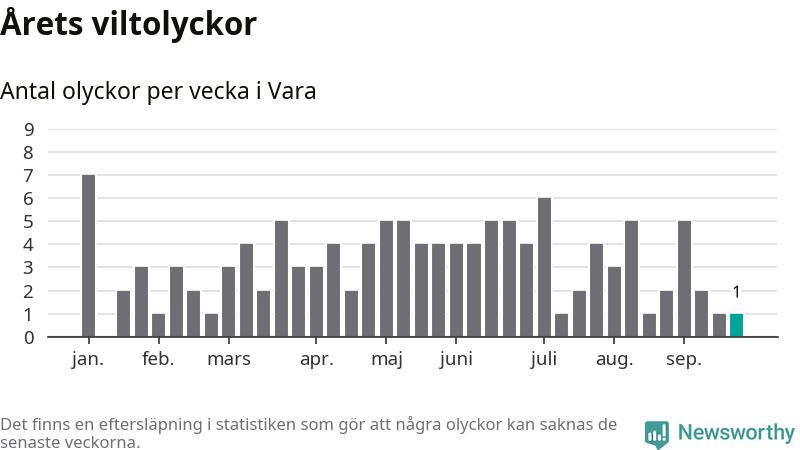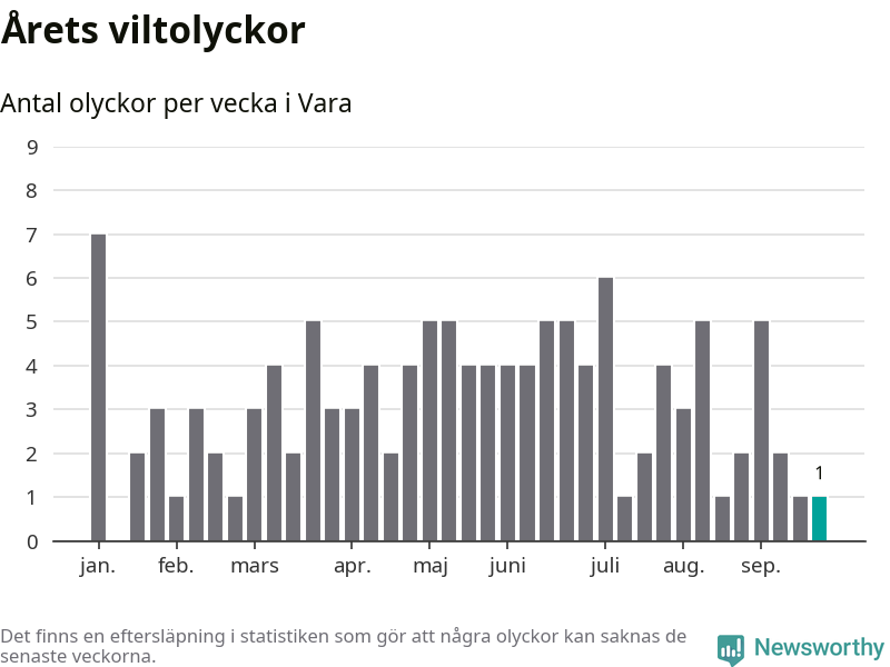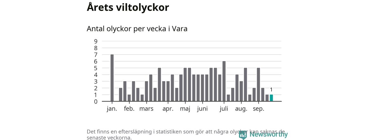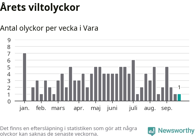 Från förra veckan (vecka 39) har hittills en viltolycka rapporterats in i Vara kommun.
