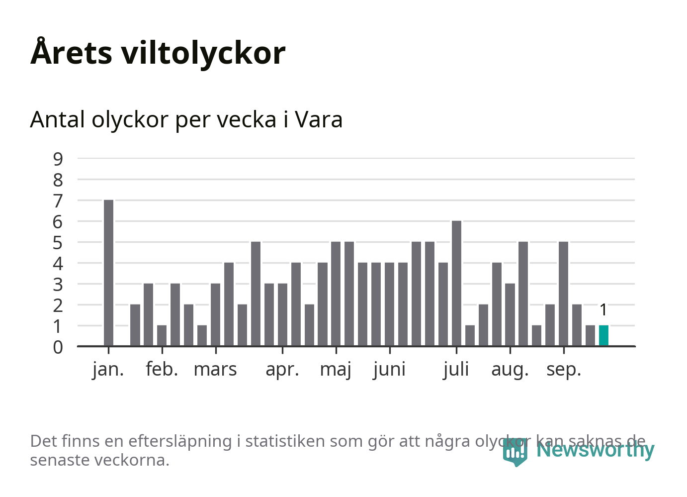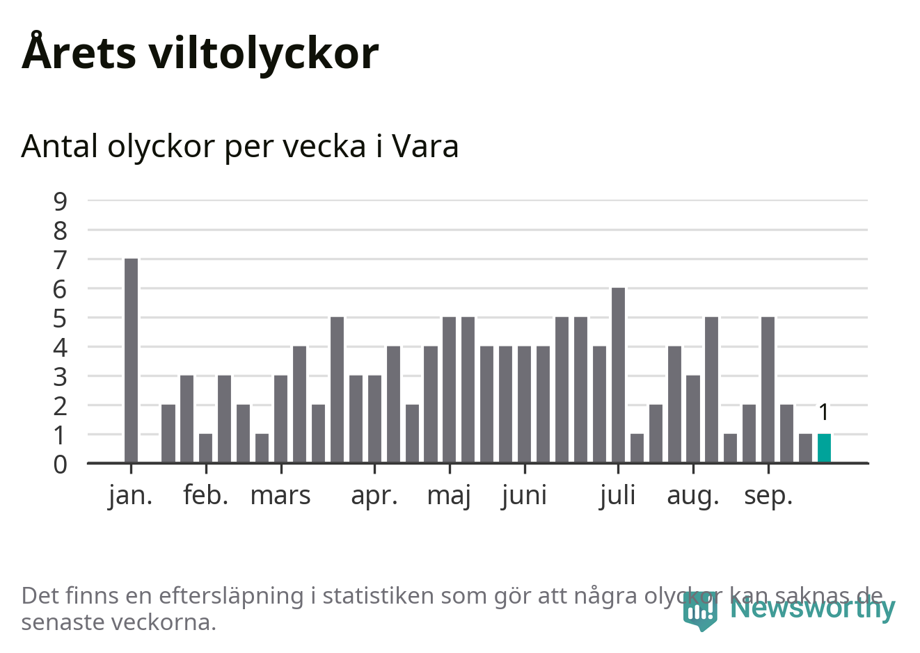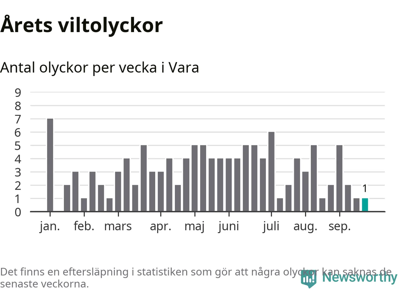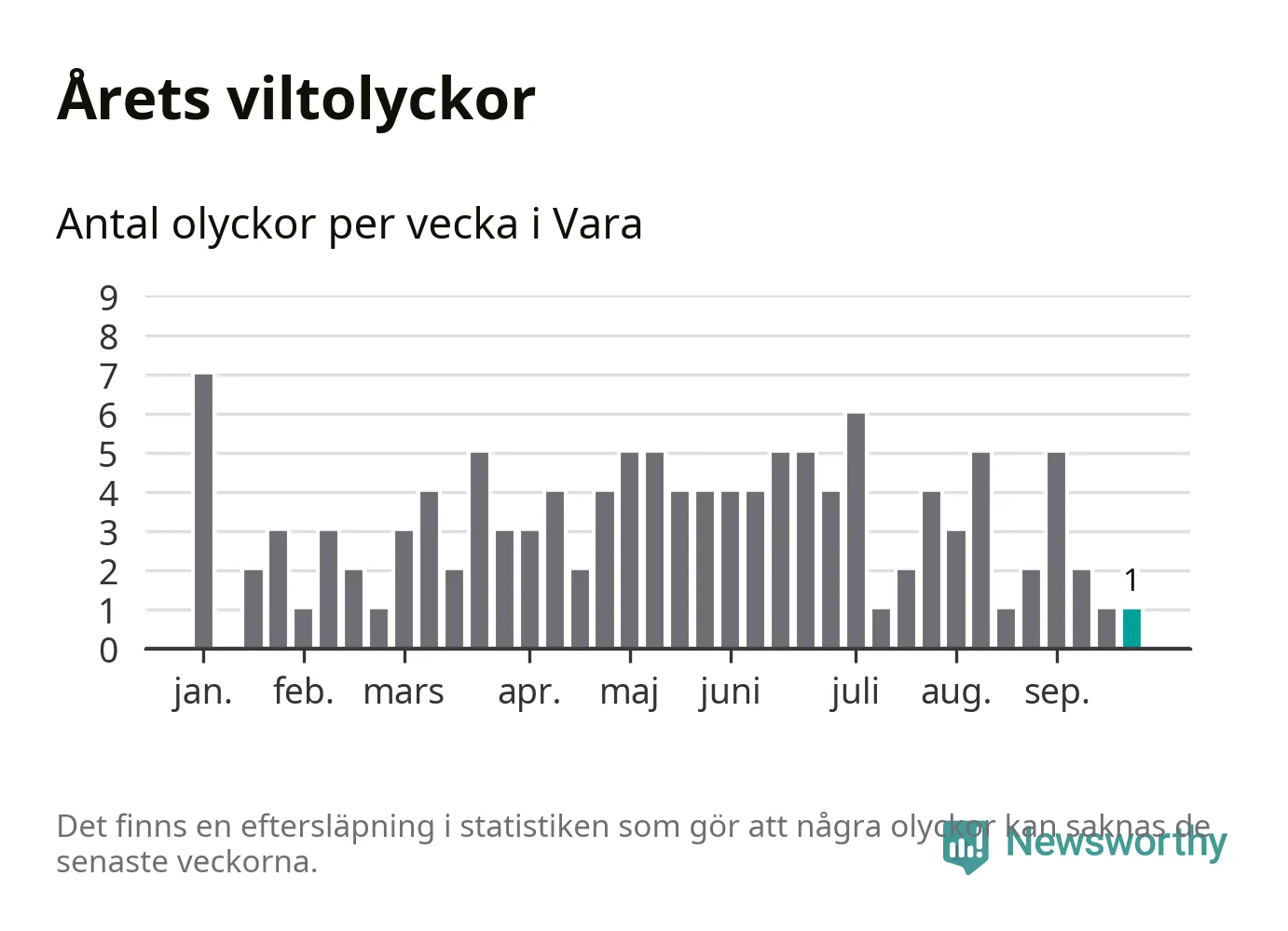 Från förra veckan (vecka 39) har hittills en viltolycka rapporterats in i Vara kommun.