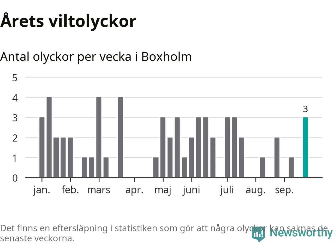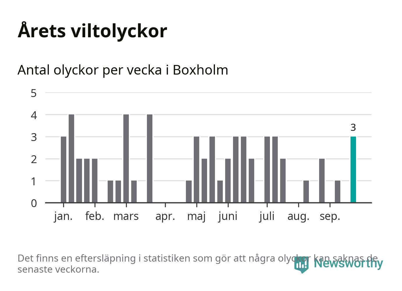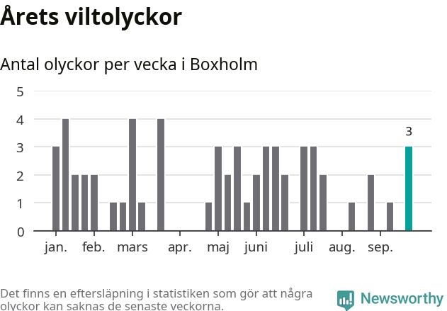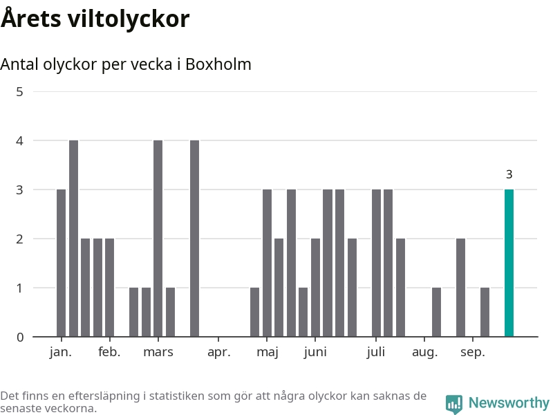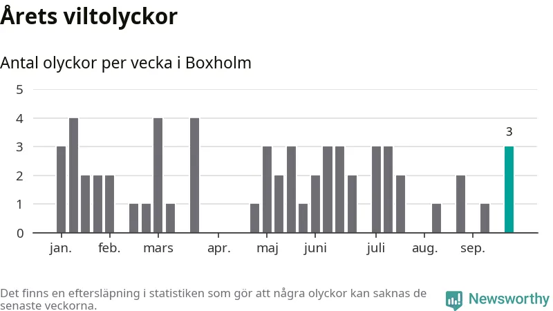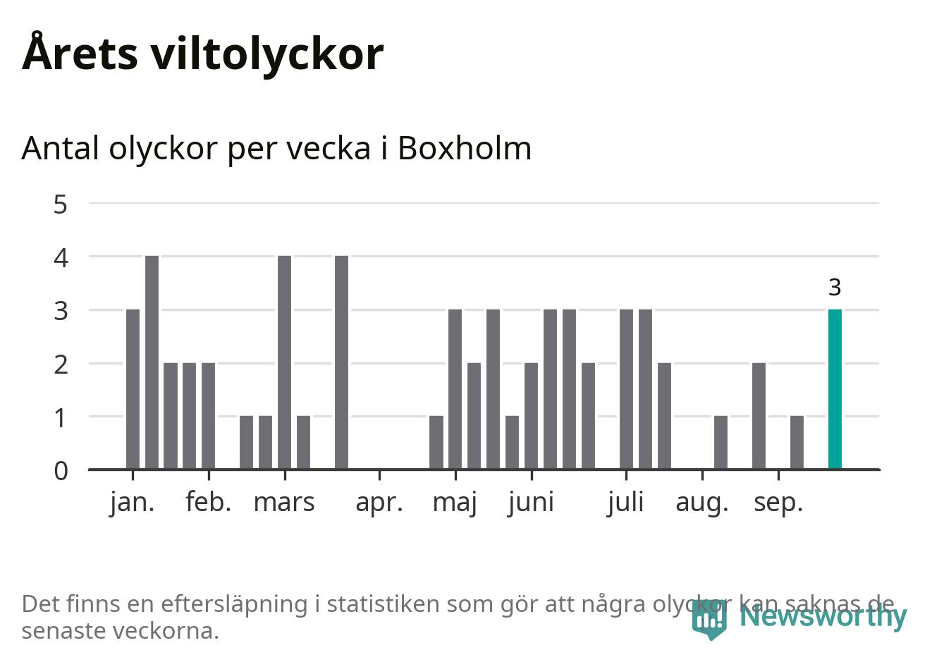 Hittills har tre viltolyckor rapporterats in i Boxholms kommun från vecka 39. Se listan här.