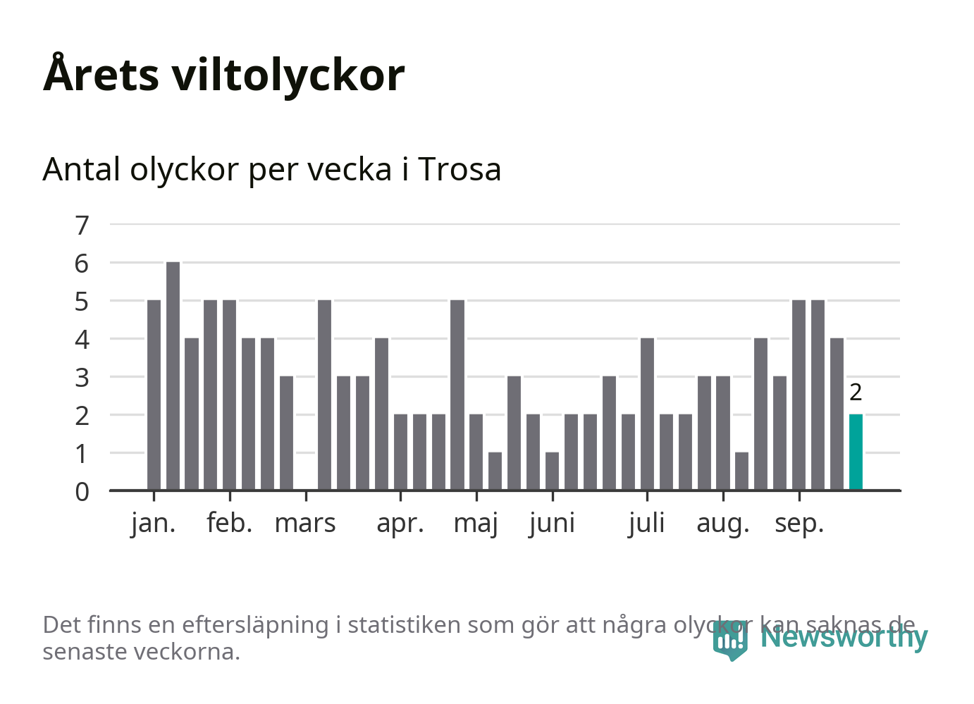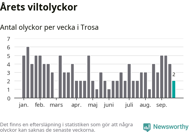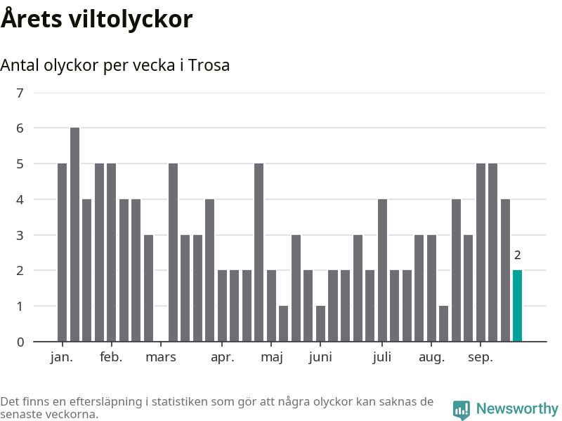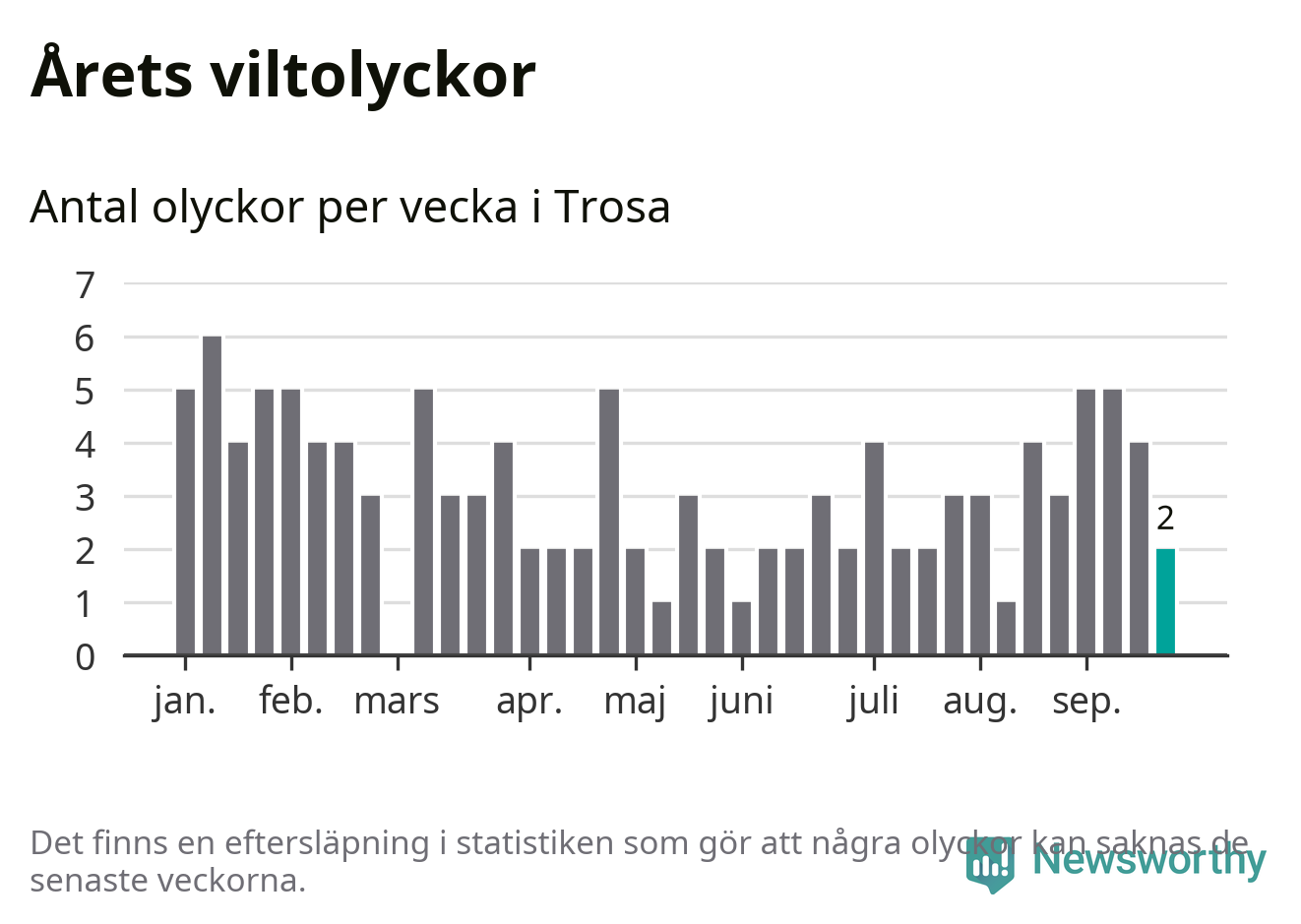 Hittills har två viltolyckor rapporterats in i Trosa kommun från vecka 39. Se listan här.