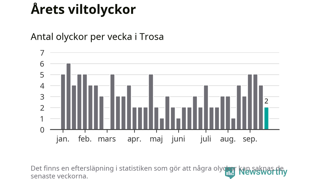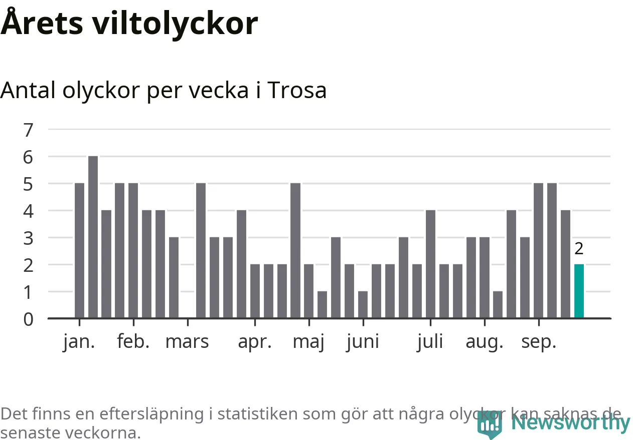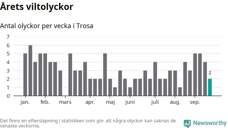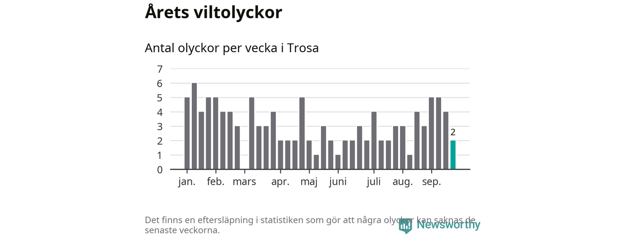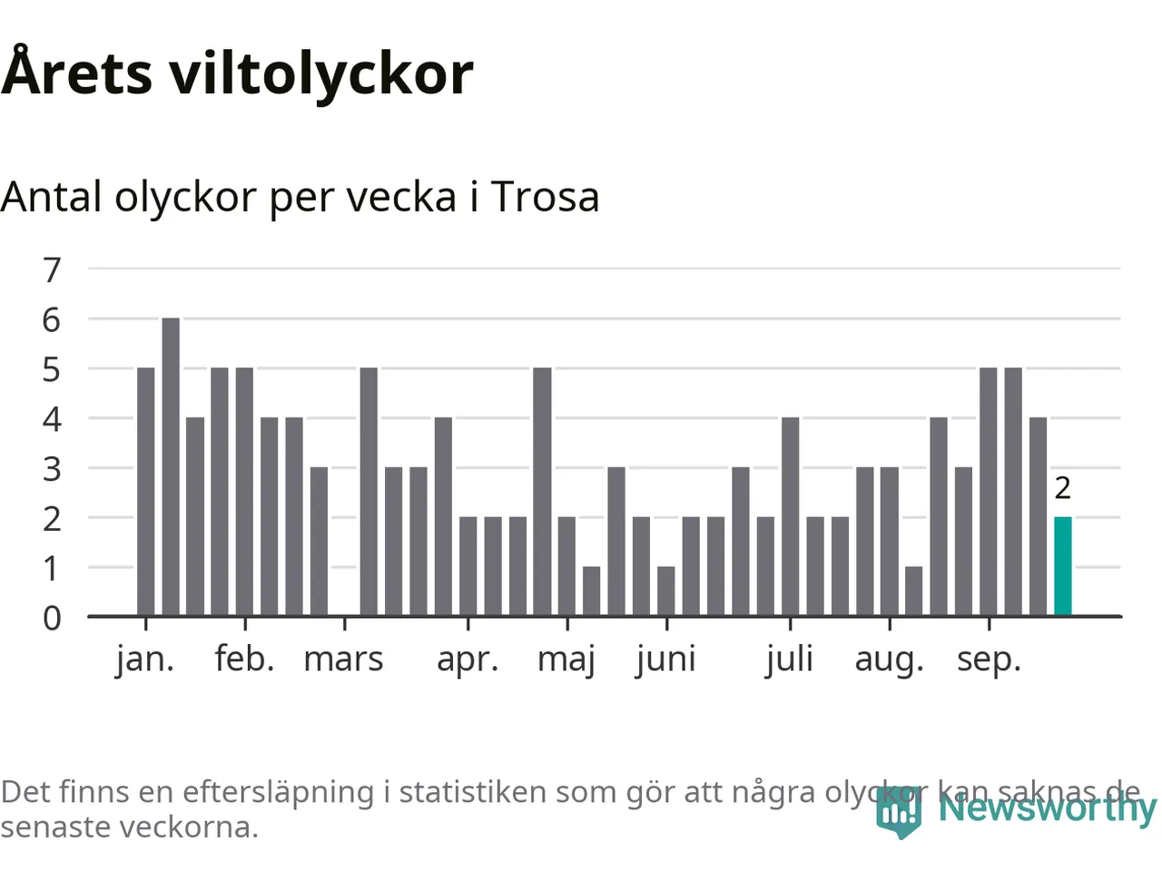 Hittills har två viltolyckor rapporterats in i Trosa kommun från vecka 39. Se listan här.