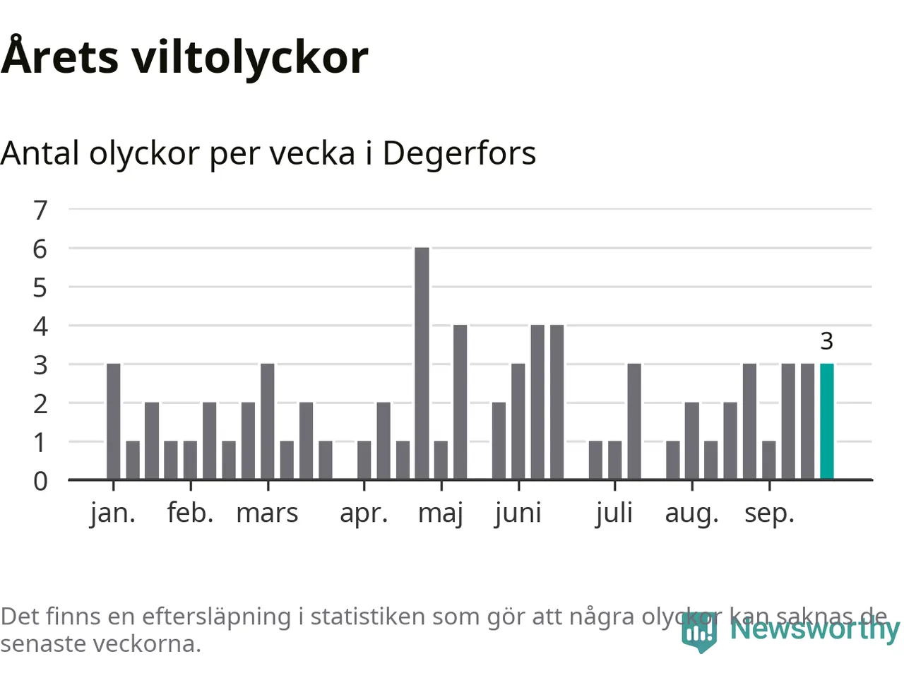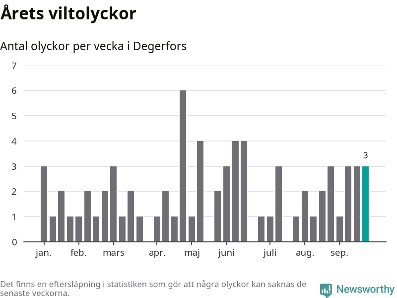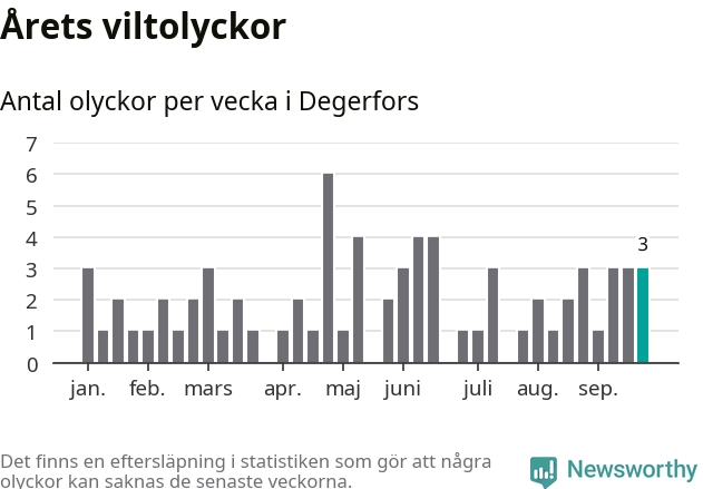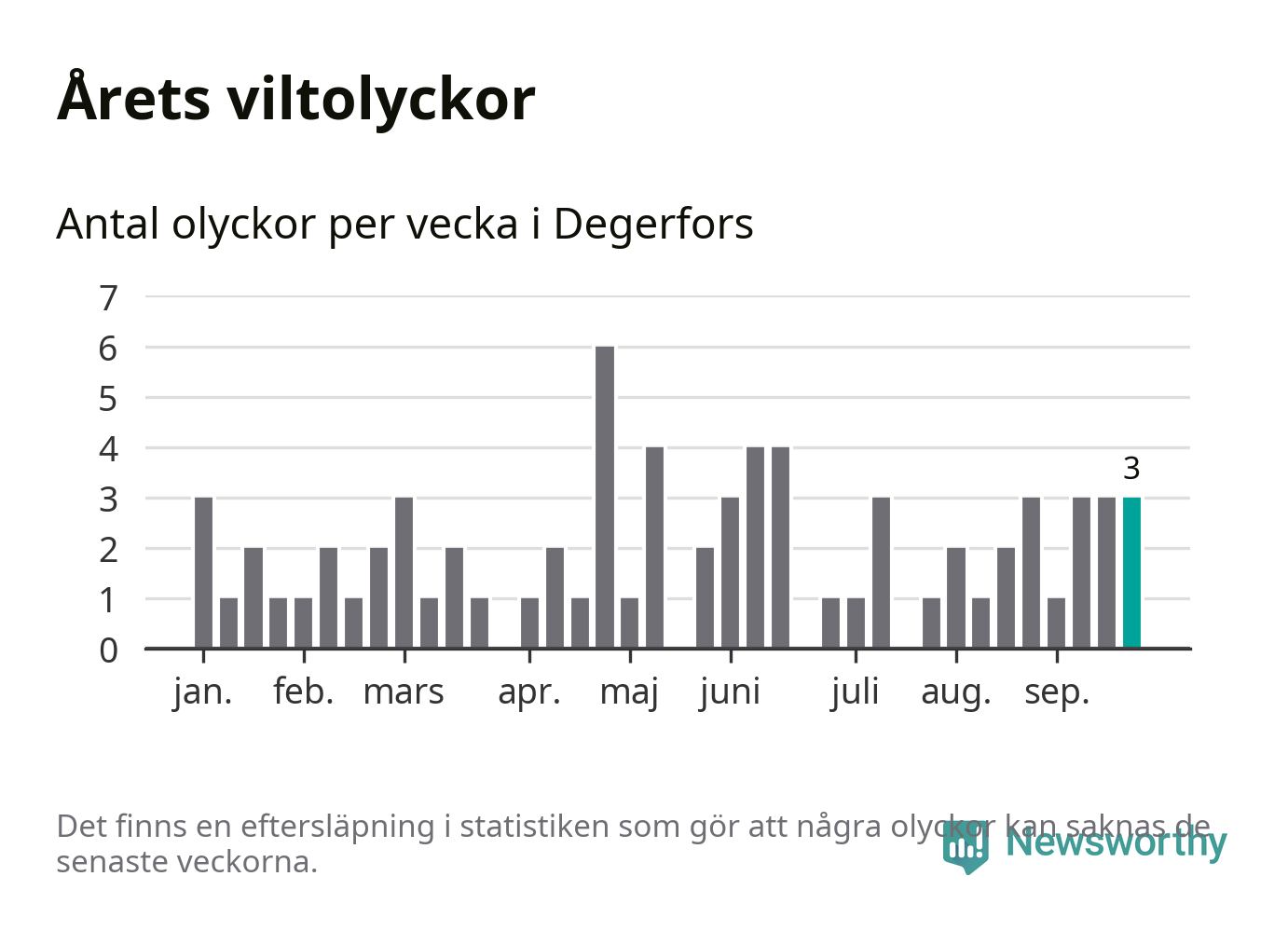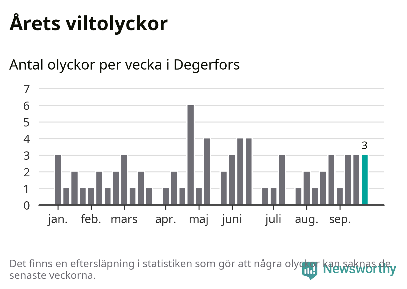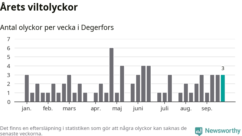 Hittills har tre viltolyckor rapporterats in i Degerfors kommun från vecka 39. Se listan här.