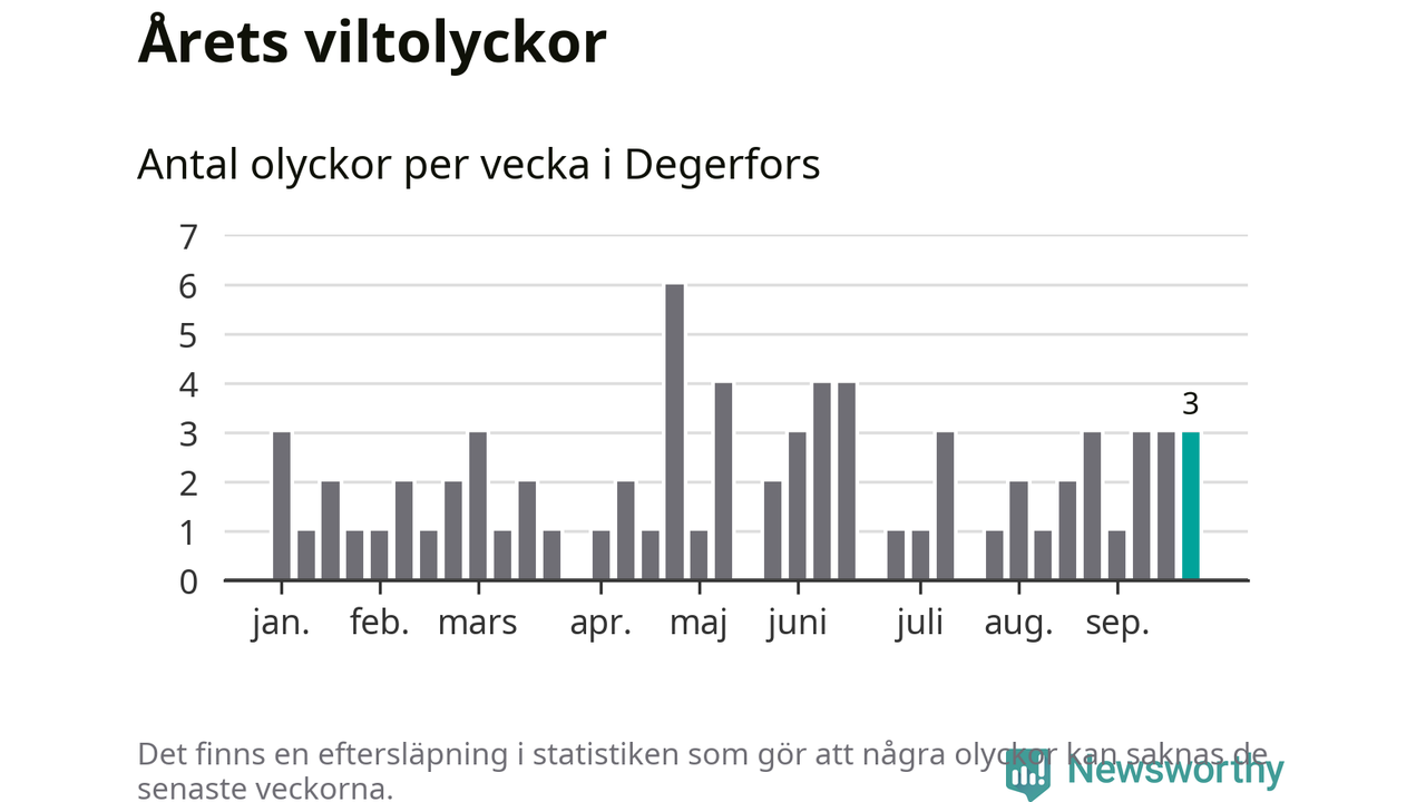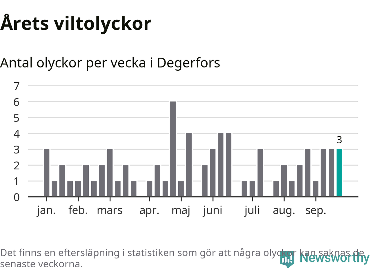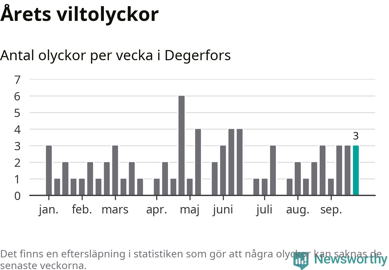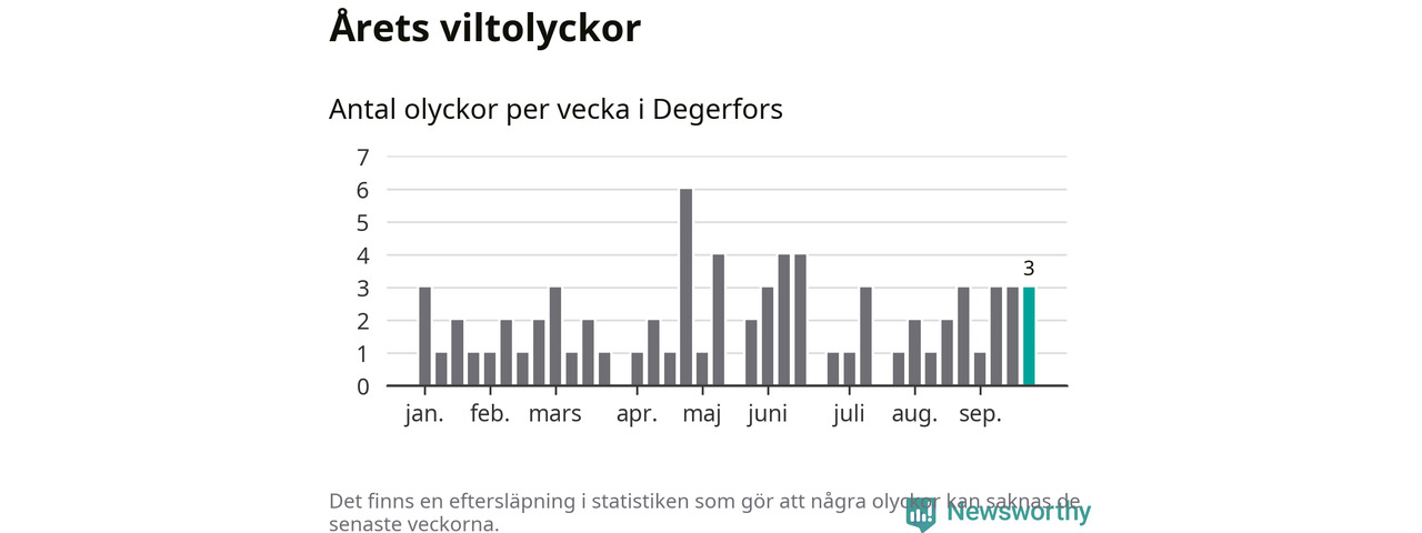 Hittills har tre viltolyckor rapporterats in i Degerfors kommun från vecka 39. Se listan här.