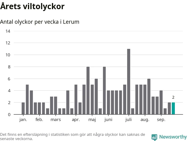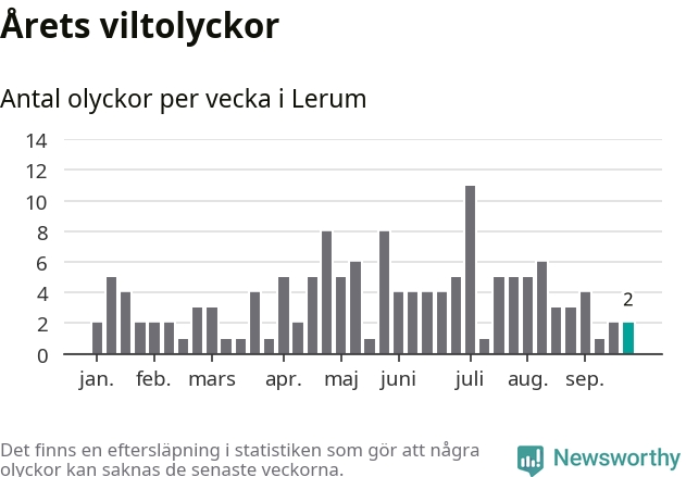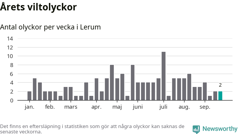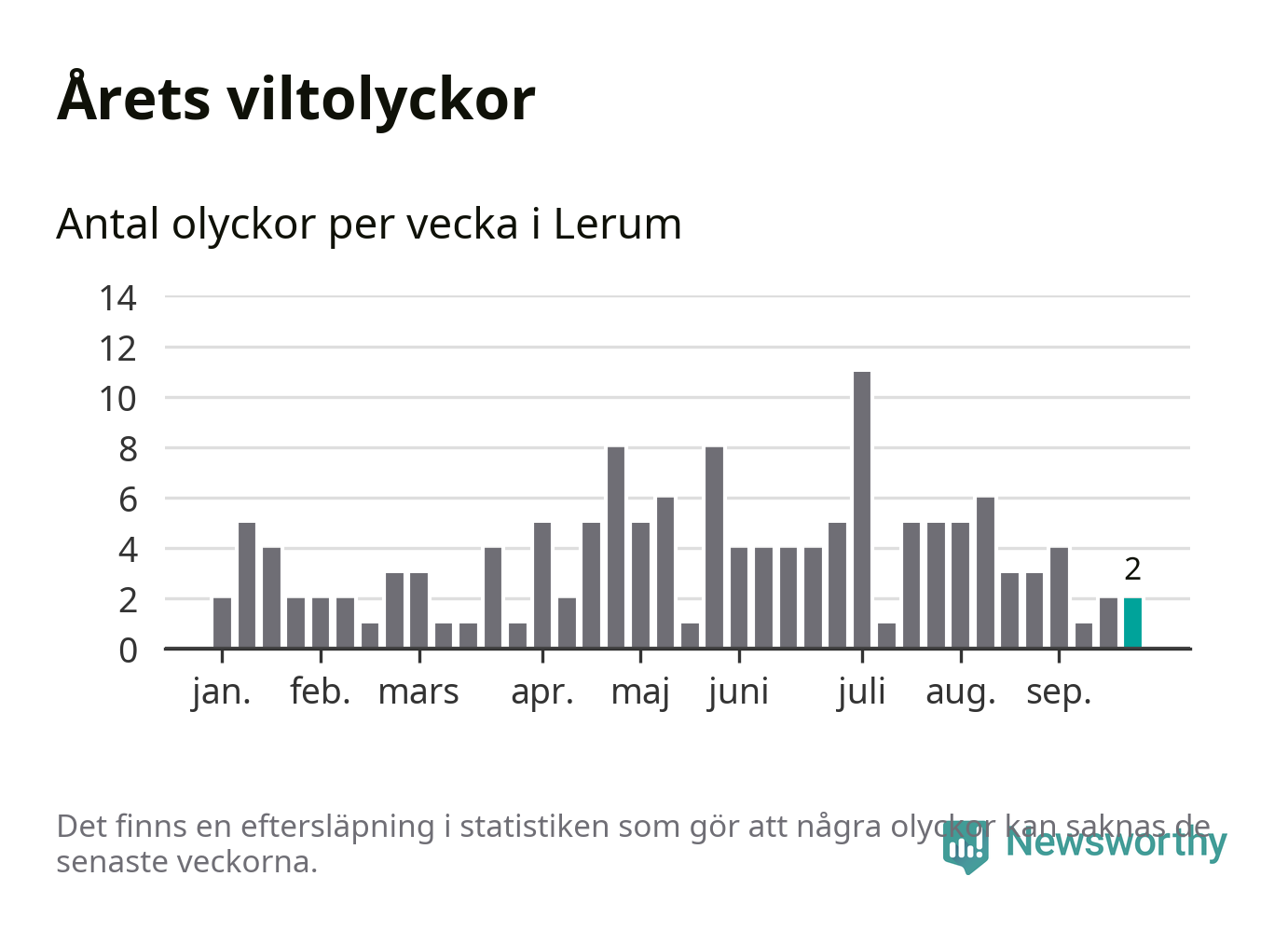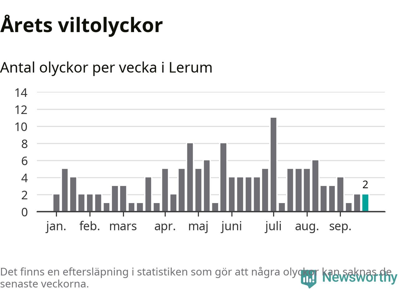 Hittills har två viltolyckor rapporterats in i Lerums kommun från vecka 39. Se listan här.