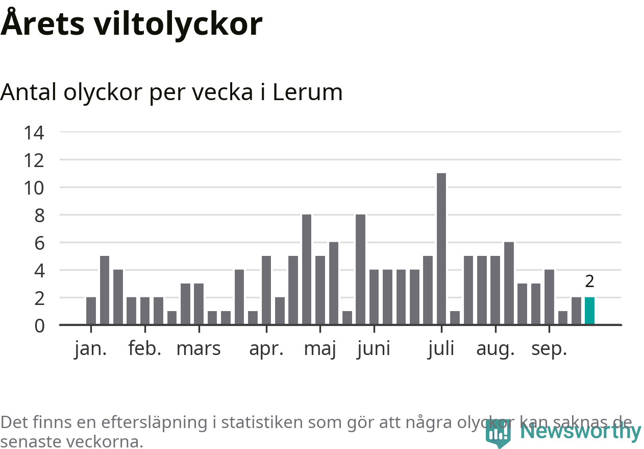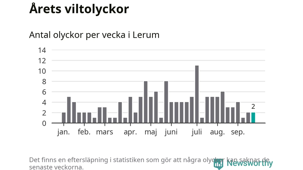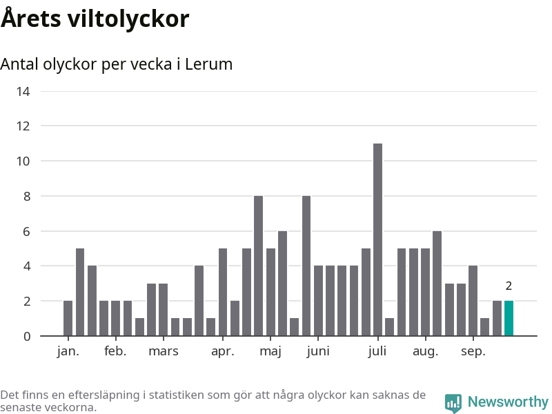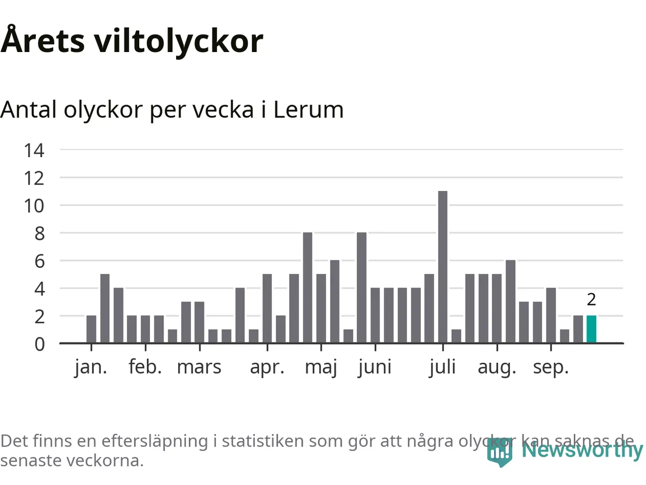 Hittills har två viltolyckor rapporterats in i Lerums kommun från vecka 39. Se listan här.