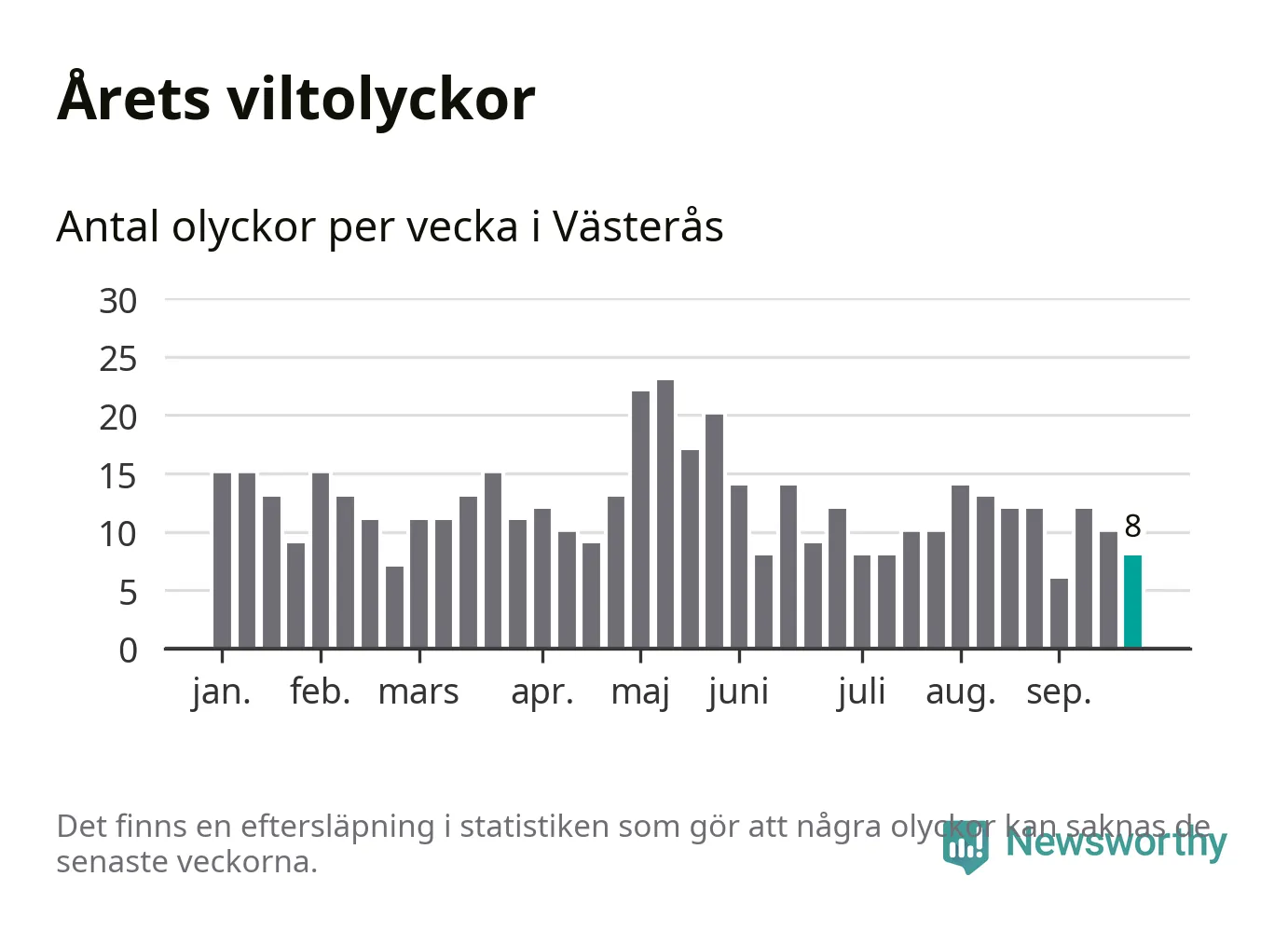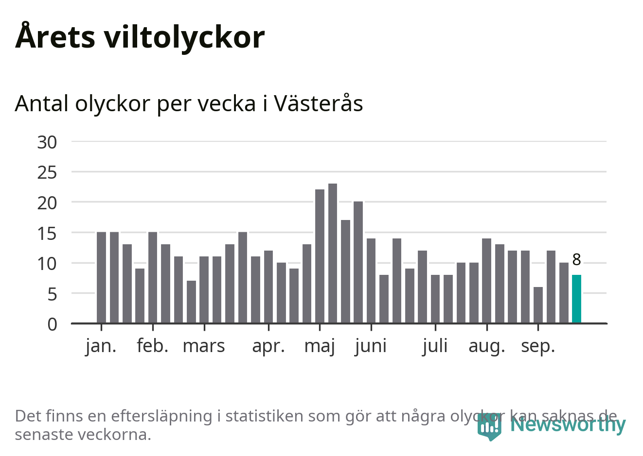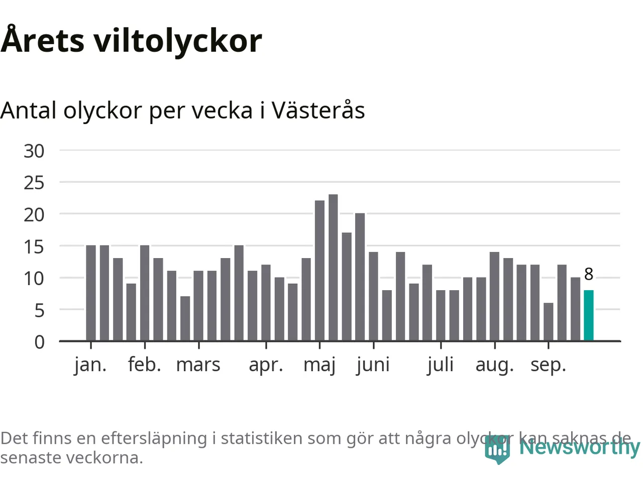 Totalt det här året har det inträffat 472 viltolyckor i kommunen. Det är mer än genomsnittet för motsvarande period (omkring 371) de senaste tio åren.