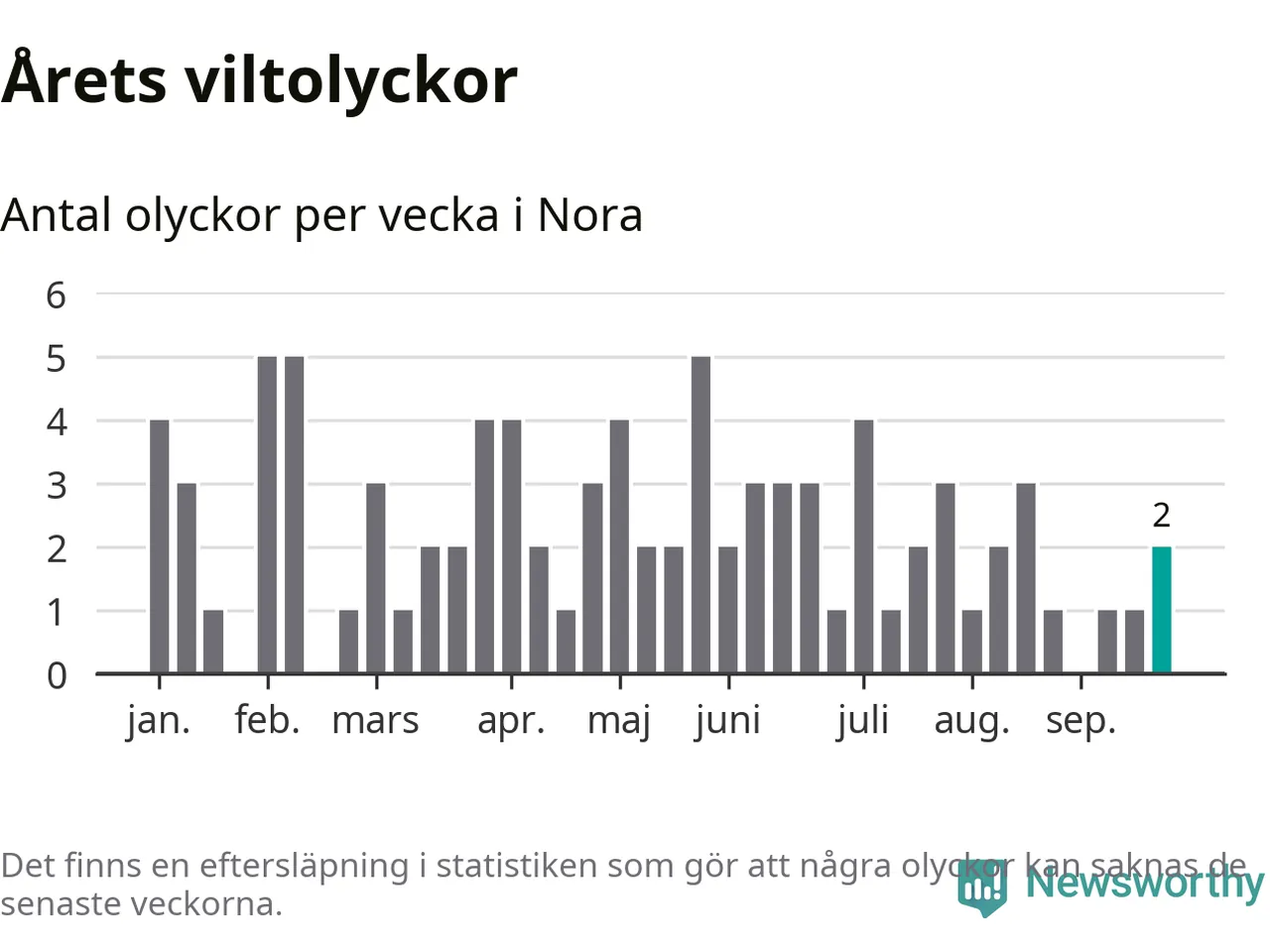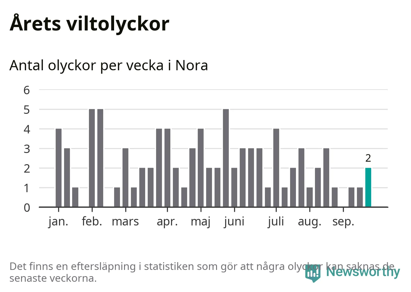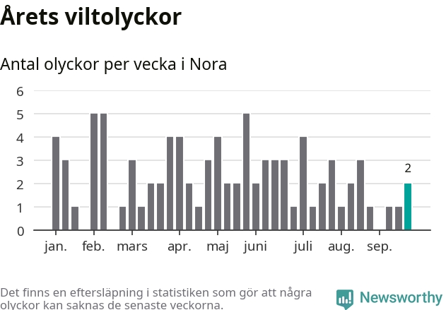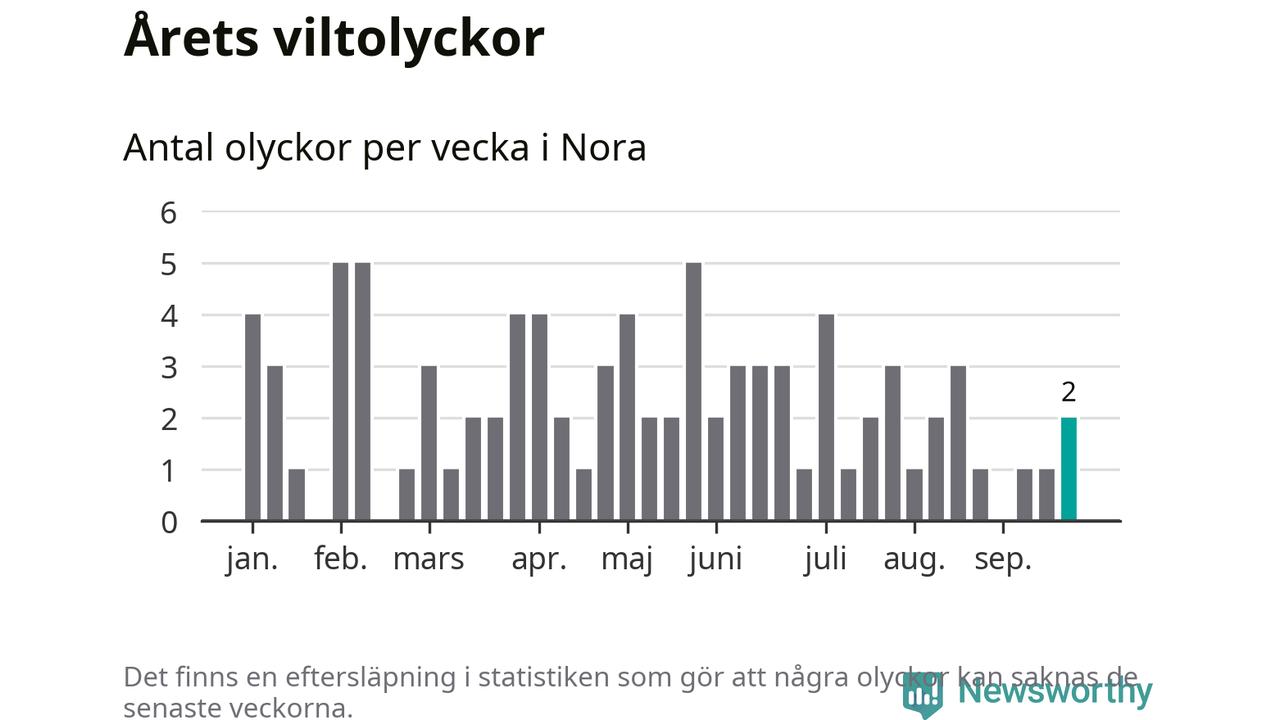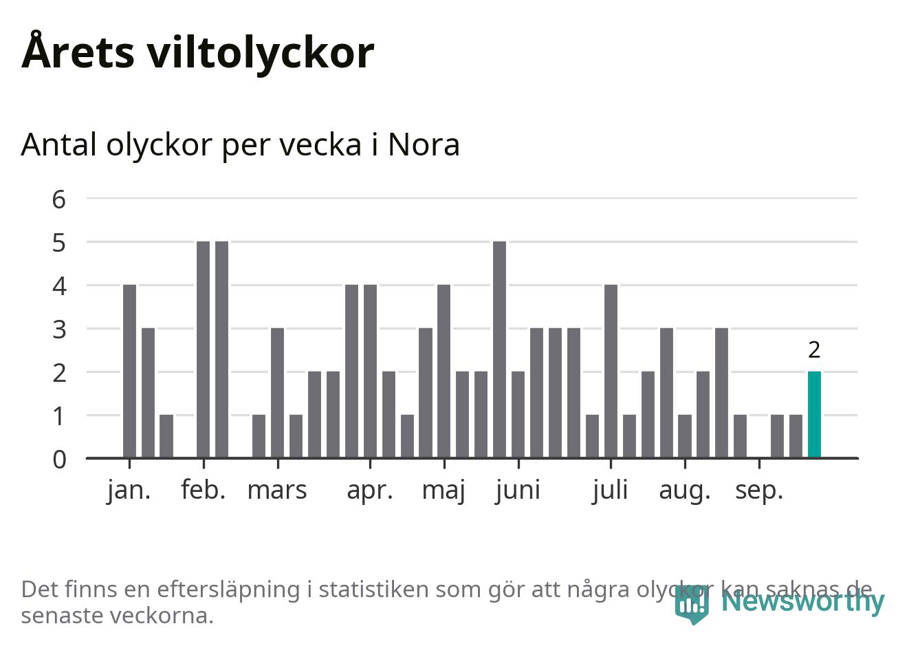 Hittills har två viltolyckor rapporterats in i Nora kommun från vecka 39. Se listan här.