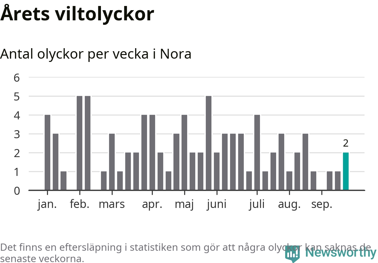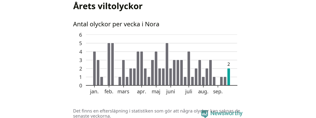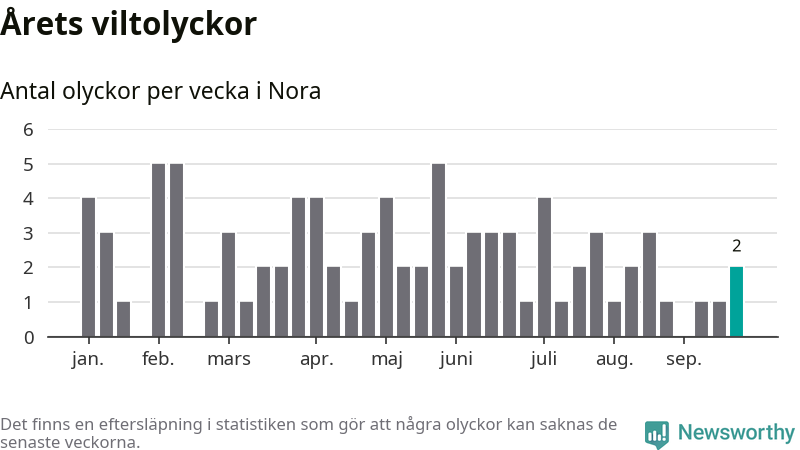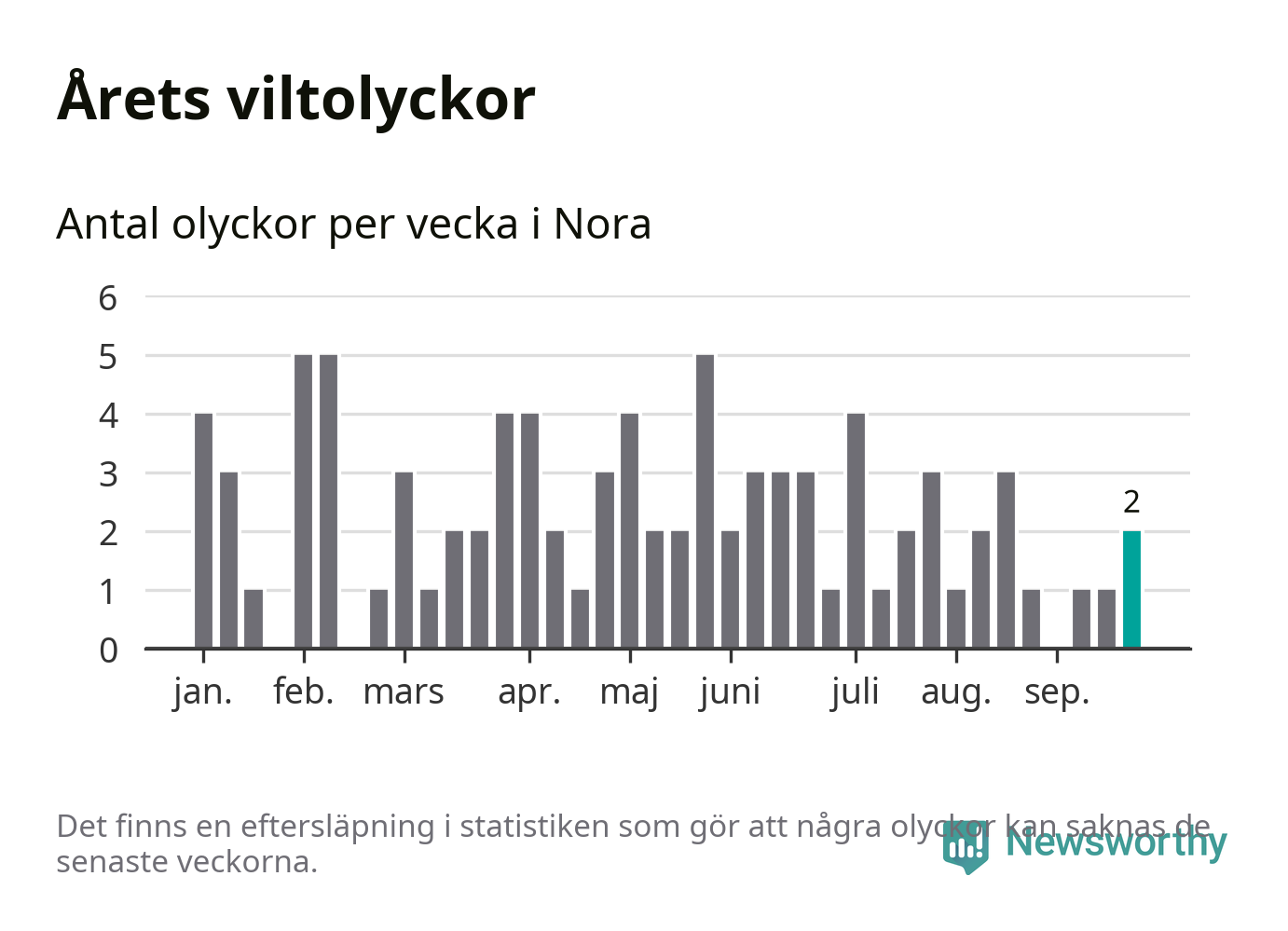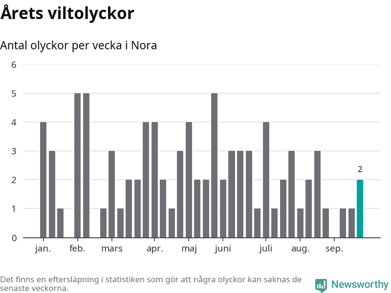 Hittills har två viltolyckor rapporterats in i Nora kommun från vecka 39. Se listan här.