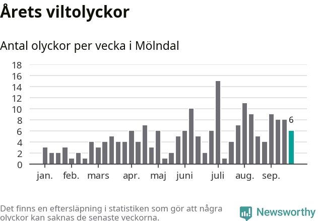Hittills har sex viltolyckor rapporterats in i Mölndals kommun från vecka 39. Se listan här.