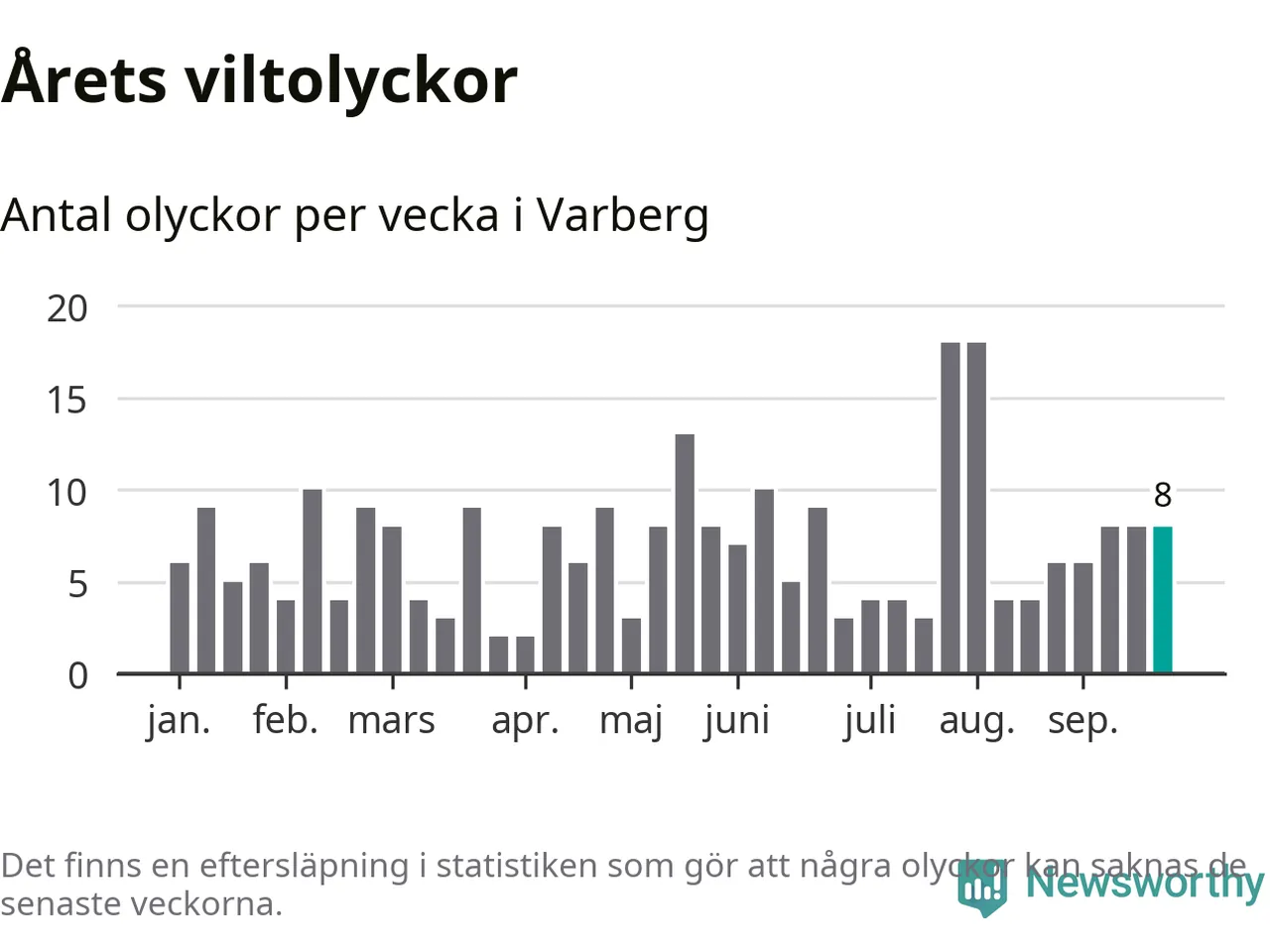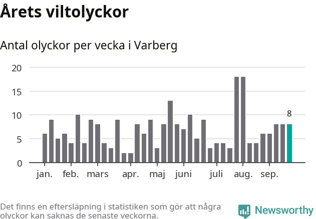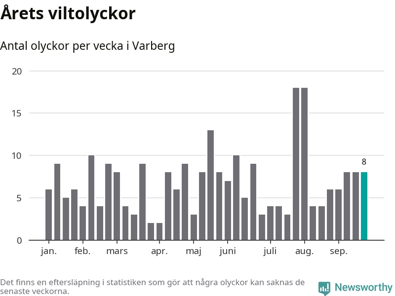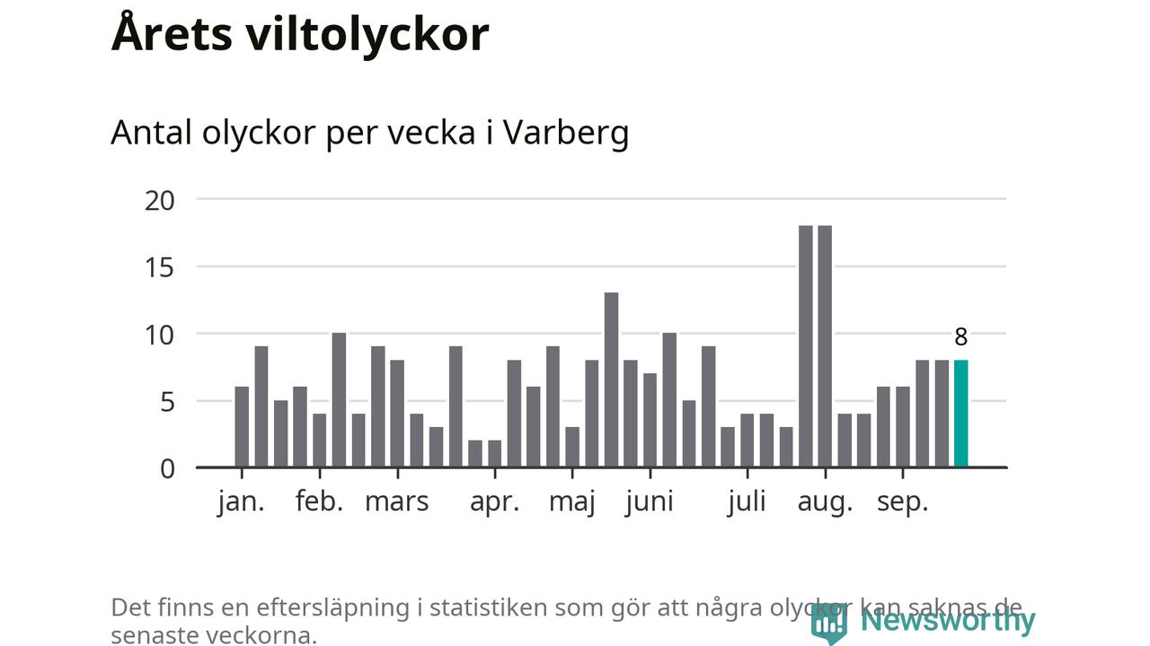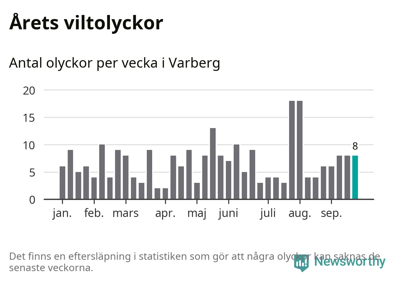Hittills har åtta viltolyckor rapporterats in i Varbergs kommun från vecka 39. Se listan här.