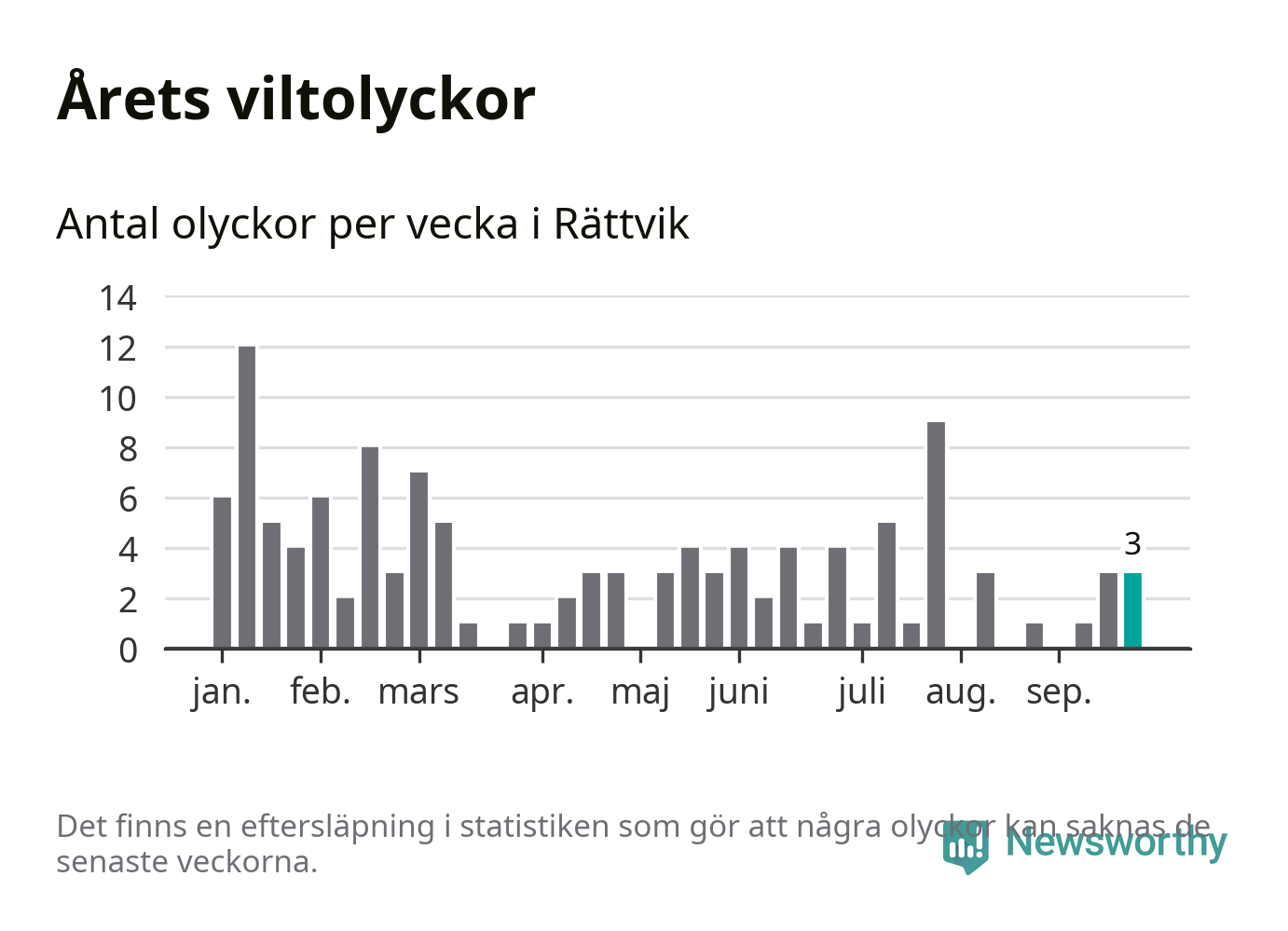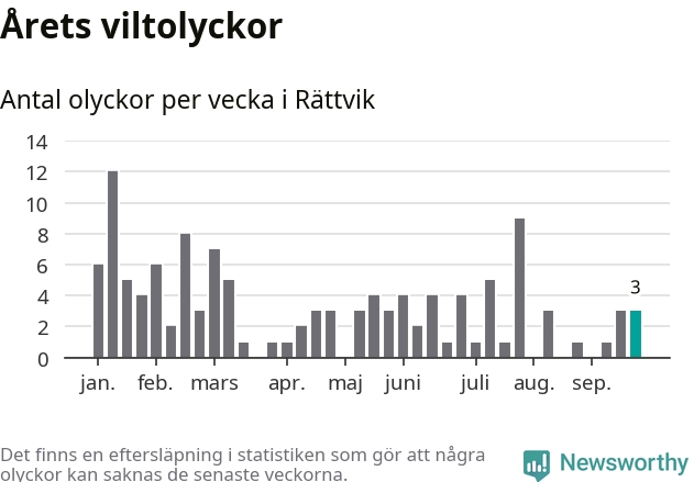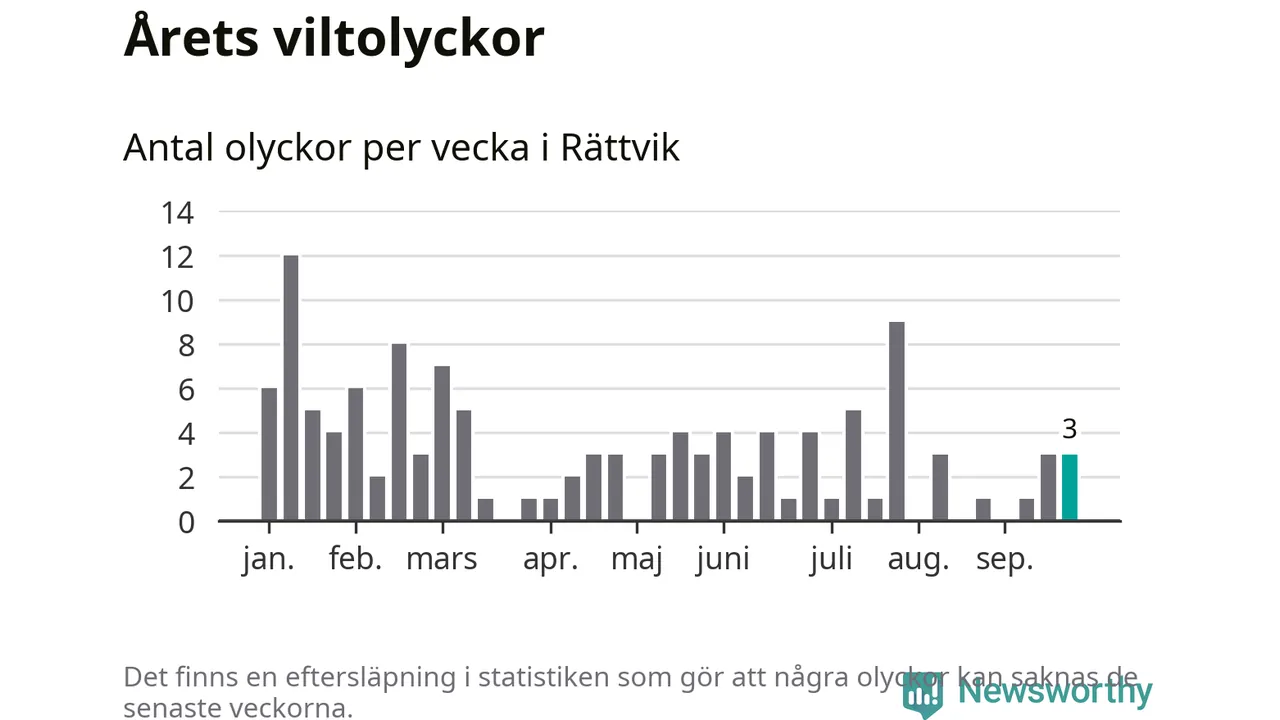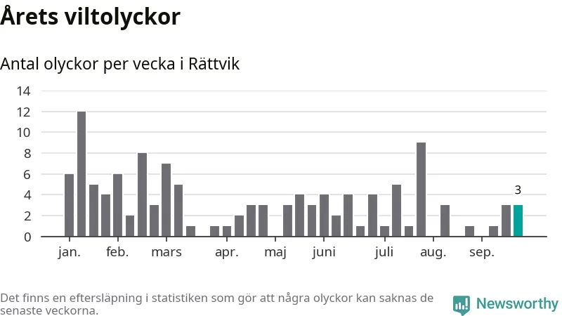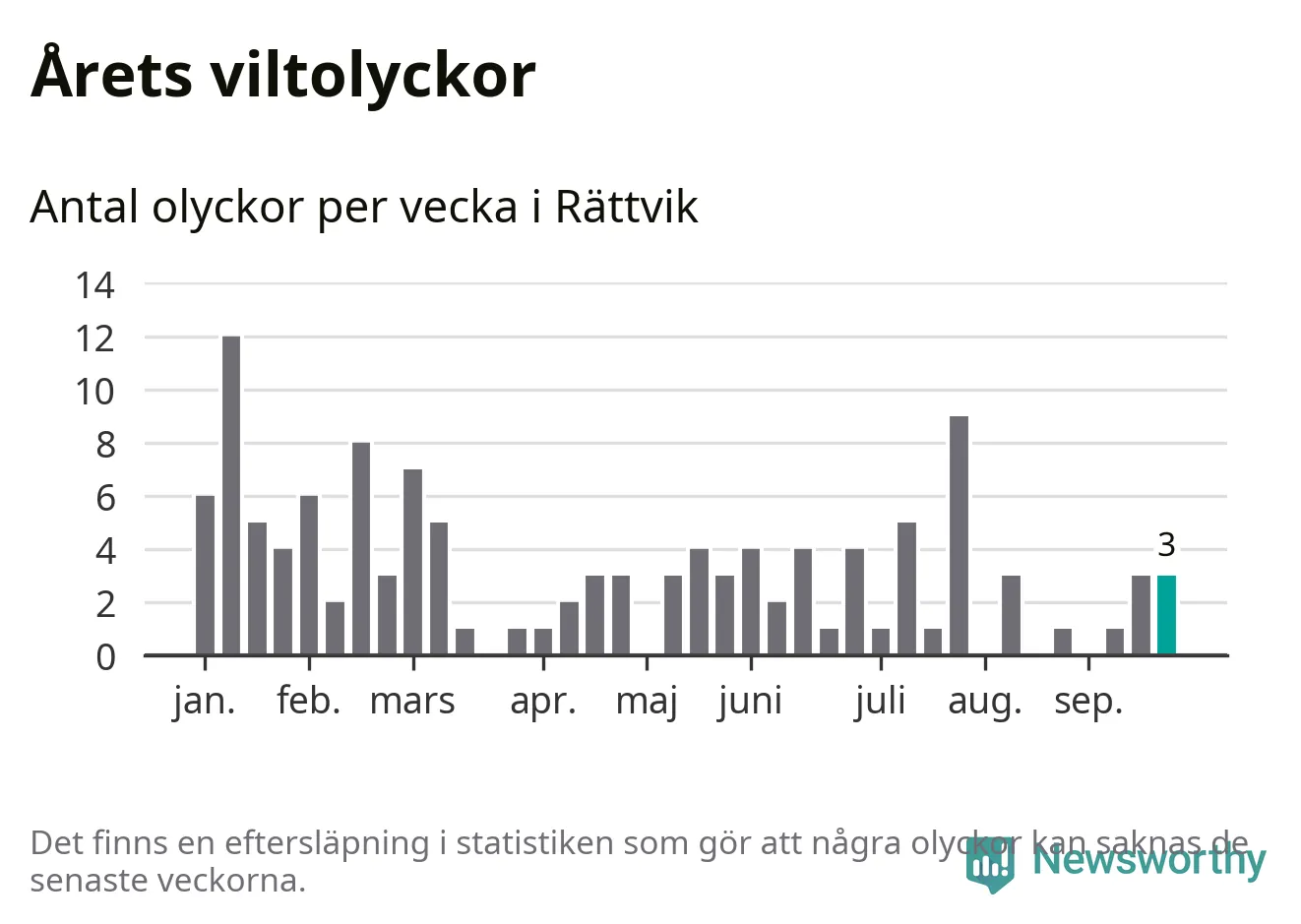 Totalt det här året har det inträffat 124 viltolyckor i kommunen. Det är en normal nivå i förhållande till hur det har sett ut under de senaste tio åren – genomsnittet för motsvarande period är 122.