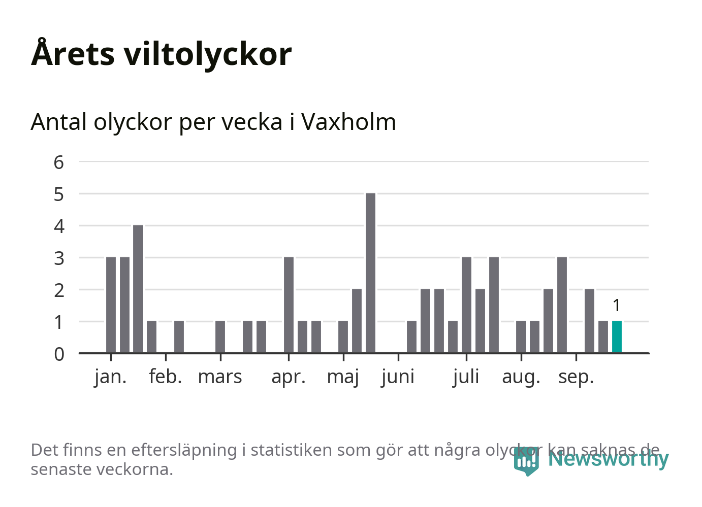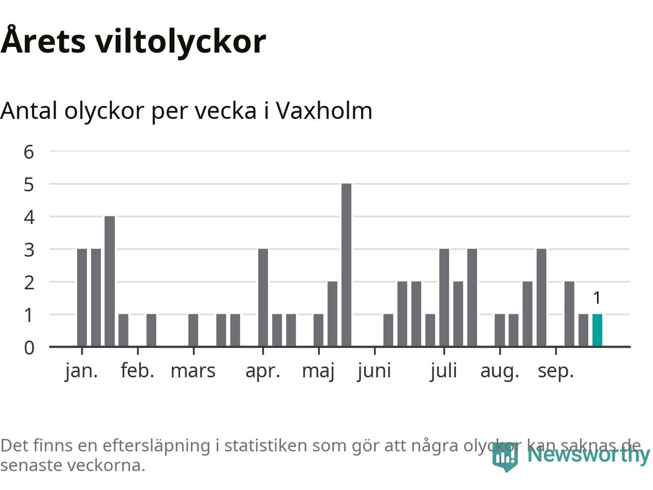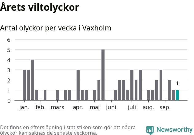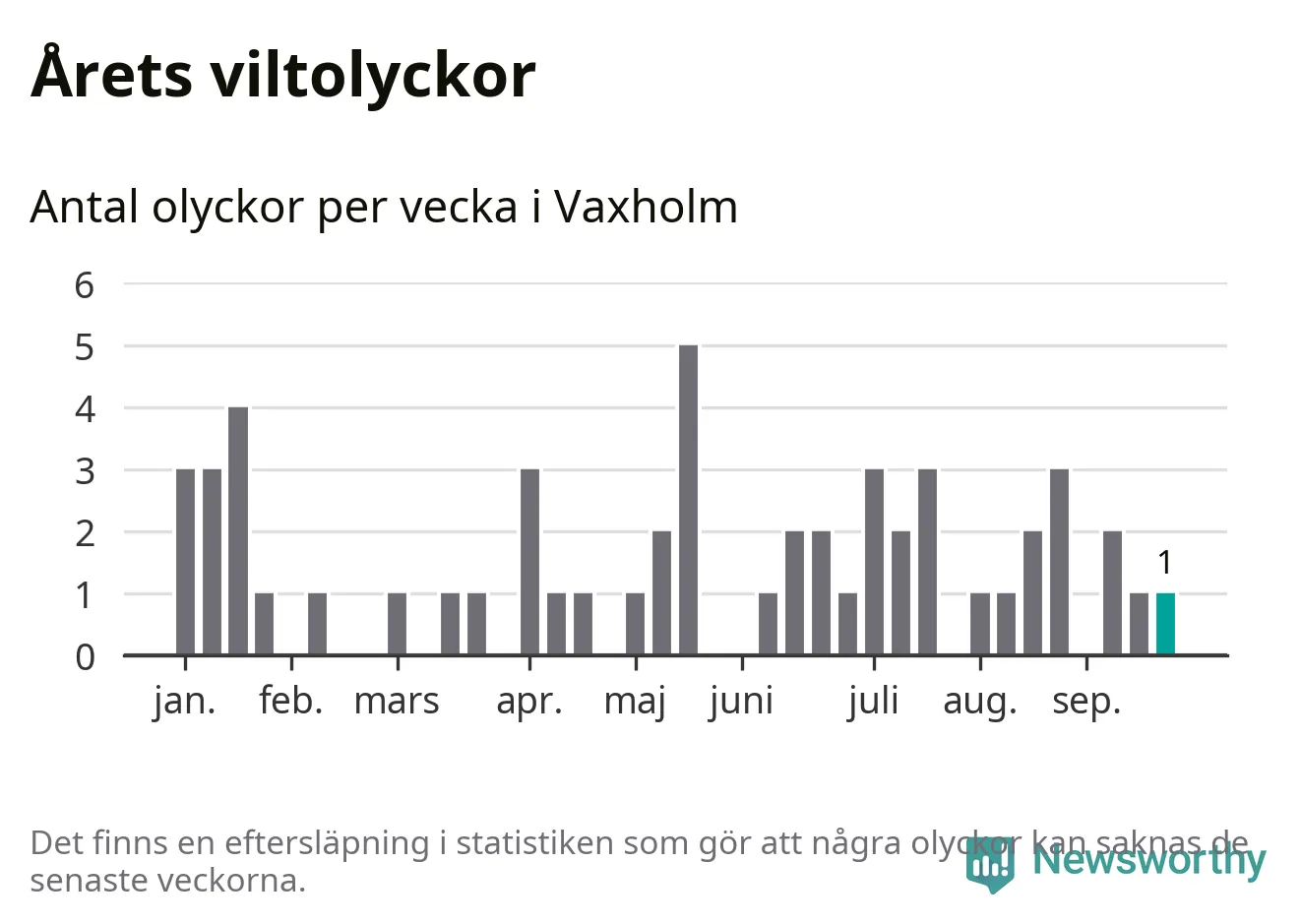 Från förra veckan (vecka 39) har hittills en viltolycka rapporterats in i Vaxholms kommun.