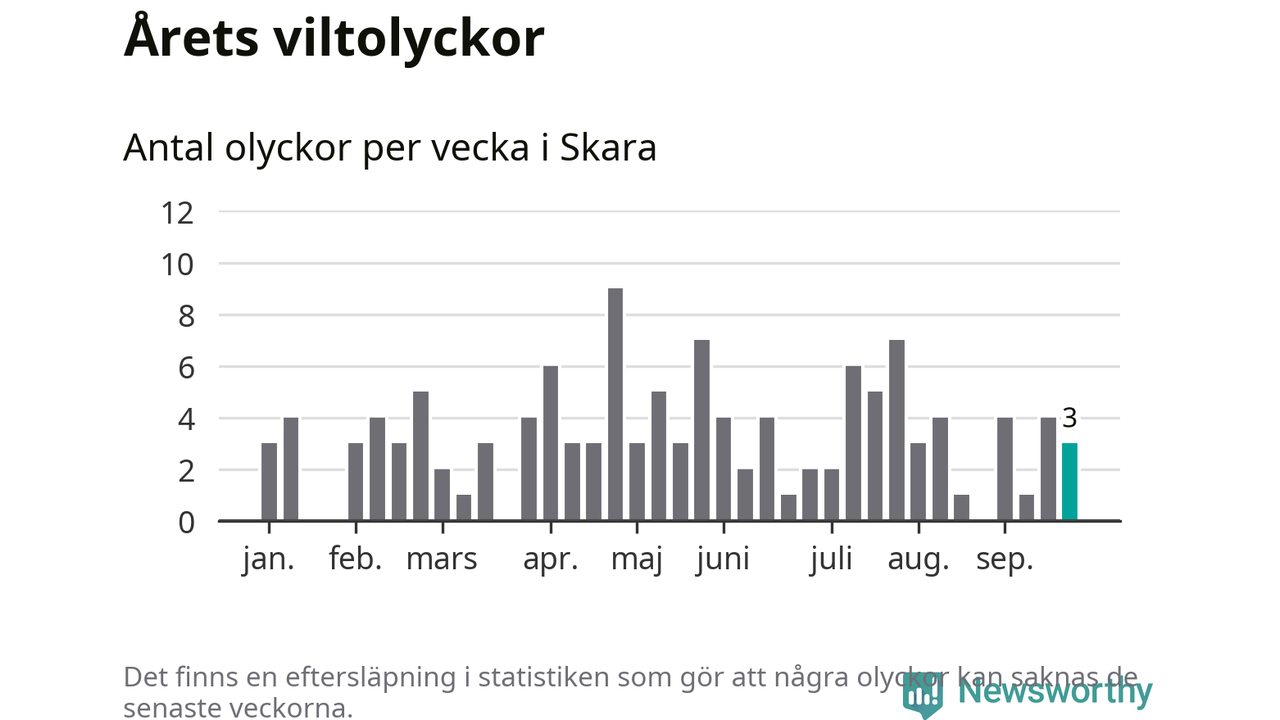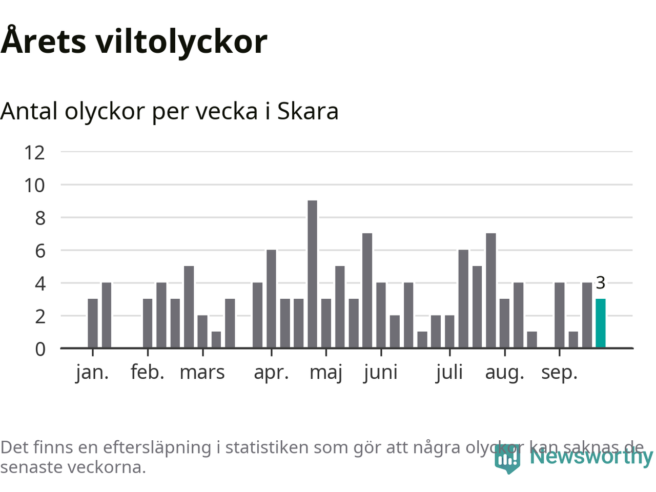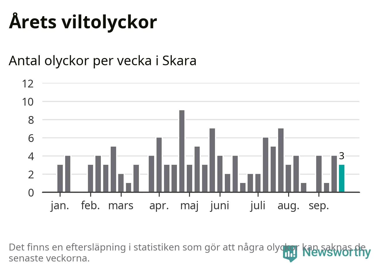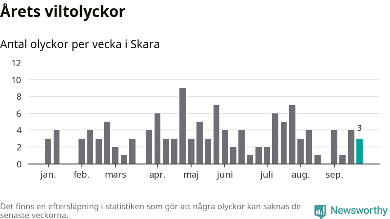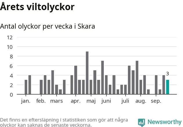 Hittills har tre viltolyckor rapporterats in i Skara kommun från vecka 39. Se listan här.