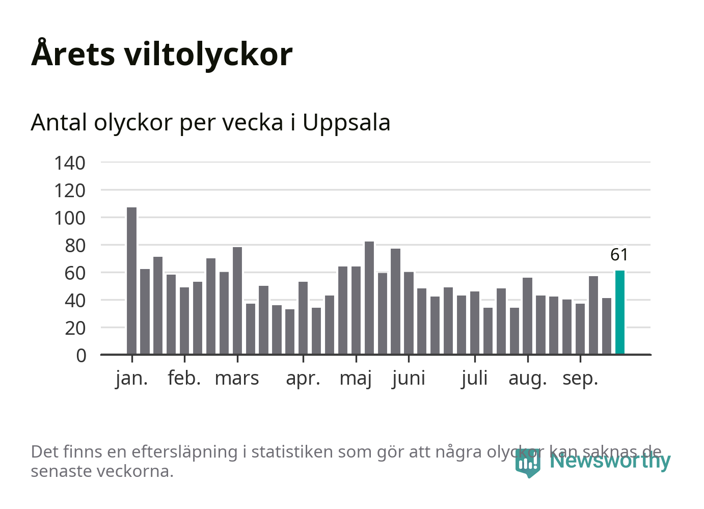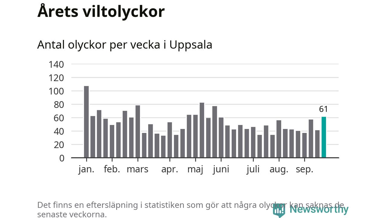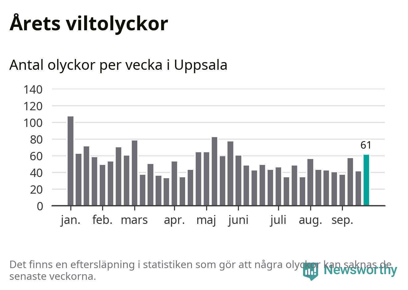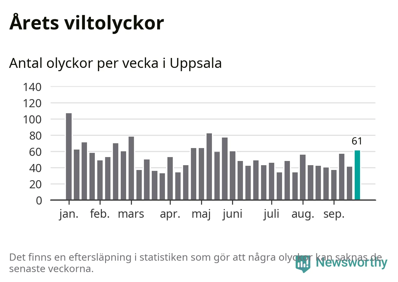 Hittills har 61 viltolyckor rapporterats in i Uppsala län från vecka 39. Se listan här.