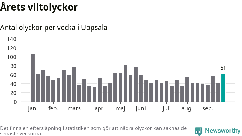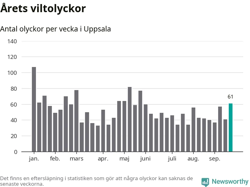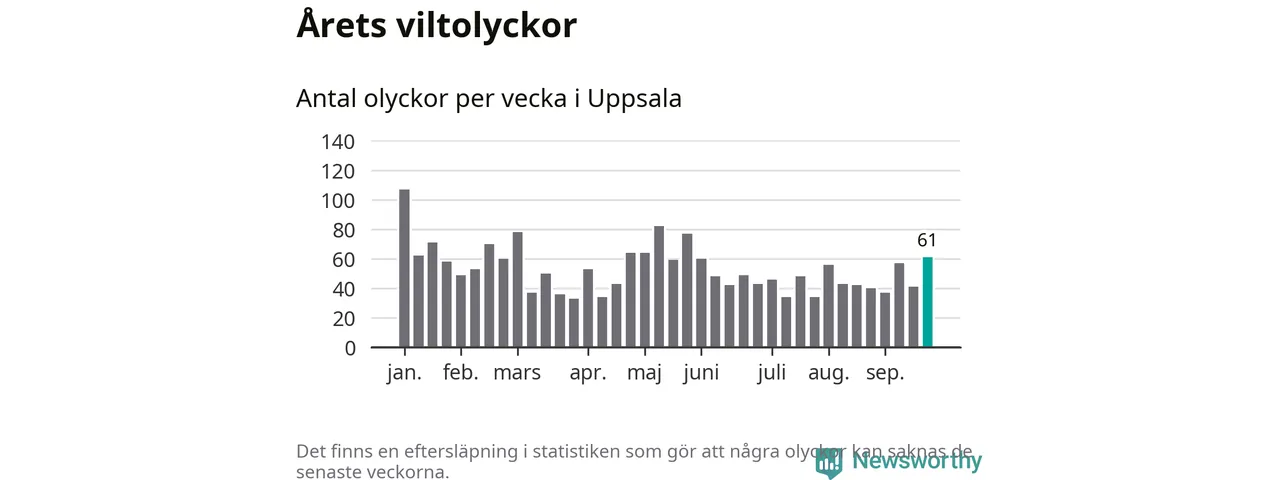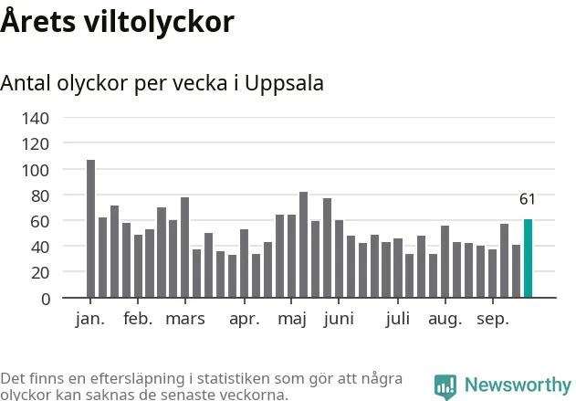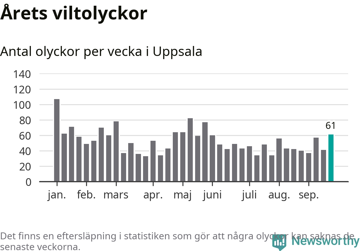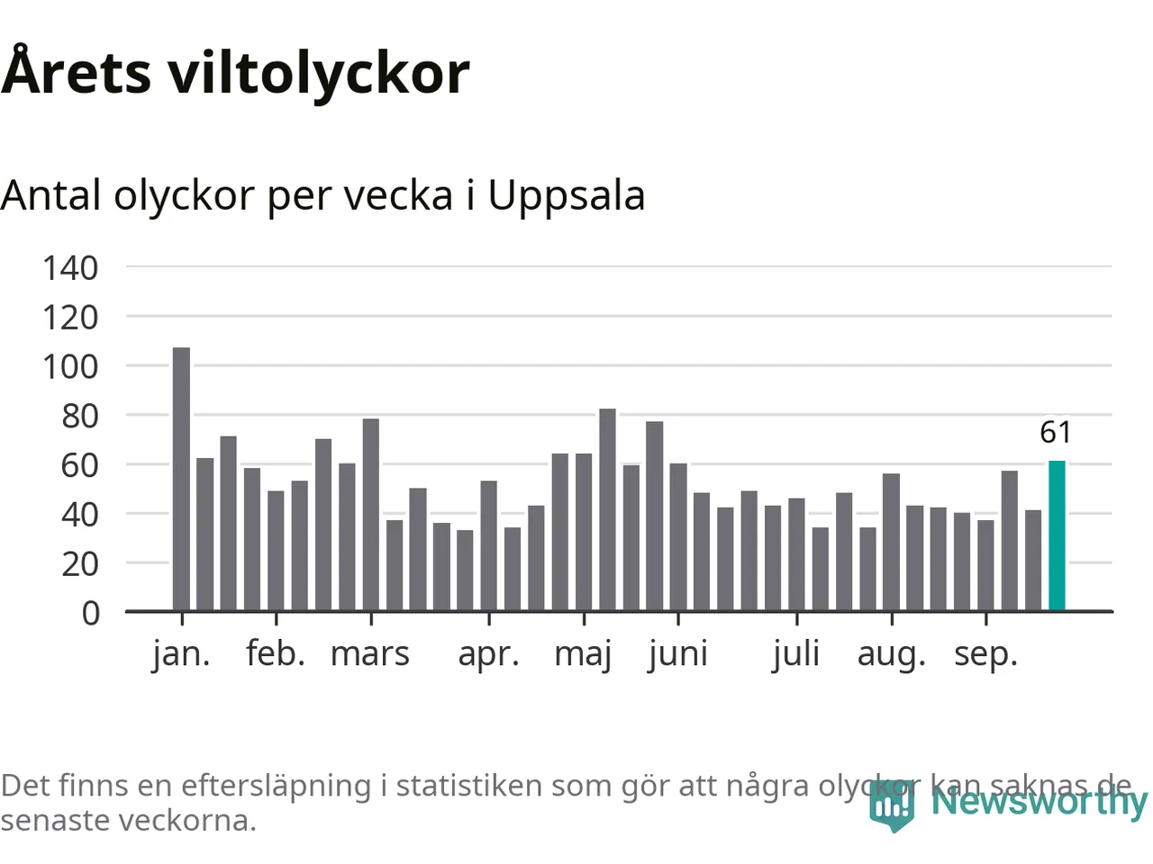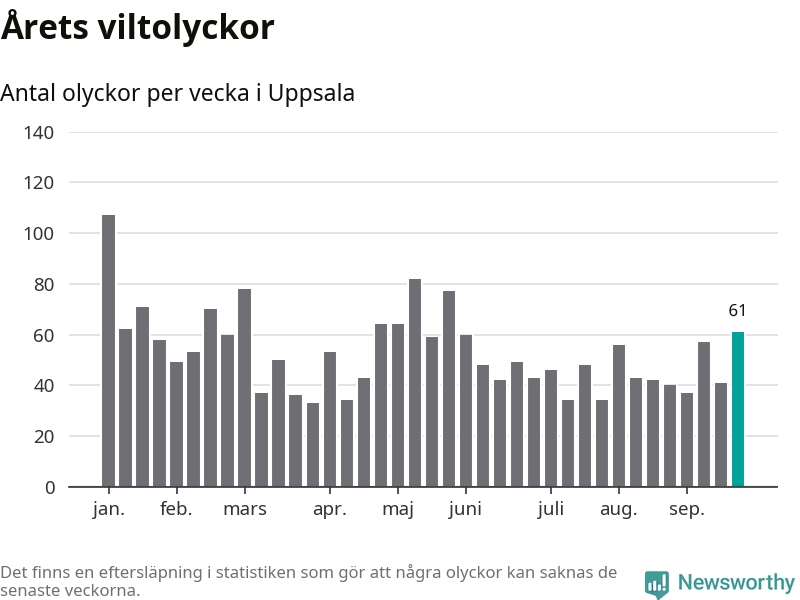 Hittills har 61 viltolyckor rapporterats in i Uppsala län från vecka 39. Se listan här.