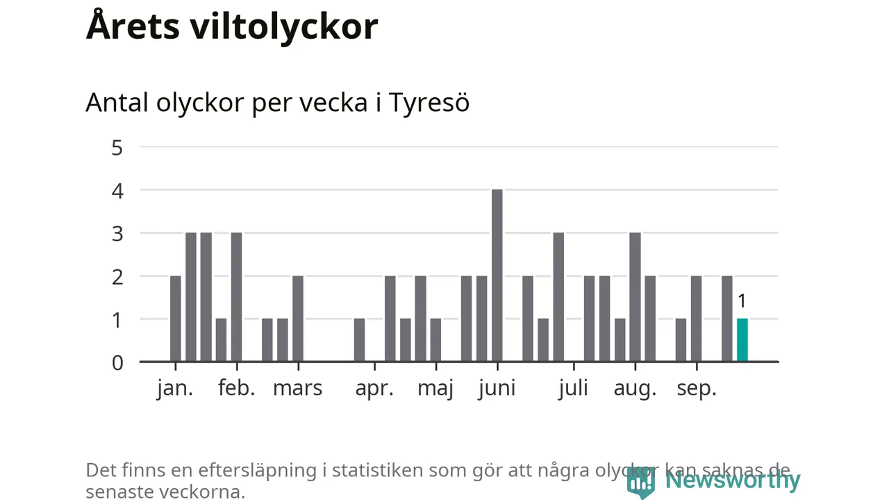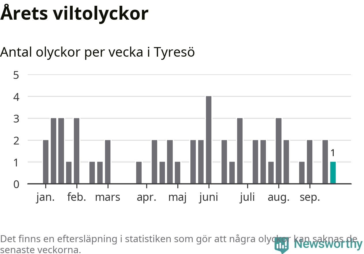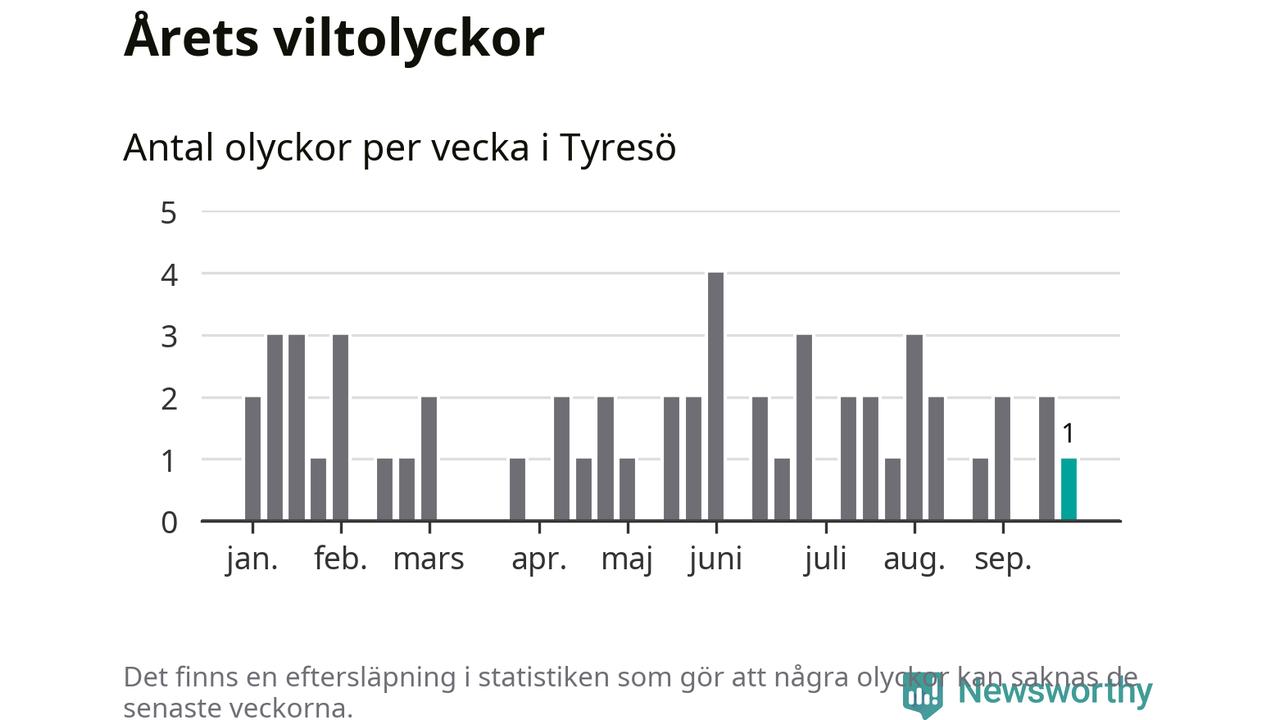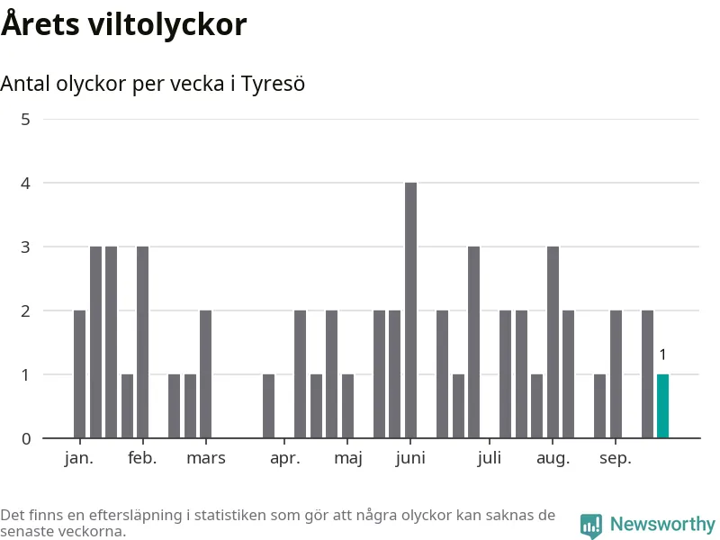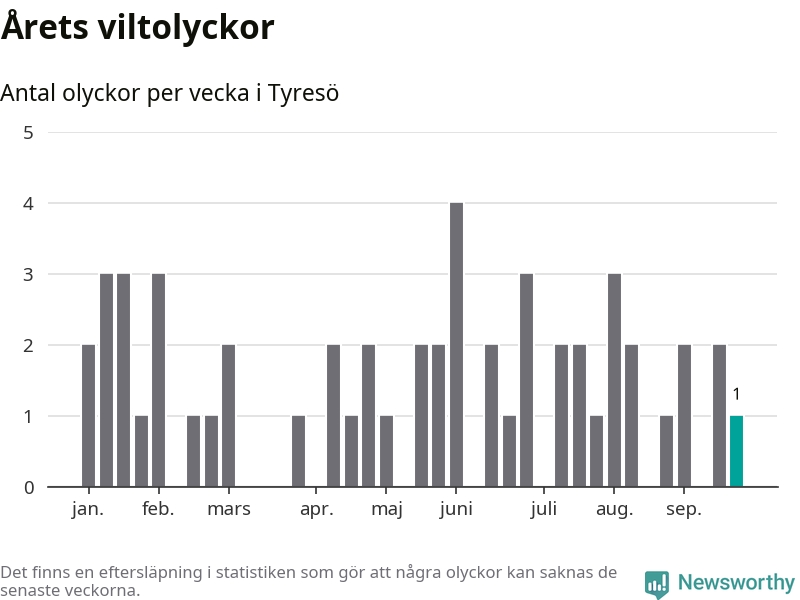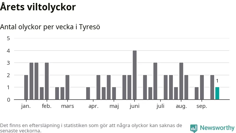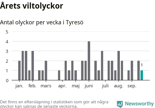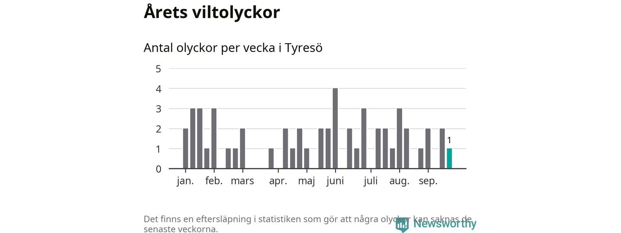 Från förra veckan (vecka 39) har hittills en viltolycka rapporterats in i Tyresö kommun.