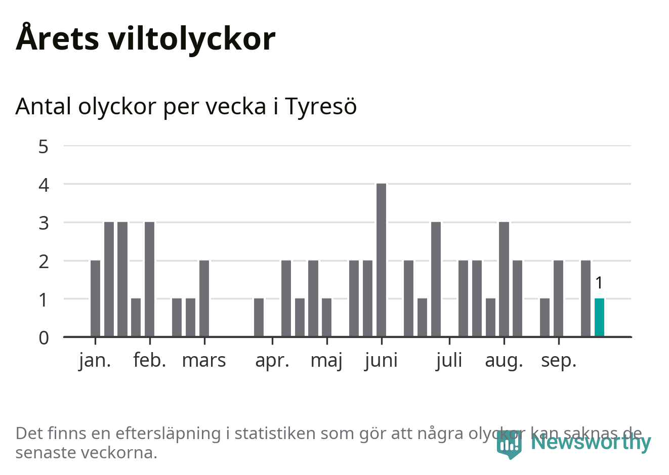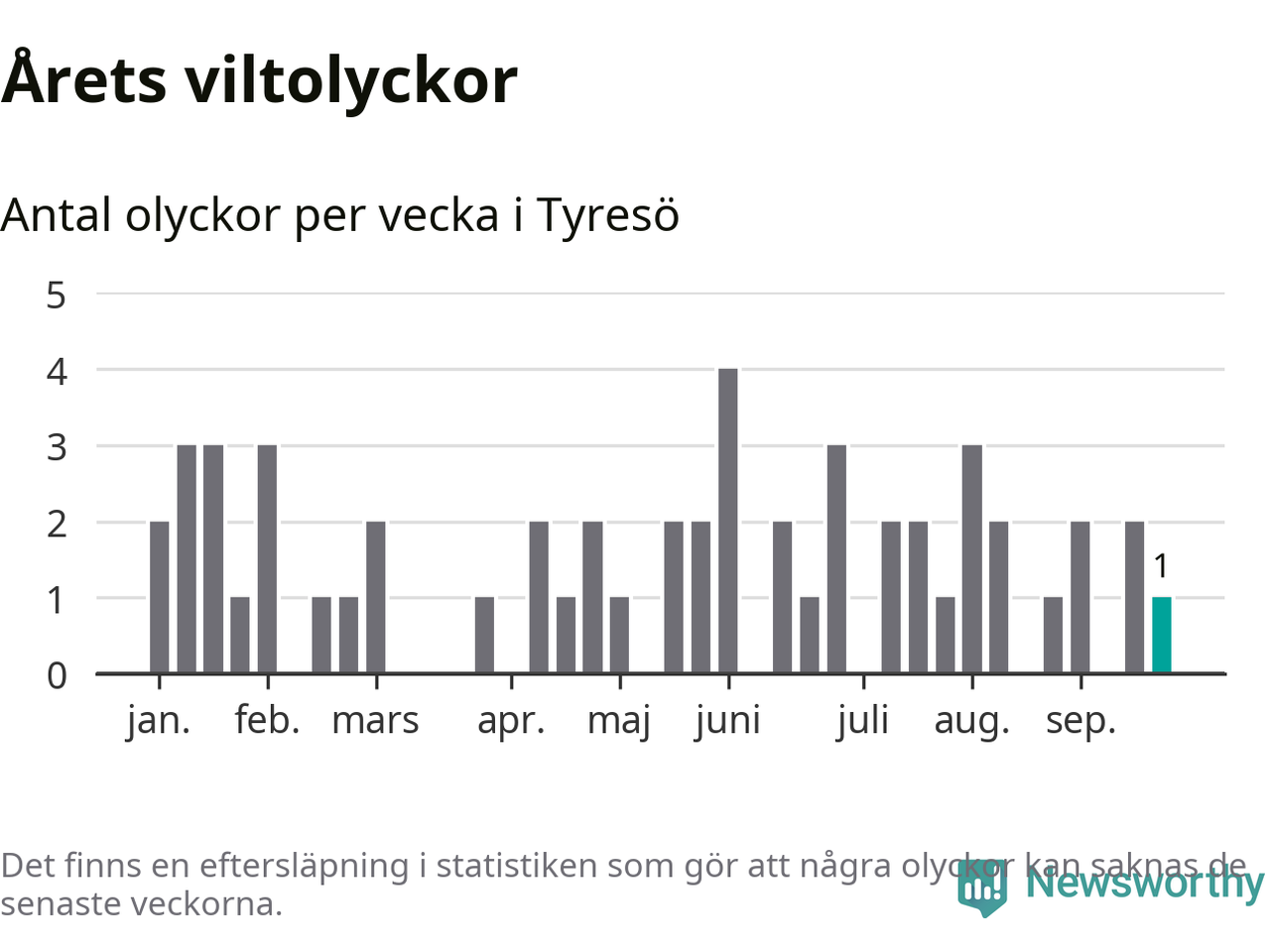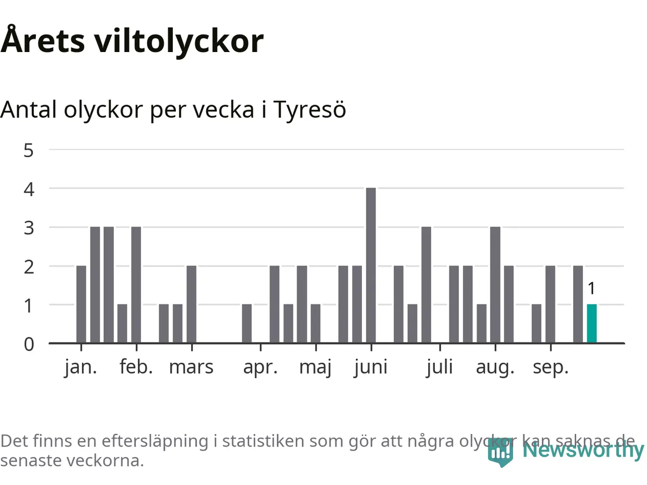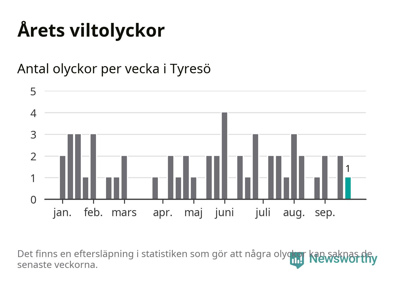 Från förra veckan (vecka 39) har hittills en viltolycka rapporterats in i Tyresö kommun.