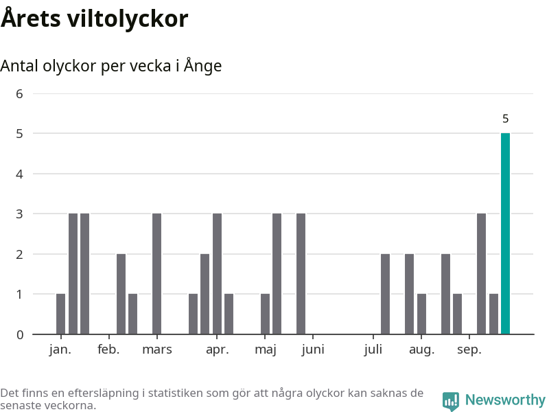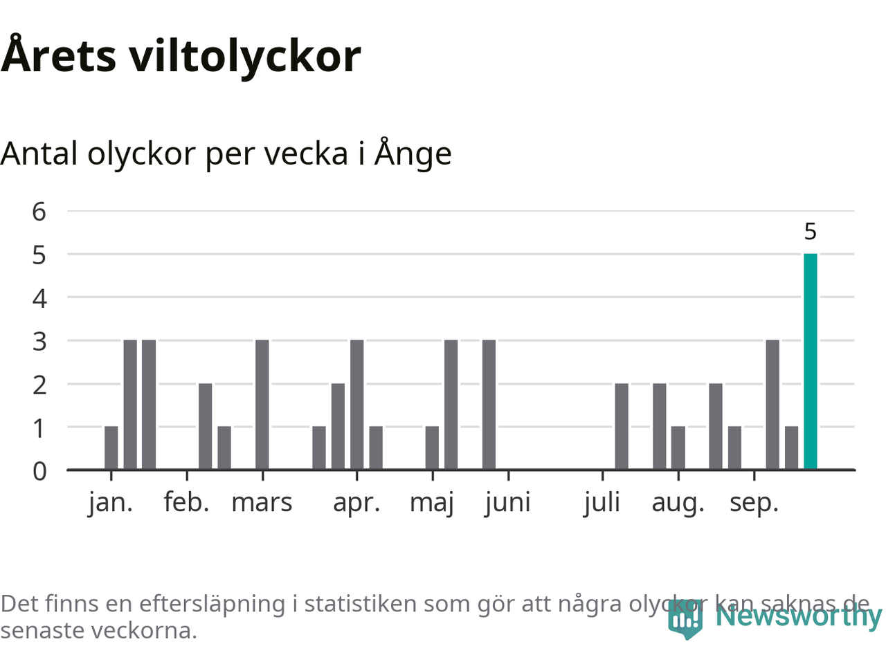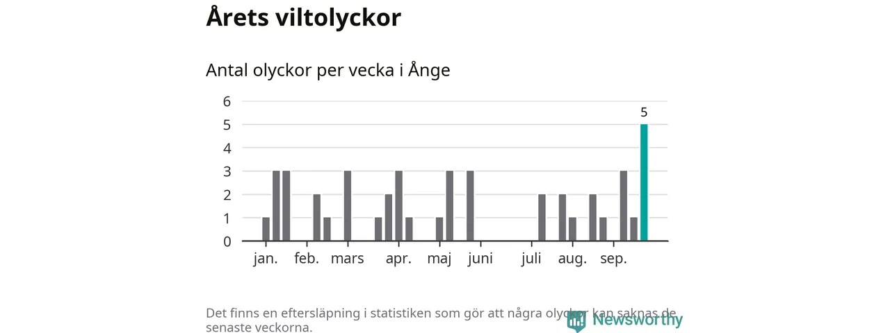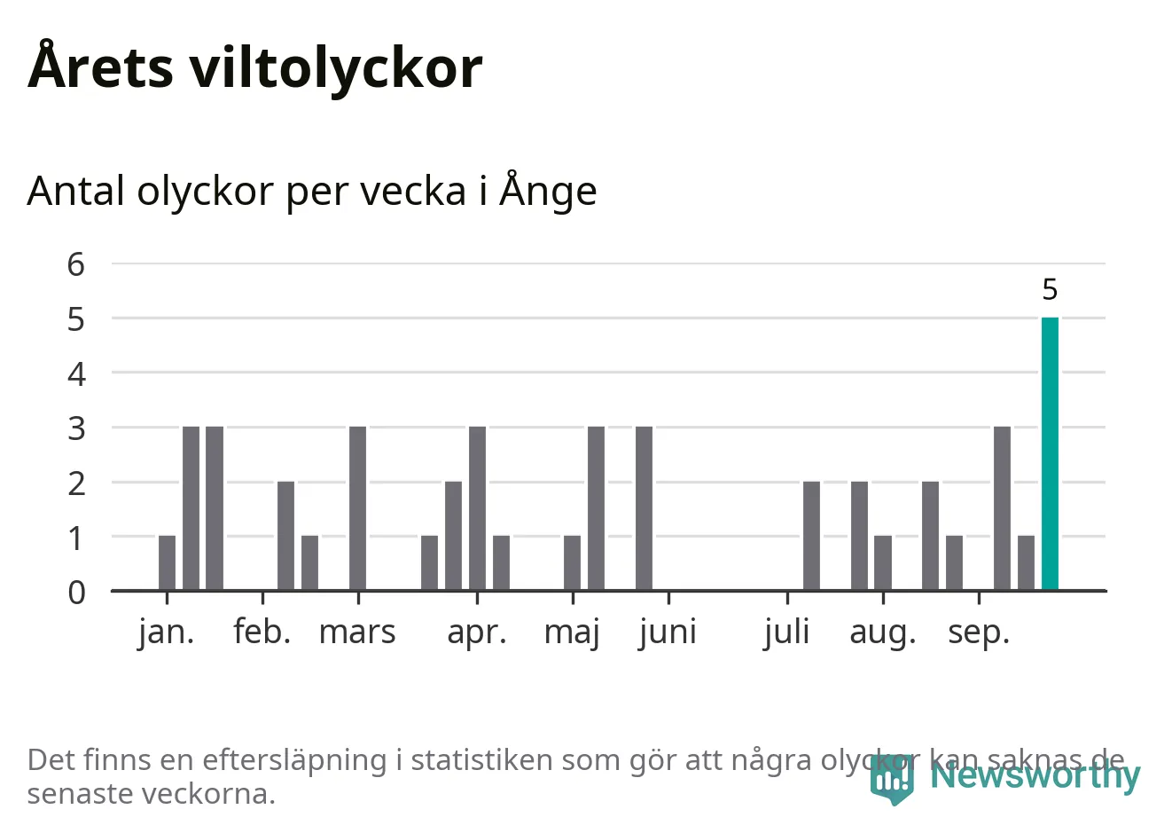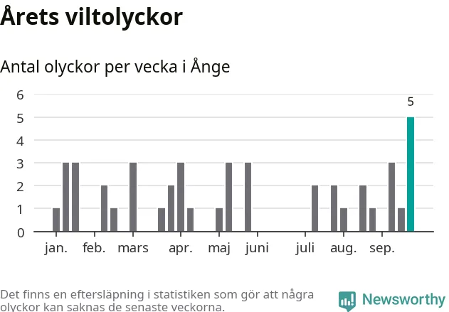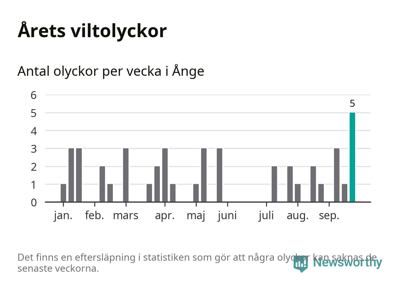 Under vecka 39 rapporterades fem viltolyckor in i Ånge kommun. Det är det största antalet på en enskild vecka hittills i år.