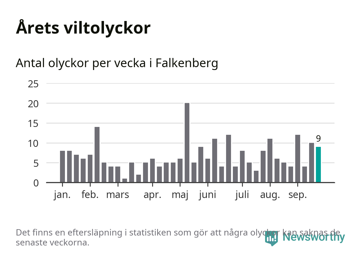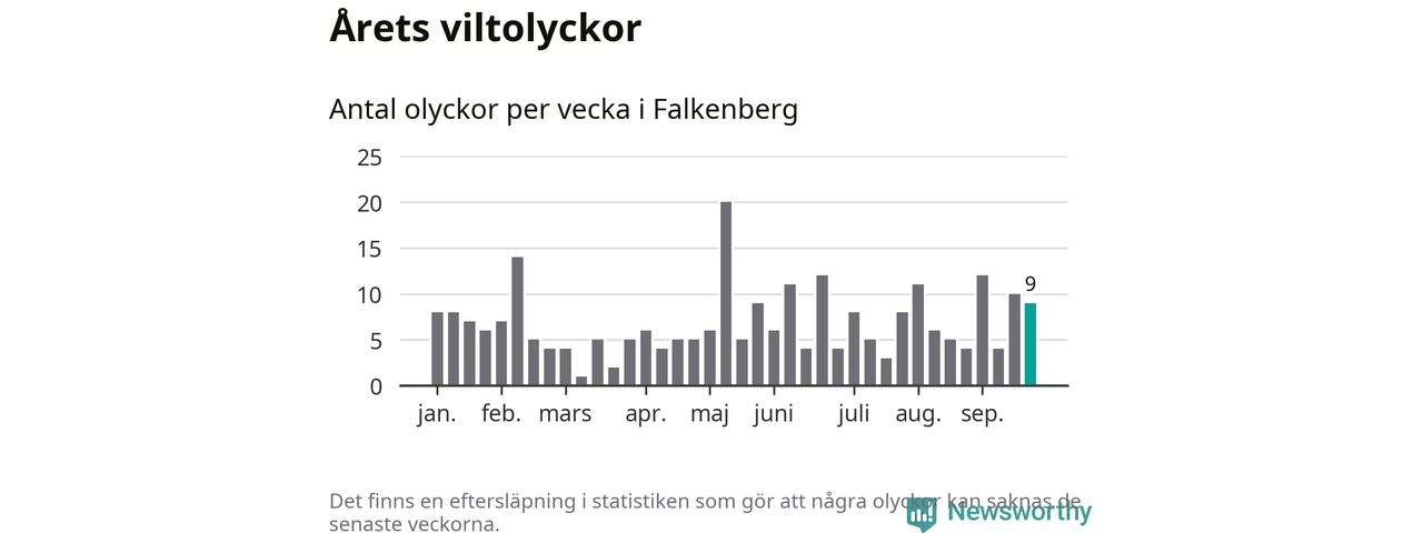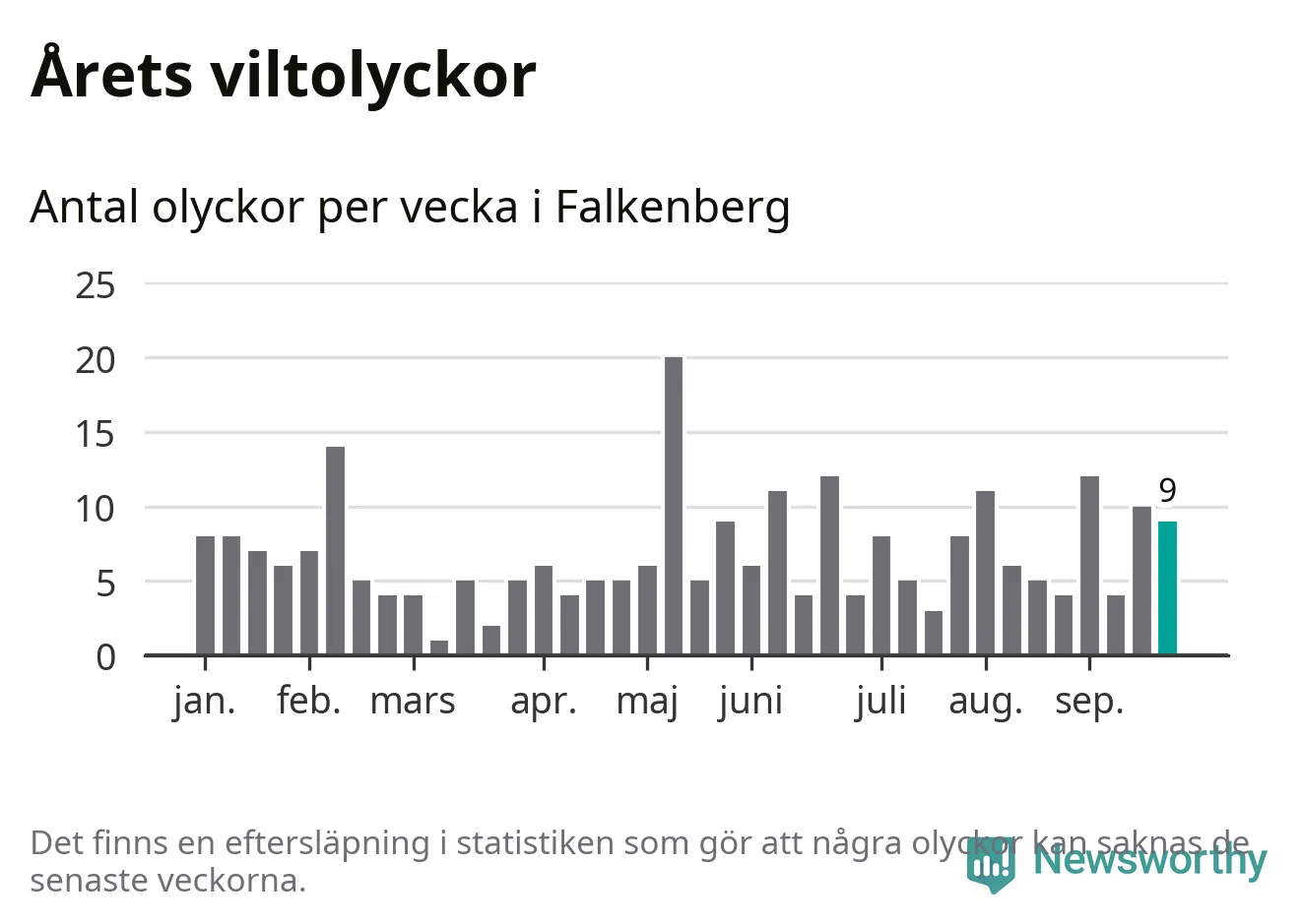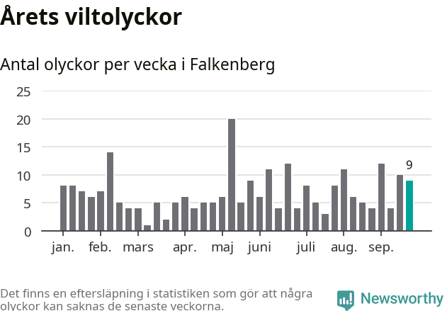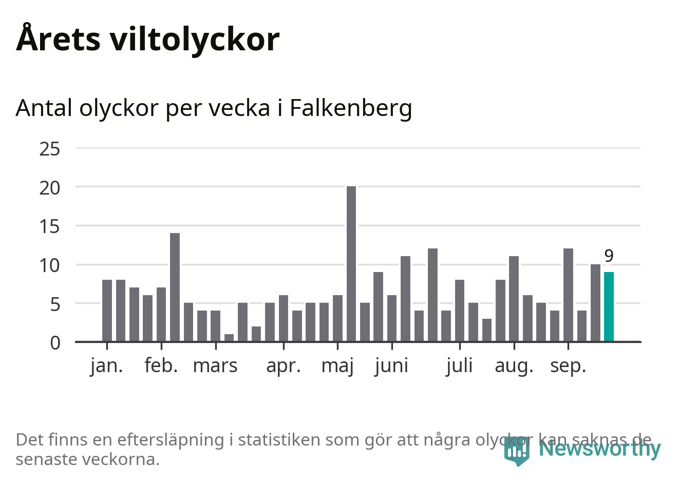 Hittills har nio viltolyckor rapporterats in i Falkenbergs kommun från vecka 39. Se listan här.