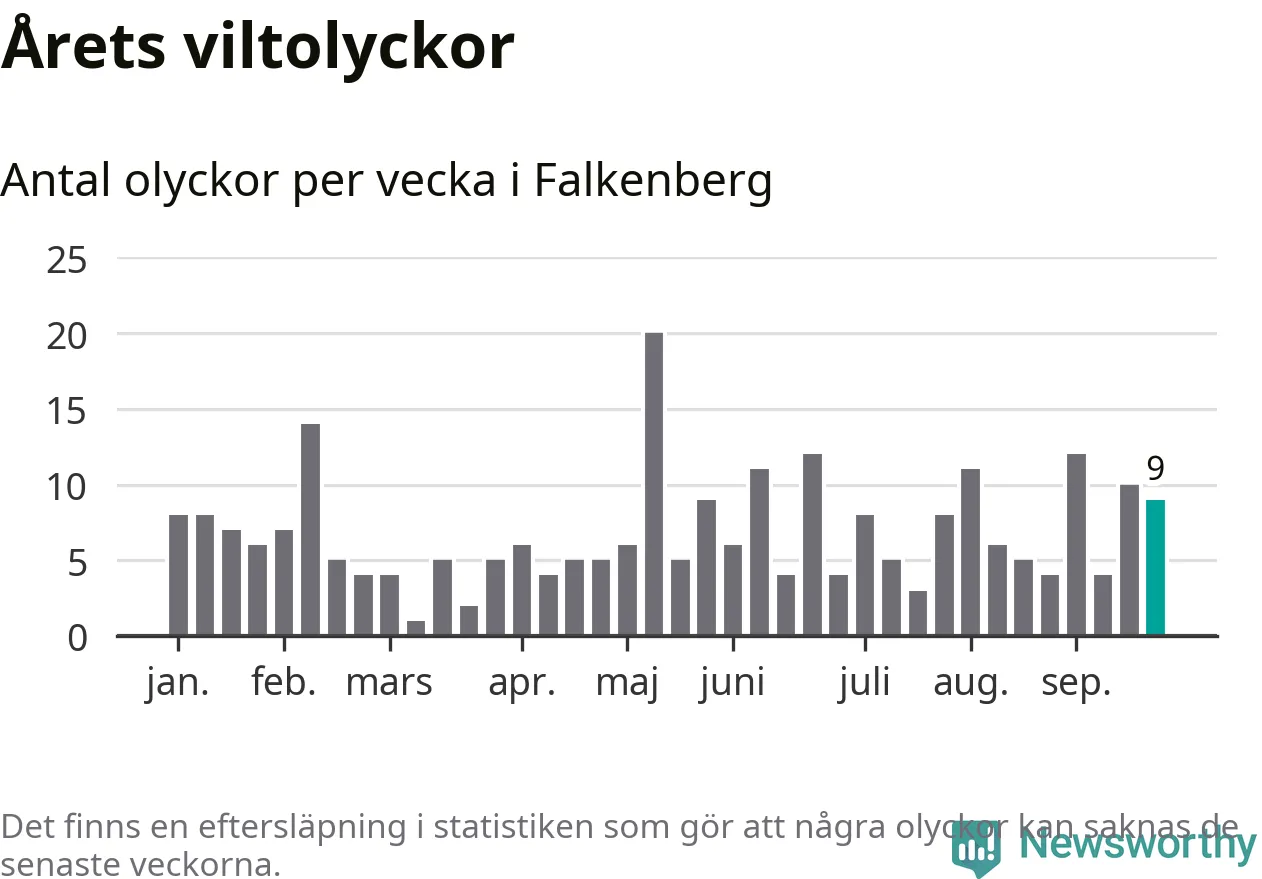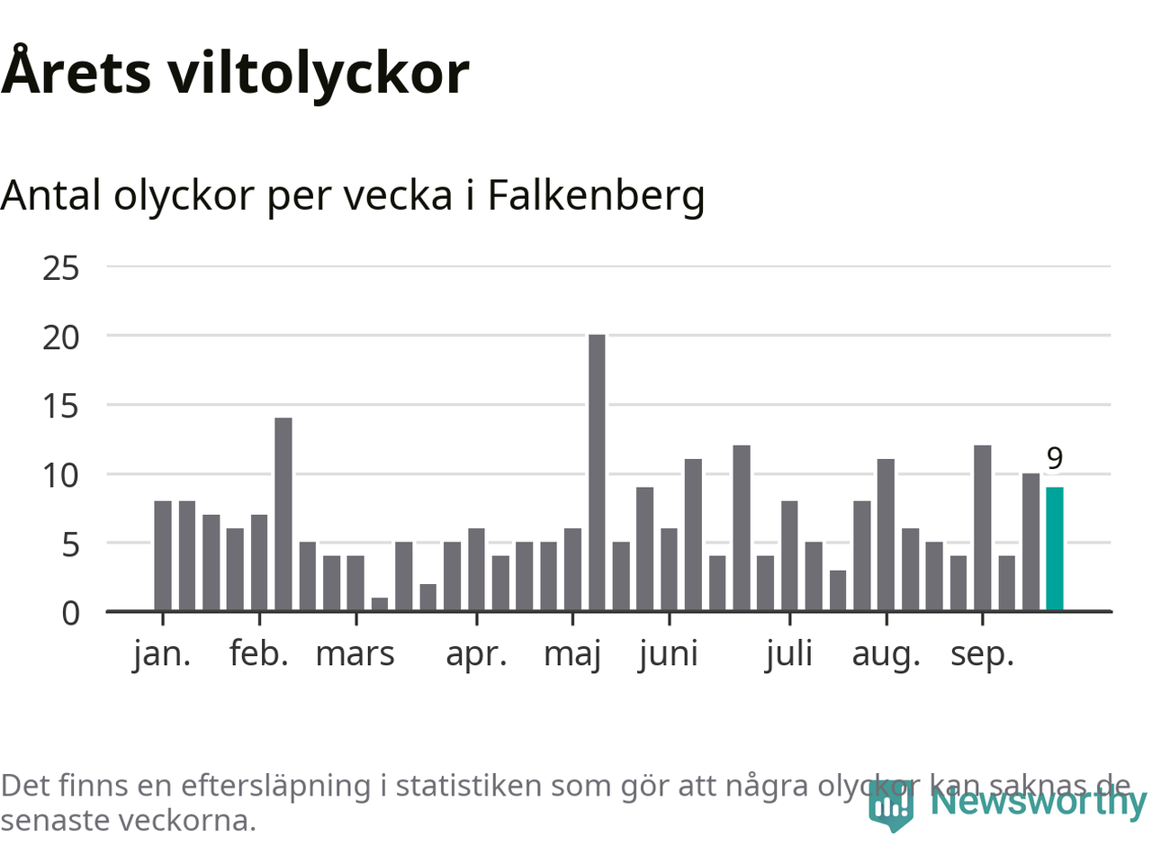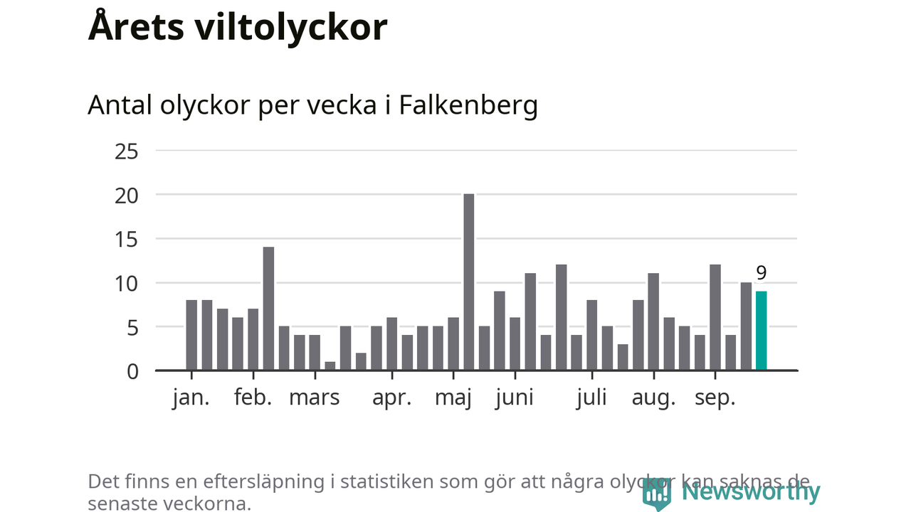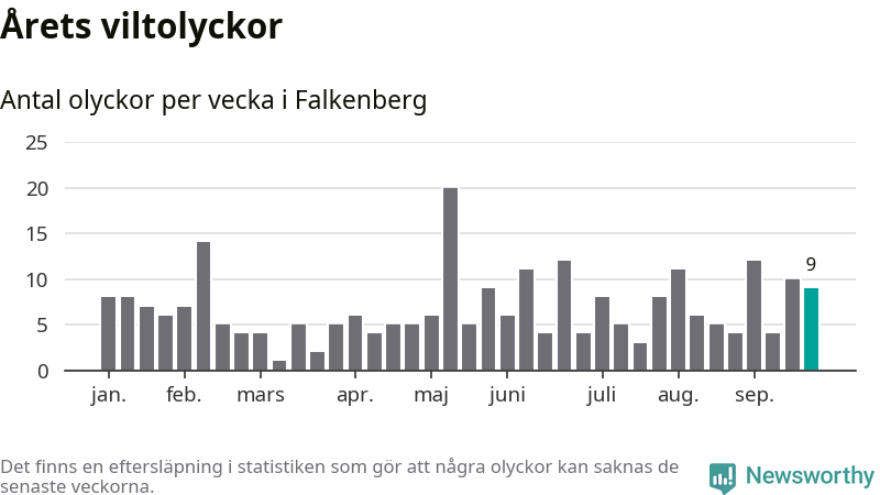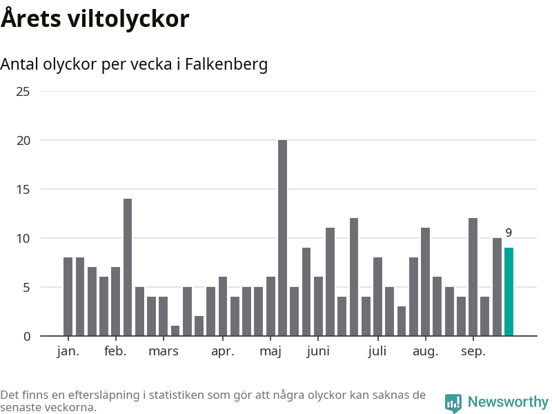 Hittills har nio viltolyckor rapporterats in i Falkenbergs kommun från vecka 39. Se listan här.
